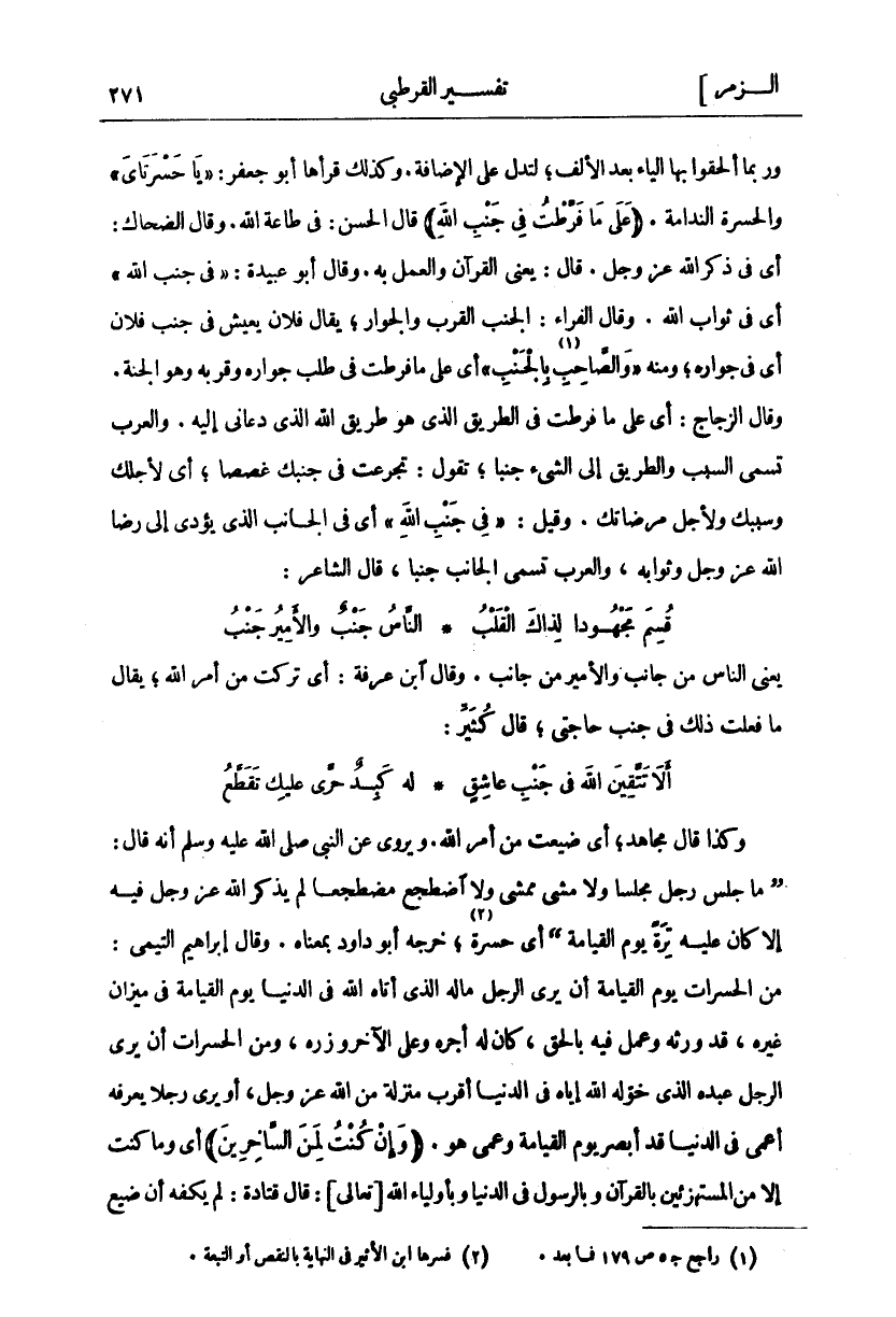 وَرُبَّمَا أَلْحَقُوا بِهَا الْيَاءَ بَعْدَ الْأَلِفِ، لِتَدُلَّ عَلَى الْإِضَافَةِ، وَكَذَلِكَ قَرَأَهَا أَبُو جَعْفَرٍ: يَا حَسْرَتَايَ وَالْحَسْرَةُ النَّدَامَةُ. (عَلى مَا فَرَّطْتُ فِي جَنْبِ اللَّهِ) قَالَ الْحَسَنُ: فِي طَاعَةِ اللَّهِ. وَقَالَ الضَّحَّاكُ: أَيْ فِي ذِكْرِ اللَّهِ عَزَّ وَجَلَّ. قَالَ: يَعْنِي الْقُرْآنَ وَالْعَمَلَ بِهِ. وَقَالَ أَبُو عُبَيْدَةَ: فِي جَنْبِ اللَّهِ أَيْ فِي ثَوَابِ اللَّهِ. وَقَالَ الْفَرَّاءُ: الْجَنْبُ الْقُرْبُ وَالْجِوَارُ: يُقَالُ فُلَانُ يَعِيشُ فِي جَنْبِ فُلَانٍ أَيْ في جواره ومنه" وَالصَّاحِبِ بِالْجَنْبِ" أي على مَا فَرَّطْتُ فِي طَلَبِ جِوَارِهِ وَقُرْبِهِ وَهُوَ الْجَنَّةُ وَقَالَ الزَّجَّاجُ: أَيْ عَلَى مَا فَرَّطْتُ فِي الطَّرِيقِ الَّذِي هُوَ طَرِيقُ اللَّهِ الَّذِي دَعَانِي إِلَيْهِ، وَالْعَرَبُ تُسَمِّي السَّبَبَ وَالطَّرِيقَ إِلَى الشَّيْءِ جَنْبًا، تَقُولُ تَجَرَّعْتُ فِي جَنْبِكَ غُصَصًا، أَيْ لِأَجْلِكَ وَسَبَبِكَ وَلِأَجْلِ مَرْضَاتِكَ. وَقِيلَ:" فِي جَنْبِ اللَّهِ" أَيْ فِي الْجَانِبِ الَّذِي يُؤَدِّي إِلَى رِضَا اللَّهِ عَزَّ وَجَلَّ وَثَوَابِهِ، وَالْعَرَبُ تُسَمِّي الْجَانِبَ جَنْبًا، قَالَ الشَّاعِرَ: