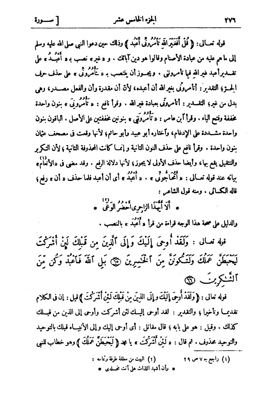 قَوْلُهُ تَعَالَى: قُلْ أَفَغَيْرَ اللَّهِ تَأْمُرُونِّي أَعْبُدُ (وَذَلِكَ حِينَ دَعَوُا النَّبِيَّ صَلَّى اللَّهُ عَلَيْهِ وَسَلَّمَ إِلَى مَا هُمْ عَلَيْهِ مِنْ عِبَادَةِ الْأَصْنَامِ وَقَالُوا هُوَ دِينُ آبَائِكَ، وَ" غَيْرَ" نصب ب" أعبده" عَلَى تَقْدِيرِ أَعْبُدُ غَيْرَ اللَّهِ فِيمَا تَأْمُرُونَنِي، وَيَجُوزُ أَنْ يَنْتَصِبَ بِ" تَأْمُرُونِّي" عَلَى حَذْفِ حرف الجز، التقدير: أتأمروني بغير الله أن أعبد، لِأَنَّ أَنْ مُقَدَّرَةٌ وَأَنْ وَالْفِعْلُ مَصْدَرٌ، وَهِيَ بدل من غير، التقدير: أتأمروني بِعِبَادَةِ غَيْرِ اللَّهِ، وَقَرَأَ نَافِعٌ" تَأْمُرُونِّي" بِنُونٍ وَاحِدَةٍ مُخَفَّفَةٍ وَفَتْحِ الْيَاءِ، وَقَرَأَ ابْنُ عَامِرٍ" تَأْمُرُونَنِي، بِنُونَيْنِ مُخَفَّفَتَيْنِ عَلَى الْأَصْلِ. الْبَاقُونَ بِنُونٍ وَاحِدَةٍ مُشَدَّدَةٍ عَلَى الْإِدْغَامِ، وَاخْتَارَهُ أَبُو عُبَيْدٍ وَأَبُو حَاتِمٍ، لِأَنَّهَا وَقَعَتْ فِي مُصْحَفِ عُثْمَانَ بِنُونٍ وَاحِدَةٍ، وَقَرَأَ نَافِعٌ عَلَى حَذْفِ النُّونِ الثَّانِيَةِ وَإِنَّمَا كَانَتِ الْمَحْذُوفَةُ الثَّانِيَةَ، لِأَنَّ التَّكْرِيرَ وَالتَّثْقِيلَ يَقَعُ بِهَا، وَأَيْضًا حَذْفُ الْأُولَى لَا يَجُوزُ، لِأَنَّهَا دَلَالَةُ الرَّفْعِ، وَقَدْ مَضَى فِي" الْأَنْعَامِ" «١» بَيَانُهُ عِنْدَ قَوْلِهِ تَعَالَى:" أَتُحاجُّونِّي"." أَعْبُدُ" أَيْ أَنْ أَعْبُدَ فَلَمَّا حَذَفَ" أَنْ" رَفَعَ، قَالَهُ الْكِسَائِيُّ، وَمِنْهُ قَوْلُ الشَّاعِرِ: