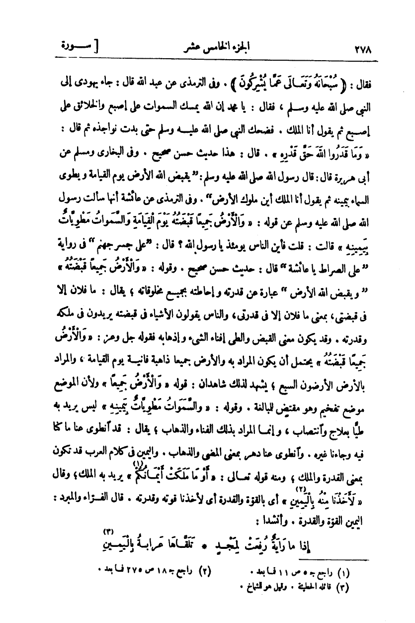 فَقَالَ: (سُبْحانَهُ وَتَعالى عَمَّا يُشْرِكُونَ). وَفِي التِّرْمِذِيِّ عَنْ عَبْدِ اللَّهِ قَالَ: جَاءَ يَهُودِيٌّ إِلَى النَّبِيِّ صَلَّى اللَّهُ عَلَيْهِ وَسَلَّمَ، فَقَالَ: يا محمد إن الله يمسك السموات عَلَى إِصْبَعٍ وَالْخَلَائِقَ عَلَى إِصْبَعٍ ثُمَّ يَقُولُ أَنَا الْمَلِكُ، فَضَحِكَ النَّبِيُّ صَلَّى اللَّهُ عَلَيْهِ وَسَلَّمَ حَتَّى بَدَتْ نَوَاجِذُهُ ثُمَّ قَالَ:" وَما قَدَرُوا اللَّهَ حَقَّ قَدْرِهِ". قَالَ: هَذَا حَدِيثٌ حَسَنٌ صَحِيحٌ. وَفِي الْبُخَارِيِّ وَمُسْلِمٌ عَنْ أَبِي هُرَيْرَةَ قَالَ قَالَ رَسُولُ اللَّهِ صَلَّى اللَّهُ عَلَيْهِ وَسَلَّمَ:" يَقْبِضُ اللَّهُ الْأَرْضَ يَوْمَ الْقِيَامَةِ وَيَطْوِي السَّمَاءَ بِيَمِينِهِ ثُمَّ يَقُولُ أَنَا الْمَلِكُ أَيْنَ مُلُوكُ الْأَرْضِ". وَفِي التِّرْمِذِيِّ عَنْ عَائِشَةَ أَنَّهَا سَأَلَتْ رَسُولَ اللَّهِ صَلَّى اللَّهُ عَلَيْهِ وَسَلَّمَ عَنْ قَوْلِهِ:" وَالْأَرْضُ جَمِيعاً قَبْضَتُهُ يَوْمَ الْقِيامَةِ وَالسَّماواتُ مَطْوِيَّاتٌ بِيَمِينِهِ" قَالَتْ: قُلْتُ فَأَيْنَ النَّاسُ يَوْمَئِذٍ يَا رَسُولَ اللَّهِ؟ قَالَ:" عَلَى جِسْرِ جَهَنَّمَ" فِي رِوَايَةٍ" عَلَى الصِّرَاطِ يَا عَائِشَةُ" قَالَ: حَدِيثٌ حَسَنٌ صَحِيحٌ، وَقَوْلُهُ:" وَالْأَرْضُ جَمِيعاً قَبْضَتُهُ" وَيَقْبِضُ اللَّهُ الْأَرْضَ" عِبَارَةٌ عَنْ قُدْرَتِهِ وَإِحَاطَتِهِ بِجَمِيعِ مَخْلُوقَاتِهِ، يُقَالُ مَا فُلَانٌ إِلَّا فِي قَبْضَتِي، بِمَعْنَى مَا فُلَانٌ إِلَّا فِي قُدْرَتِي، وَالنَّاسُ يَقُولُونَ الْأَشْيَاءُ فِي قَبْضَتِهِ يُرِيدُونَ فِي مِلْكِهِ وَقُدْرَتِهِ، وَقَدْ يَكُونُ مَعْنَى الْقَبْضُ وَالطَّيُّ إِفْنَاءُ الشَّيْءِ وَإِذْهَابُهُ فَقَوْلُهُ جَلَّ وَعَزَّ:" وَالْأَرْضُ جَمِيعاً قَبْضَتُهُ" يَحْتَمِلُ أَنْ يَكُونَ الْمُرَادُ بِهِ وَالْأَرْضُ جَمِيعًا ذَاهِبَةٌ فَانِيَةٌ يَوْمَ الْقِيَامَةِ، وَالْمُرَادُ بِالْأَرْضِ الْأَرَضُونَ السَّبْعُ، يَشْهَدُ لِذَلِكَ شَاهِدَانِ قَوْلُهُ:" وَالْأَرْضُ جَمِيعاً" وَلِأَنَّ الْمَوْضِعَ مَوْضِعَ تَفْخِيمٍ وَهُوَ مُقْتَضٍ لِلْمُبَالَغَةِ، وَقَوْلُهُ:" وَالسَّماواتُ مَطْوِيَّاتٌ بِيَمِينِهِ" لَيْسَ يُرِيدُ بِهِ طَيًّا بِعِلَاجٍ وَانْتِصَابٍ، وَإِنَّمَا الْمُرَادُ بِذَلِكَ الْفَنَاءُ وَالذَّهَابُ، يُقَالُ: قَدِ انْطَوَى عَنَّا مَا كُنَّا فِيهِ وَجَاءَنَا غَيْرُهُ، وَانْطَوَى عَنَّا دَهْرٌ بِمَعْنَى الْمُضِيِّ وَالذَّهَابِ، وَالْيَمِينُ في كلام العرب قد تون بِمَعْنَى الْقُدْرَةِ وَالْمِلْكِ، وَمِنْهُ قَوْلُهُ تَعَالَى:" أَوْ مَا مَلَكَتْ أَيْمانُكُمْ" يُرِيدُ بن الْمِلْكَ، وَقَالَ:" لَأَخَذْنا مِنْهُ بِالْيَمِينِ" أَيْ بِالْقُوَّةِ وَالْقُدْرَةِ أَيْ لَأَخَذْنَا قُوَّتَهُ وَقُدْرَتَهُ، قَالَ الْفَرَّاءُ والمبرد: اليمين القوة والقدرة، وأنشداء:
