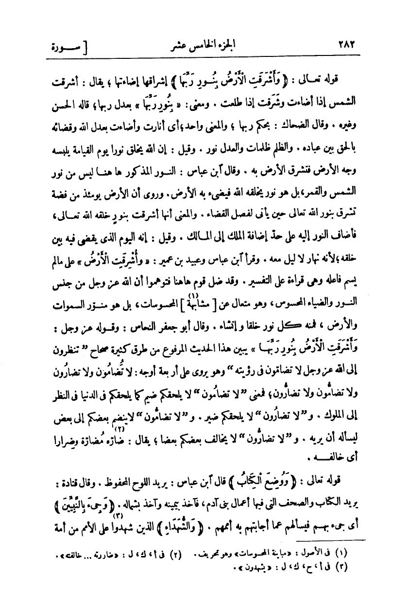 قَوْلُهُ تَعَالَى: (وَأَشْرَقَتِ الْأَرْضُ بِنُورِ رَبِّها) إِشْرَاقُهَا إِضَاءَتُهَا، يُقَالُ: أَشْرَقَتِ الشَّمْسُ إِذَا أَضَاءَتْ وَشَرَقَتْ إِذَا طَلَعَتْ. وَمَعْنَى" بِنُورِ رَبِّها" بِعَدْلِ رَبِّهَا، قَالَهُ الْحَسَنُ وَغَيْرُهُ، وَقَالَ الضَّحَّاكُ: بِحُكْمِ رَبِّهَا، وَالْمَعْنَى وَاحِدٌ: أَيْ أَنَارَتْ وَأَضَاءَتْ بِعَدْلِ اللَّهِ وَقَضَائِهِ بِالْحَقِّ بَيْنَ عِبَادِهِ. وَالظُّلْمُ ظُلُمَاتٌ وَالْعَدْلُ نُورٌ. وَقِيلَ: إِنَّ اللَّهَ يَخْلُقُ نُورًا يَوْمَ الْقِيَامَةِ يُلْبِسُهُ وَجْهَ الْأَرْضِ فَتُشْرِقُ الْأَرْضُ بِهِ، وَقَالَ ابْنُ عَبَّاسٍ: النُّورُ الْمَذْكُورُ هَاهُنَا لَيْسَ مِنْ نُورِ الشَّمْسِ وَالْقَمَرِ، بَلْ هُوَ نُورٌ يَخْلُقُهُ اللَّهُ فَيُضِيءُ بِهِ الْأَرْضَ، وَرُوِيَ أَنَّ الْأَرْضَ يَوْمَئِذٍ مِنْ فِضَّةٍ تُشْرِقُ بِنُورِ اللَّهِ تَعَالَى حِينَ يَأْتِي لِفَصْلِ الْقَضَاءِ. وَالْمَعْنَى أَنَّهَا أَشْرَقَتْ بِنُورٍ خَلَقَهُ اللَّهُ تَعَالَى، فَأَضَافَ النُّورَ إِلَيْهِ عَلَى حَدِّ إِضَافَةِ الْمِلْكِ إِلَى الْمَالِكِ. وَقِيلَ: إِنَّهُ الْيَوْمُ الَّذِي يَقْضِي فِيهِ بَيْنَ خَلْقِهِ، لِأَنَّهُ نَهَارٌ لَا لَيْلَ مَعَهُ. وَقَرَأَ ابْنُ عَبَّاسٍ وَعُبَيْدُ بْنُ عُمَيْرٍ" وَأَشْرَقَتِ الْأَرْضُ" عَلَى مَا لَمْ يُسَمَّ فَاعِلُهُ وَهِيَ قِرَاءَةٌ على التفسير، وقد ضل قوم هاهنا فتوهما أَنَّ اللَّهَ عَزَّ وَجَلَّ مِنْ جِنْسِ النُّورِ وَالضِّيَاءِ الْمَحْسُوسِ، وَهُوَ مُتَعَالٍ عَنْ (مُشَابَهَةِ) «١» الْمَحْسُوسَاتِ، بل هو منور السموات وَالْأَرْضِ، فَمِنْهُ كُلُّ نُورٍ خَلْقًا وَإِنْشَاءً. وَقَالَ أبو جعفر النحاس: وقوله عز وجل: وَقَالَ أَبُو جَعْفَرٍ النَّحَّاسُ: وَقَوْلُهُ عَزَّ وَجَلَّ:" وَأَشْرَقَتِ الْأَرْضُ بِنُورِ رَبِّها" يُبَيِّنُ هَذَا الْحَدِيثَ الْمَرْفُوعَ مِنْ طُرُقٍ كَثِيرَةٍ صِحَاحٍ" تَنْظُرُونَ إِلَى الله عز وجل لا تضامون في رؤيت" وَهُوَ يُرْوَى عَلَى أَرْبَعَةِ أَوْجُهٍ: لَا تُضَامُونَ وَلَا تُضَارُونَ وَلَا تُضَامُّونَ وَلَا تُضَارُّونَ، فَمَعْنَى" لَا تُضَامُونَ" لَا يَلْحَقُكُمْ ضَيْمٌ كَمَا يَلْحَقُكُمْ فِي الدُّنْيَا فِي النَّظَرِ إِلَى الْمُلُوكِ. وَ" لَا تُضَارُونَ" لَا يَلْحَقُكُمْ ضَيْرٌ. وَ" لَا تُضَامُّونَ" لَا يَنْضَمُّ بَعْضُكُمْ إِلَى بَعْضٍ لِيَسْأَلَهُ أَنْ يُرِيَهُ. وَ (لَا تُضَارُّونَ) لَا يُخَالِفُ بَعْضُكُمْ بَعْضًا. يُقَالُ: ضَارَّهُ مُضَارَّةً وَضِرَارًا أَيْ خالفه." قوله تعالى:" وَوُضِعَ الْكِتابُ" قال لابن عَبَّاسٍ: يُرِيدُ اللَّوْحَ الْمَحْفُوظَ. وَقَالَ قَتَادَةُ: يُرِيدُ الْكِتَابَ وَالصُّحُفَ الَّتِي فِيهَا أَعْمَالُ بَنِي آدَمَ، فآخذ بيمينه وآخذ بشماله." وَجِيءَ بِالنَّبِيِّينَ" أي جئ بِهِمْ فَسَأَلَهُمْ عَمَّا أَجَابَتْهُمْ بِهِ أُمَمُهُمْ." وَالشُّهَداءِ" الذين شهدوا على الأمم من أمة
