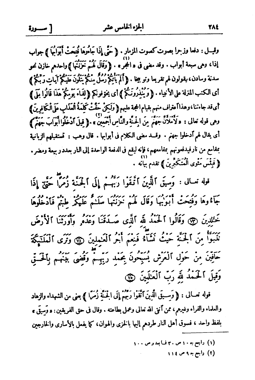 وَسِيقَ الَّذِينَ اتَّقَوْا رَبَّهُمْ إِلَى الْجَنَّةِ زُمَراً حَتَّى إِذا جاؤُها وَفُتِحَتْ أَبْوابُها وَقالَ لَهُمْ خَزَنَتُها سَلامٌ عَلَيْكُمْ طِبْتُمْ فَادْخُلُوها خالِدِينَ (٧٣) وَقالُوا الْحَمْدُ لِلَّهِ الَّذِي صَدَقَنا وَعْدَهُ وَأَوْرَثَنَا الْأَرْضَ نَتَبَوَّأُ مِنَ الْجَنَّةِ حَيْثُ نَشاءُ فَنِعْمَ أَجْرُ الْعامِلِينَ (٧٤) وَتَرَى الْمَلائِكَةَ حَافِّينَ مِنْ حَوْلِ الْعَرْشِ يُسَبِّحُونَ بِحَمْدِ رَبِّهِمْ وَقُضِيَ بَيْنَهُمْ بِالْحَقِّ وَقِيلَ الْحَمْدُ لِلَّهِ رَبِّ الْعالَمِينَ (٧٥)