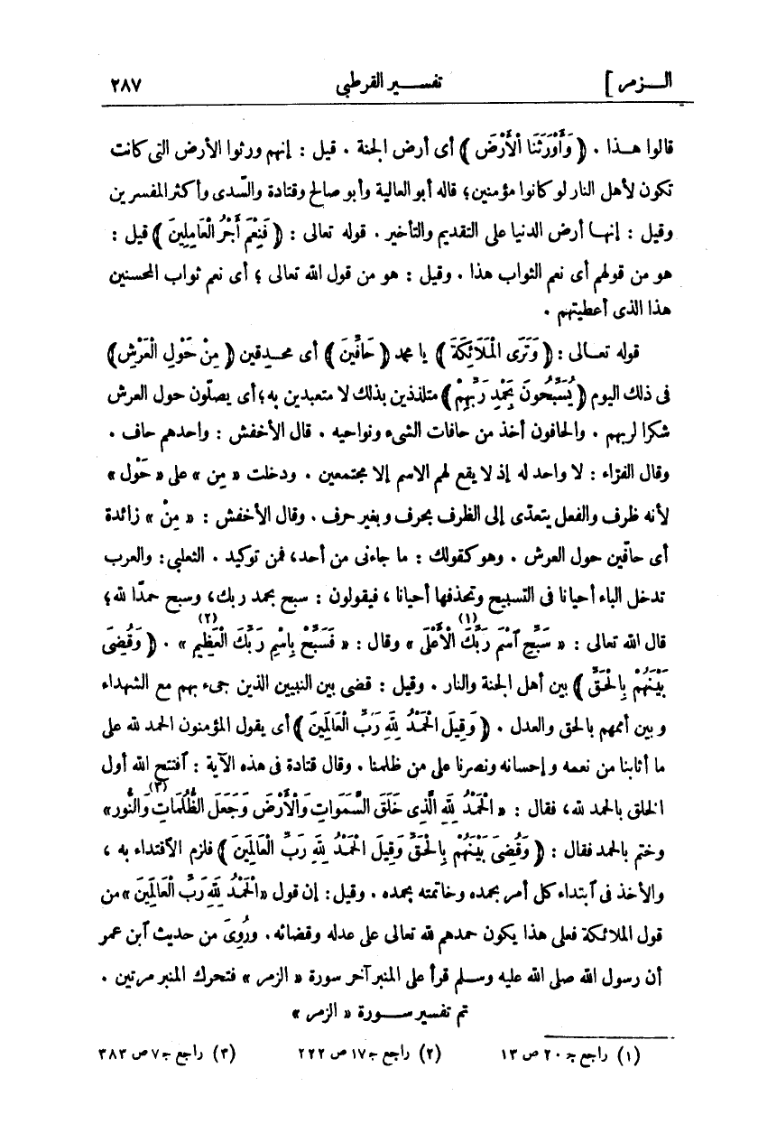 قالوا هذا." وَأَوْرَثَنَا الْأَرْضَ" أَيْ أَرْضُ الْجَنَّةِ قِيلَ: إِنَّهُمْ وَرِثُوا الْأَرْضَ الَّتِي كَانَتْ تَكُونُ لِأَهْلِ النَّارِ لَوْ كَانُوا مُؤْمِنِينَ، قَالَهُ أَبُو الْعَالِيَةِ وَأَبُو صَالِحٍ وَقَتَادَةُ وَالسُّدِّيُّ وَأَكْثَرُ الْمُفَسِّرِينَ وَقِيلَ: إِنَّهَا أَرْضُ الدُّنْيَا عَلَى التَّقْدِيمِ وَالتَّأْخِيرِ." فَنِعْمَ أَجْرُ الْعامِلِينَ" قِيلَ: هُوَ مِنْ قَوْلِهِمْ أَيْ نِعْمَ الثَّوَابُ هَذَا. وَقِيلَ: هُوَ مِنْ قَوْلِ اللَّهِ تَعَالَى، أَيْ نِعْمَ ثَوَابُ الْمُحْسِنِينَ هَذَا الَّذِي أَعْطَيْتُهُمْ. قَوْلُهُ تَعَالَى:" وَتَرَى الْمَلائِكَةَ" يَا مُحَمَّدُ" حَافِّينَ" أَيْ مُحْدِقِينَ" مِنْ حَوْلِ الْعَرْشِ" فِي ذَلِكَ الْيَوْمِ" يُسَبِّحُونَ بِحَمْدِ رَبِّهِمْ" مُتَلَذِّذِينَ بِذَلِكَ لَا مُتَعَبِّدِينَ بِهِ أَيْ يُصَلُّونَ حَوْلَ الْعَرْشِ شُكْرًا لِرَبِّهِمْ. والحافون أخذ من حنافات الشَّيْءِ وَنَوَاحِيهِ. قَالَ الْأَخْفَشُ: وَاحِدُهُمْ حَافٌّ. وَقَالَ الْفَرَّاءُ: لَا وَاحِدَ لَهُ إِذْ لَا يَقَعُ لَهُمُ الِاسْمُ إِلَّا مُجْتَمِعِينَ. وَدَخَلَتْ" مِنْ" عَلَى" حَوْلِ" لِأَنَّهُ ظَرْفٌ وَالْفِعْلُ يَتَعَدَّى إِلَى الظَّرْفِ بِحَرْفٍ وَبِغَيْرِ حَرْفٍ. وَقَالَ الْأَخْفَشُ:" مِنْ" زَائِدَةٌ أَيْ حَافِّينَ حَوْلَ الْعَرْشِ. وَهُوَ كَقَوْلِكَ: مَا جَاءَنِي مِنْ أَحَدٍ، فَمِنْ تَوْكِيدٌ. الثَّعْلَبِيُّ: وَالْعَرَبُ تُدْخِلُ الْبَاءَ أَحْيَانًا فِي التَّسْبِيحِ وَتَحْذِفُهَا أَحْيَانًا، فيقولون: سبح بحمد ربك وسبح حمد الله قَالَ اللَّهُ تَعَالَى:" سَبِّحِ اسْمَ رَبِّكَ الْأَعْلَى" وَقَالَ" فَسَبِّحْ بِاسْمِ رَبِّكَ الْعَظِيمِ"." وَقُضِيَ بَيْنَهُمْ بِالْحَقِّ" بَيْنَ أَهْلِ الْجَنَّةِ وَالنَّارِ. وَقِيلَ: قُضِيَ بين النبيين الذين جئ بِهِمْ مَعَ الشُّهَدَاءِ وَبَيْنَ أُمَمِهِمْ بِالْحَقِّ وَالْعَدْلِ." وَقِيلَ الْحَمْدُ لِلَّهِ رَبِّ الْعالَمِينَ" أَيْ يَقُولُ الْمُؤْمِنُونَ الْحَمْدُ لِلَّهِ عَلَى مَا أَثَابَنَا مِنْ نِعَمِهِ وَإِحْسَانِهِ وَنَصَرَنَا عَلَى مَنْ ظَلَمَنَا. وَقَالَ قَتَادَةُ فِي هَذِهِ الْآيَةِ: افْتَتَحَ اللَّهُ أَوَّلَ الخلق بالحمد لله فَقَالَ:" وَقُضِيَ بَيْنَهُمْ بِالْحَقِّ وَقِيلَ الْحَمْدُ لِلَّهِ رَبِّ الْعالَمِينَ" فَلَزِمَ الِاقْتِدَاءُ بِهِ، وَالْأَخْذُ فِي ابْتِدَاءِ كُلِّ أَمْرٍ بِحَمْدِهِ وَخَاتِمَتِهِ بِحَمْدِهِ. وَقِيلَ: إِنَّ قَوْلَ" الْحَمْدُ لِلَّهِ رَبِّ الْعالَمِينَ" مِنْ قَوْلِ الْمَلَائِكَةِ فَعَلَى هَذَا يَكُونُ حَمْدُهُمْ لِلَّهِ تَعَالَى عَلَى عَدْلِهِ وَقَضَائِهِ. وَرُوِيَ مِنْ حَدِيثِ ابْنِ عُمَرَ أَنَّ رَسُولَ اللَّهِ صَلَّى اللَّهُ عَلَيْهِ وَسَلَّمَ قَرَأَ عَلَى الْمِنْبَرِ آخِرَ سُورَةِ" الزُّمَرِ" فَتَحَرَّكَ الْمِنْبَرُ مَرَّتَيْنِ. تَمَّ تَفْسِيرُ سُورَةِ" الزمر"