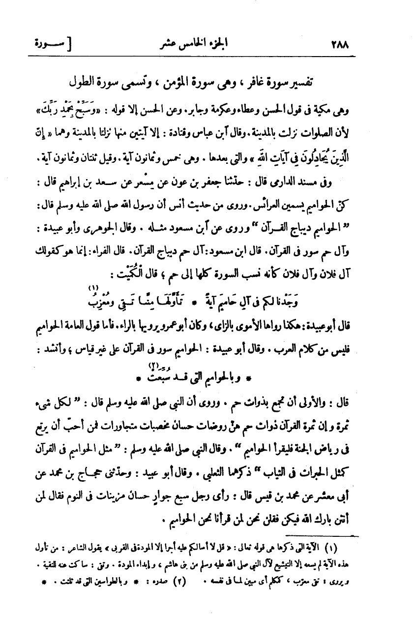 تفسير سُورَةُ غَافِرٍ وَهِيَ سُورَةُ الْمُؤْمِنِ، وَتُسَمَّى سُورَةُ الطَّوْلِ وَهِيَ مَكِّيَّةٌ فِي قَوْلِ الْحَسَنِ وَعَطَاءٍ وَعِكْرِمَةَ وَجَابِرٍ. وَعَنِ الْحَسَنِ إِلَّا قَوْلَهُ:" وَسَبِّحْ بِحَمْدِ رَبِّكَ" [غافر: ٥٥] لِأَنَّ الصَّلَوَاتِ نَزَلَتْ بِالْمَدِينَةِ. وَقَالَ ابْنُ عَبَّاسٍ وَقَتَادَةُ: إِلَّا آيَتَيْنِ مِنْهَا نَزَلَتَا بِالْمَدِينَةِ وَهُمَا" إِنَّ الَّذِينَ يُجادِلُونَ فِي آياتِ اللَّهِ" [غافر: ٥٦] والتي بعدها. وهي خمس وَثَمَانُونَ آيَةً. وَفِي مُسْنَدِ الدَّارِمِيِّ قَالَ: حَدَّثَنَا جَعْفَرُ بْنُ عَوْنٍ عَنْ مِسْعَرٍ عَنْ سَعْدِ بْنِ إِبْرَاهِيمَ قَالَ: كُنَّ الْحَوَامِيمَ يُسَمَّيْنَ الْعَرَائِسَ. وَرُوِيَ مِنْ حَدِيثِ أَنَسٍ أَنَّ رَسُولَ اللَّهِ صَلَّى اللَّهُ عَلَيْهِ وَسَلَّمَ قَالَ:" الْحَوَامِيمُ دِيبَاجُ الْقُرْآنِ" وَرُوِيَ عَنِ ابْنِ مَسْعُودٍ مِثْلُهُ. وَقَالَ الْجَوْهَرِيُّ وَأَبُو عُبَيْدَةَ: وَآلُ حم سُوَرٌ فِي الْقُرْآنِ. قَالَ ابْنُ مَسْعُودٍ: آلُ حم دِيبَاجُ الْقُرْآنِ. قَالَ الْفَرَّاءُ: إِنَّمَا هُوَ كَقَوْلِكَ آلُ فُلَانٍ وَآلُ فُلَانٍ كَأَنَّهُ نَسَبَ السُّورَةَ كُلَّهَا إِلَى حم، قَالَ الْكُمَيْتُ: