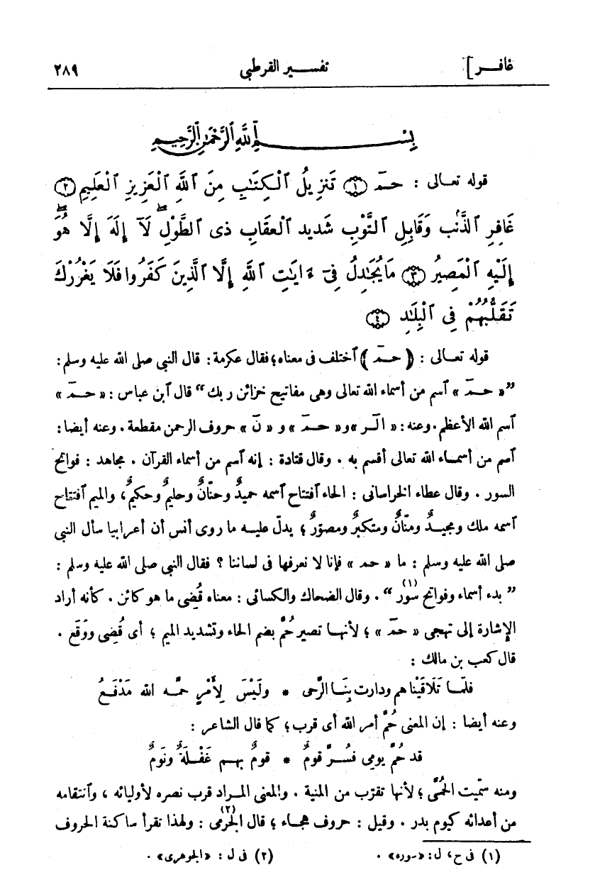 حم (١) تَنْزِيلُ الْكِتابِ مِنَ اللَّهِ الْعَزِيزِ الْعَلِيمِ (٢) غافِرِ الذَّنْبِ وَقابِلِ التَّوْبِ شَدِيدِ الْعِقابِ ذِي الطَّوْلِ لَا إِلهَ إِلاَّ هُوَ إِلَيْهِ الْمَصِيرُ (٣) مَا يُجادِلُ فِي آياتِ اللَّهِ إِلاَّ الَّذِينَ كَفَرُوا فَلا يَغْرُرْكَ تَقَلُّبُهُمْ فِي الْبِلادِ (٤)
