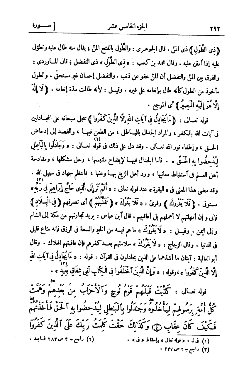 " ذِي الطَّوْلِ" ذِي الْمَنِّ. قَالَ الْجَوْهَرِيُّ: وَالطَّوْلُ بِالْفَتْحِ الْمَنُّ، يُقَالُ مِنْهُ طَالَ عَلَيْهِ وَتَطَوَّلَ عَلَيْهِ إِذَا امْتَنَّ عَلَيْهِ. وَقَالَ مُحَمَّدُ بْنُ كَعْبٍ:" ذِي الطَّوْلِ" ذِي التَّفَضُّلِ، قَالَ الْمَاوَرْدِيُّ: وَالْفَرْقُ بَيْنَ الْمَنِّ وَالتَّفَضُّلِ أَنَّ الْمَنَّ عَفْوٌ عَنْ ذَنْبٍ. وَالتَّفَضُّلُ إِحْسَانٌ غَيْرُ مُسْتَحَقٍّ. وَالطَّوْلُ مَأْخُوذٌ مِنَ الطِّوَلِ كَأَنَّهُ طَالَ بِإِنْعَامِهِ عَلَى غَيْرِهِ. وَقِيلَ: لِأَنَّهُ طَالَتْ مُدَّةُ إِنْعَامِهِ." لَا إِلهَ إِلَّا هُوَ إِلَيْهِ الْمَصِيرُ" أَيِ الْمَرْجِعُ. قَوْلُهُ تَعَالَى:" مَا يُجادِلُ فِي آياتِ اللَّهِ إِلَّا الَّذِينَ كَفَرُوا" سَجَّلَ سُبْحَانَهُ عَلَى الْمُجَادِلِينَ فِي آيَاتِ اللَّهِ بِالْكُفْرِ، وَالْمُرَادُ الْجِدَالُ بِالْبَاطِلِ، مِنَ الطَّعْنِ فِيهَا، وَالْقَصْدِ إِلَى إِدْحَاضِ الْحَقِّ، وَإِطْفَاءِ نُورِ اللَّهِ تَعَالَى. وَقَدْ دَلَّ عَلَى ذَلِكَ فِي قَوْلِهِ تَعَالَى:" وَجادَلُوا بِالْباطِلِ لِيُدْحِضُوا بِهِ الْحَقَّ". [غافر: ٥]. فَأَمَّا الْجِدَالُ فِيهَا لِإِيضَاحِ مُلْتَبِسِهَا، وَحَلِّ مُشْكِلِهَا، وَمُقَادَحَةِ أَهْلِ الْعِلْمِ فِي اسْتِنْبَاطِ مَعَانِيهَا، وَرَدِّ أَهْلِ الزَّيْغِ بِهَا وَعَنْهَا، فَأَعْظَمُ جِهَادٍ فِي سَبِيلِ اللَّهِ. وَقَدْ مَضَى هَذَا الْمَعْنَى فِي [الْبَقَرَةِ] عِنْدَ قَوْلِهِ تَعَالَى:" أَلَمْ تَرَ إِلَى الَّذِي حَاجَّ إِبْراهِيمَ فِي رَبِّهِ" «١» [البقرة: ٢٥٨] مستوفى." فَلا يَغْرُرْكَ" وقرى:" فَلَا يَغُرْكَ"" تَقَلُّبُهُمْ" أَيْ تَصَرُّفُهُمْ" فِي الْبِلادِ" فإني إن أَمْهَلْتُهُمْ لَا أُهْمِلُهُمْ بَلْ أُعَاقِبُهُمْ. قَالَ ابْنُ عَبَّاسٍ: يُرِيدُ تِجَارَتَهُمْ مِنْ مَكَّةَ إِلَى الشَّامِ وإلى اليمن. وقيل:" فَلا يَغْرُرْكَ" مَا هُمْ فِيهِ مِنَ الْخَيْرِ وَالسَّعَةِ فِي الرِّزْقِ فَإِنَّهُ مَتَاعٌ قَلِيلٌ فِي الدُّنْيَا. وقال الزجاج:" فَلا يَغْرُرْكَ" سَلَامَتُهُمْ بَعْدَ كُفْرِهِمْ فَإِنَّ عَاقِبَتَهُمُ الْهَلَاكُ. وَقَالَ أَبُو الْعَالِيَةِ: آيَتَانِ مَا أَشَدَّهُمَا عَلَى الَّذِينَ يُجَادِلُونَ فِي الْقُرْآنِ: قَوْلُهُ:" مَا يُجادِلُ فِي آياتِ اللَّهِ إِلَّا الَّذِينَ كَفَرُوا"، وَقَوْلُهُ:" وَإِنَّ الَّذِينَ اخْتَلَفُوا فِي الْكِتابِ لَفِي شِقاقٍ بَعِيدٍ" [البقرة: ١٧٦].