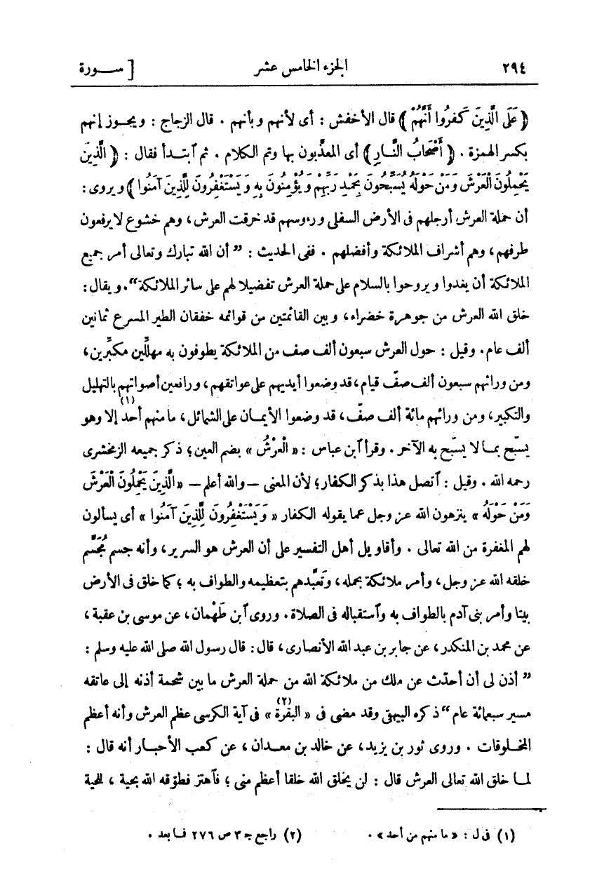 " عَلَى الَّذِينَ كَفَرُوا أَنَّهُمْ" قَالَ الْأَخْفَشُ: أَيْ لِأَنَّهُمْ وَبِأَنَّهُمْ. قَالَ الزَّجَّاجُ: وَيَجُوزُ إِنَّهُمْ بِكَسْرِ الْهَمْزَةِ." أَصْحابُ النَّارِ" أَيِ الْمُعَذَّبُونَ بِهَا وَتَمَّ الكلام. ثم ابتدأ فقال:" الَّذِينَ يَحْمِلُونَ الْعَرْشَ وَمَنْ حَوْلَهُ يُسَبِّحُونَ بِحَمْدِ رَبِّهِمْ وَيُؤْمِنُونَ بِهِ وَيَسْتَغْفِرُونَ لِلَّذِينَ آمَنُوا" وَيُرْوَى: أَنَّ حَمَلَةَ الْعَرْشِ أَرْجُلُهُمْ فِي الْأَرْضِ السُّفْلَى وَرُءُوسُهُمْ قَدْ خَرَقَتِ الْعَرْشَ، وَهُمْ خُشُوعٌ لَا يَرْفَعُونَ طَرْفَهُمْ، وَهُمْ أَشْرَافُ الْمَلَائِكَةِ وَأَفْضَلُهُمْ. فَفِي الحديث:" اللَّهَ تَبَارَكَ وَتَعَالَى أَمَرَ جَمِيعَ الْمَلَائِكَةِ أَنْ يَغْدُوا وَيَرُوحُوا بِالسَّلَامِ عَلَى حَمَلَةِ الْعَرْشِ تَفْضِيلًا لَهُمْ عَلَى سَائِرِ الْمَلَائِكَةِ". وَيُقَالُ: خَلَقَ اللَّهُ الْعَرْشَ مِنْ جَوْهَرَةٍ خَضْرَاءَ، وَبَيْنَ الْقَائِمَتَيْنِ مِنْ قوامه خَفَقَانُ الطَّيْرِ الْمُسْرِعِ ثَمَانِينَ أَلْفَ عَامٍ. وَقِيلَ: حَوْلَ الْعَرْشِ سَبْعُونَ أَلْفَ صَفٍّ مِنَ الْمَلَائِكَةِ يَطُوفُونَ بِهِ مُهَلِّلِينَ مُكَبِّرِينَ، وَمِنْ وَرَائِهِمْ سَبْعُونَ أَلْفَ صَفٍّ قِيَامٌ، قَدْ وَضَعُوا أَيْدِيَهُمْ عَلَى عَوَاتِقِهِمْ، وَرَافِعِينَ أَصْوَاتَهُمْ بِالتَّهْلِيلِ وَالتَّكْبِيرِ، وَمِنْ وَرَائِهِمْ مِائَةُ أَلْفِ صَفٍّ، وَقَدْ وَضَعُوا الْأَيْمَانَ عَلَى الشَّمَائِلِ، مَا مِنْهُمْ أَحَدٌ إِلَّا وَهُوَ يُسَبِّحُ بِمَا لَا يُسَبِّحُ بِهِ الْآخَرُ. وَقَرَأَ ابْنُ عَبَّاسٍ:" الْعُرْشُ" بِضَمِّ الْعَيْنِ، ذَكَرَ جَمِيعَهُ الزَّمَخْشَرِيُّ رَحِمَهُ اللَّهُ. وَقِيلَ: اتَّصَلَ هَذَا بِذِكْرِ الْكُفَّارِ، لِأَنَّ الْمَعْنَى وَاللَّهُ أَعْلَمُ-" الَّذِينَ يَحْمِلُونَ الْعَرْشَ وَمَنْ حَوْلَهُ" يُنَزِّهُونَ اللَّهَ عَزَّ وَجَلَّ عَمَّا يَقُولُهُ الْكُفَّارُ" وَيَسْتَغْفِرُونَ لِلَّذِينَ آمَنُوا" أَيْ يَسْأَلُونَ لَهُمُ الْمَغْفِرَةَ مِنَ اللَّهِ تَعَالَى. وَأَقَاوِيلُ أَهْلِ التَّفْسِيرِ عَلَى أَنَّ الْعَرْشَ هُوَ السَّرِيرُ، وَأَنَّهُ جِسْمٌ مُجَسَّمٌ خَلَقَهُ اللَّهُ عَزَّ وَجَلَّ، وَأَمَرَ مَلَائِكَةً بِحَمْلِهِ، وَتَعَبَّدَهُمْ بِتَعْظِيمِهِ وَالطَّوَافِ بِهِ، كَمَا خَلَقَ فِي الْأَرْضِ بَيْتًا وَأَمَرَ بَنِي آدَمَ بِالطَّوَافِ بِهِ وَاسْتِقْبَالِهِ فِي الصَّلَاةِ. وَرَوَى ابْنُ طَهْمَانَ، عَنْ مُوسَى بْنِ عُقْبَةَ، عَنْ مُحَمَّدِ بْنِ الْمُنْكَدِرِ، عَنْ جَابِرِ بْنِ عَبْدِ اللَّهِ الْأَنْصَارِيِّ، قَالَ: قَالَ رَسُولُ اللَّهِ صَلَّى اللَّهُ عَلَيْهِ وَسَلَّمَ:" أُذِنَ لِي أَنْ أُحَدِّثَ عَنْ مَلَكٍ مِنْ مَلَائِكَةِ اللَّهِ مِنْ حَمَلَةِ الْعَرْشِ مَا بَيْنَ شَحْمَةِ أُذُنِهِ إِلَى عَاتِقِهِ مَسِيرُ سَبْعِمِائَةِ عَامٍ) ذَكَرَهُ الْبَيْهَقِيُّ وَقَدْ مَضَى فِي" الْبَقَرَةِ" «١» فِي آيَةِ الْكُرْسِيِّ عِظَمُ الْعَرْشِ وَأَنَّهُ أَعْظَمُ الْمَخْلُوقَاتِ. وَرَوَى ثَوْرِ بْنِ يَزِيدَ، عَنْ خَالِدِ بْنِ مَعْدَانَ، عَنْ كَعْبِ الْأَحْبَارِ أَنَّهُ قَالَ: لَمَّا خَلَقَ اللَّهُ تَعَالَى الْعَرْشَ قَالَ: لَنْ يَخْلُقَ اللَّهُ خَلْقًا أَعْظَمَ مِنِّي، فَاهْتَزَّ فطوقه الله بحية، للحية