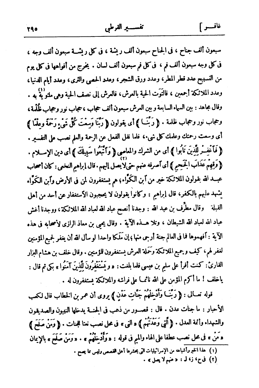 سَبْعُونَ أَلْفَ جَنَاحٍ، فِي الْجَنَاحِ سَبْعُونَ أَلْفَ رِيشَةٍ، فِي كُلِّ رِيشَةٍ سَبْعُونَ أَلْفَ وَجْهٍ، فِي كُلِّ وَجْهٍ سَبْعُونَ أَلْفَ فَمٍ، فِي كُلِّ فَمٍ سَبْعُونَ أَلْفَ لِسَانٍ. يَخْرُجُ مِنْ أَفْوَاهِهَا فِي كُلِّ يَوْمٍ مِنَ التَّسْبِيحِ عَدَدُ قَطْرِ الْمَطَرِ، وَعَدَدُ وَرَقِ الشَّجَرِ، وَعَدَدُ الْحَصَى وَالثَّرَى، وَعَدَدُ أَيَّامِ الدُّنْيَا وَعَدَدُ الْمَلَائِكَةِ أَجْمَعِينَ، فَالْتَوَتِ الْحَيَّةُ بِالْعَرْشِ، فَالْعَرْشُ إِلَى نِصْفِ الْحَيَّةِ وَهِيَ مُلْتَوِيَةٌ بِهِ «١». وَقَالَ مُجَاهِدٌ: بَيْنَ السَّمَاءِ السَّابِعَةِ وَبَيْنَ الْعَرْشِ سَبْعُونَ أَلْفَ حِجَابٍ، حِجَابُ نُورٍ وَحِجَابُ ظُلْمَةٍ، وَحِجَابُ نُورٍ وَحِجَابُ ظُلْمَةٍ." رَبَّنا" أَيْ يَقُولُونَ" رَبَّنا وَسِعْتَ كُلَّ شَيْءٍ رَحْمَةً وَعِلْماً" أَيْ وَسِعَتْ رَحْمَتُكَ وَعِلْمُكَ كُلَّ شي فَلَمَّا نُقِلَ الْفِعْلُ عَنِ الرَّحْمَةِ وَالْعِلْمِ نُصِبَ عَلَى التَّفْسِيرِ" فَاغْفِرْ لِلَّذِينَ تابُوا" أَيْ مِنَ الشِّرْكِ وَالْمَعَاصِي" وَاتَّبَعُوا سَبِيلَكَ" أَيْ دِينَ الْإِسْلَامِ" وَقِهِمْ عَذابَ الْجَحِيمِ" أَيِ اصْرِفْهُ عَنْهُمْ حَتَّى لا يصل إليهم. قال ابراهيم نخعي: كَانَ أَصْحَابُ عَبْدِ اللَّهِ يَقُولُونَ الْمَلَائِكَةُ خَيْرٌ ن ابْنِ الْكَوَّاءِ هُمْ يَسْتَغْفِرُونَ لِمَنْ فِي الْأَرْضِ وَابْنُ الْكَوَّاءِ يَشْهَدُ عَلَيْهِمْ بِالْكُفْرِ. قَالَ إِبْرَاهِيمُ: وَكَانُوا يَقُولُونَ لَا يَحْجُبُونَ الِاسْتِغْفَارَ عَنْ أَحَدٍ مِنْ أَهْلِ الْقِبْلَةِ. وَقَالَ مُطَرِّفُ بْنُ عَبْدِ اللَّهِ: وَجَدْنَا أَنْصَحَ عِبَادِ اللَّهِ لِعِبَادِ اللَّهِ الْمَلَائِكَةَ وَوَجَدْنَا أَغَشَّ عِبَادِ اللَّهِ لِعِبَادِ اللَّهِ الشَّيْطَانَ وَتَلَا هَذِهِ الْآيَةَ. وَقَالَ يَحْيَى بْنُ مُعَاذٍ الرَّازِيَّ لِأَصْحَابِهِ فِي هَذِهِ الْآيَةِ: افْهَمُوهَا فَمَا فِي الْعَالَمِ جُنَّةٌ أَرْجَى مِنْهَا إِنَّ مَلَكًا وَاحِدًا لَوْ سَأَلَ اللَّهَ أَنْ يَغْفِرَ لِجَمِيعِ الْمُؤْمِنِينَ لَغَفَرَ لَهُمْ، كَيْفَ وَجَمِيعُ الْمَلَائِكَةِ وَحَمَلَةُ الْعَرْشِ يَسْتَغْفِرُونَ لِلْمُؤْمِنِينَ. وَقَالَ خَلَفُ بْنُ هشام البزاز القاري. كُنْتُ أَقْرَأُ عَلَى سُلَيْمِ بْنِ عِيسَى فَلَمَّا بَلَغْتُ" وَيَسْتَغْفِرُونَ لِلَّذِينَ آمَنُوا" بَكَى ثُمَّ قَالَ: يَا خَلَفُ مَا أَكْرَمَ الْمُؤْمِنَ عَلَى اللَّهِ نَائِمًا عَلَى فِرَاشِهِ وَالْمَلَائِكَةُ يَسْتَغْفِرُونَ لَهُ. قَوْلُهُ تَعَالَى:" رَبَّنا وَأَدْخِلْهُمْ جَنَّاتِ عَدْنٍ" يُرْوَى أَنَّ عُمَرَ بْنَ الْخَطَّابِ قَالَ لِكَعْبِ الْأَحْبَارِ: مَا جَنَّاتُ عَدْنٍ. قَالَ: قُصُورٌ مِنْ ذَهَبٍ فِي الْجَنَّةِ يَدْخُلُهَا النَّبِيُّونَ وَالصِّدِّيقُونَ وَالشُّهَدَاءُ وَأَئِمَّةُ الْعَدْلِ." الَّتِي وَعَدْتَهُمْ"" الَّتِي" فِي مَحَلِّ نَصْبٍ نَعْتًا لِلْجَنَّاتِ." وَمَنْ صَلَحَ"" مَنْ" فِي مَحَلِّ نَصْبٍ عَطْفًا عَلَى الْهَاءِ وَالْمِيمِ فِي قَوْلِهِ" وَأَدْخِلْهُمْ"." وَمَنْ صَلَحَ" بالإيمان