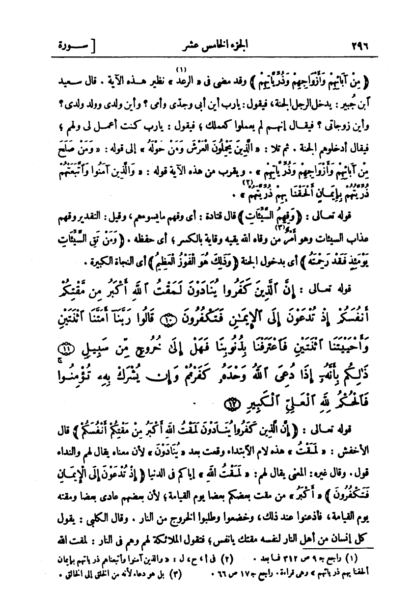 قَوْلُهُ تَعَالَى: إِنَّ الَّذِينَ كَفَرُوا يُنادَوْنَ لَمَقْتُ اللَّهِ أَكْبَرُ مِنْ مَقْتِكُمْ أَنْفُسَكُمْ" قَالَ الْأَخْفَشُ:" لَمَقْتُ" هَذِهِ لَامُ الِابْتِدَاءِ وَقَعَتْ بَعْدَ" يُنادَوْنَ" لِأَنَّ مَعْنَاهُ يُقَالُ لَهُمْ وَالنِّدَاءُ قَوْلٌ. وَقَالَ غَيْرُهُ: الْمَعْنَى يُقَالُ لَهُمْ:" لَمَقْتُ اللَّهِ" إِيَّاكُمْ فِي الدُّنْيَا" إِذْ تُدْعَوْنَ إِلَى الْإِيمانِ فَتَكْفُرُونَ" أكبر" من مقت بعضكم بعضا يوم القيامة، لأن بعضهم عادى بعضا ومقته يوم القيامة، فأذعنوا عند ذلك، وخضعوا وطلبوا الخروج من النار. وقال الكلبي: يقول كل إنسان من أهل النار لنفسه مقتك يا نفس، فتقول الملائكة لهم وهم في النار: لمقت الله