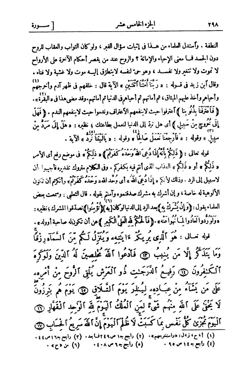 النُّطْفَةِ. وَاسْتَدَلَّ الْعُلَمَاءُ مِنْ هَذَا فِي إِثْبَاتِ سُؤَالِ الْقَبْرِ، وَلَوْ كَانَ الثَّوَابُ وَالْعِقَابُ لِلرُّوحِ دُونَ الْجَسَدِ فَمَا مَعْنَى الْإِحْيَاءِ وَالْإِمَاتَةِ؟ وَالرُّوحُ عِنْدَ مَنْ يَقْصُرُ أَحْكَامَ الْآخِرَةِ عَلَى الْأَرْوَاحِ لَا تَمُوتُ وَلَا تَتَغَيَّرُ وَلَا تَفْسُدُ، وَهُوَ حَيٌّ لِنَفْسِهِ لَا يَتَطَرَّقُ إِلَيْهِ مَوْتٌ وَلَا غَشْيَةٌ وَلَا فَنَاءٌ. وَقَالَ ابْنُ زَيْدٍ فِي قَوْلِهِ:" رَبَّنا أَمَتَّنَا اثْنَتَيْنِ ... " الْآيَةَ قَالَ: خَلَقَهُمْ فِي ظَهْرِ آدَمَ وَأَخْرَجَهُمْ وَأَحْيَاهُمْ وَأَخَذَ عَلَيْهِمُ الْمِيثَاقَ، ثُمَّ أَمَاتَهُمْ ثُمَّ أَحْيَاهُمْ فِي الدُّنْيَا ثُمَّ أَمَاتَهُمْ. وَقَدْ مَضَى هَذَا فِي" الْبَقَرَةِ" «١»." فَاعْتَرَفْنا بِذُنُوبِنا" اعْتَرَفُوا حَيْثُ لَا يَنْفَعُهُمُ الِاعْتِرَافُ وَنَدِمُوا حَيْثُ لَا يَنْفَعُهُمُ النَّدَمُ." فَهَلْ إِلى خُرُوجٍ مِنْ سَبِيلٍ" أَيْ هَلْ نُرَدُّ إِلَى الدُّنْيَا لِنَعْمَلَ بِطَاعَتِكَ، نَظِيرُهُ:" هَلْ إِلى مَرَدٍّ مِنْ سَبِيلٍ" [الشورى: ٤٤] وقوله:" فَارْجِعْنا نَعْمَلْ صالِحاً" [السجدة: ١٢] وقوله:" يا لَيْتَنا نُرَدُّ" [الأنعام: ٢٧] الْآيَةَ. قَوْلُهُ تَعَالَى:" ذلِكُمْ بِأَنَّهُ إِذا دُعِيَ اللَّهُ وَحْدَهُ كَفَرْتُمْ"" ذلِكُمْ" فِي مَوْضِعِ رَفْعٍ أَيِ الْأَمْرُ" ذَلِكُمْ" أَوْ" ذَلِكُمُ" الْعَذَابُ الَّذِي أَنْتُمْ فِيهِ بِكُفْرِكُمْ. وَفِي الْكَلَامِ مَتْرُوكٌ تَقْدِيرُهُ فَأُجِيبُوا بِأَنْ لَا سَبِيلَ إِلَى الرَّدِّ. وَذَلِكَ لِأَنَّكُمْ" إِذا دُعِيَ اللَّهُ" أَيْ وُحِّدَ اللَّهُ" وَحْدَهُ كَفَرْتُمْ" وَأَنْكَرْتُمْ أَنْ تَكُونَ الْأُلُوهِيَّةُ لَهُ خَاصَّةً، وَإِنْ أَشْرَكَ بِهِ مُشْرِكٌ صَدَّقْتُمُوهُ وَآمَنْتُمْ بِقَوْلِهِ. قَالَ الثَّعْلَبِيُّ: وَسَمِعْتُ بَعْضَ الْعُلَمَاءِ يَقُولُ:" وَإِنْ يُشْرَكْ بِهِ" بَعْدَ الرَّدِّ إِلَى الدُّنْيَا لَوْ كَانَ بِهِ" تُؤْمِنُوا" تُصَدِّقُوا الْمُشْرِكَ، نَظِيرُهُ:" وَلَوْ رُدُّوا لَعادُوا لِما نُهُوا عَنْهُ"" فَالْحُكْمُ لِلَّهِ الْعَلِيِّ الْكَبِيرِ" عَنْ أَنْ تَكُونَ لَهُ صاحبة أو ولد.