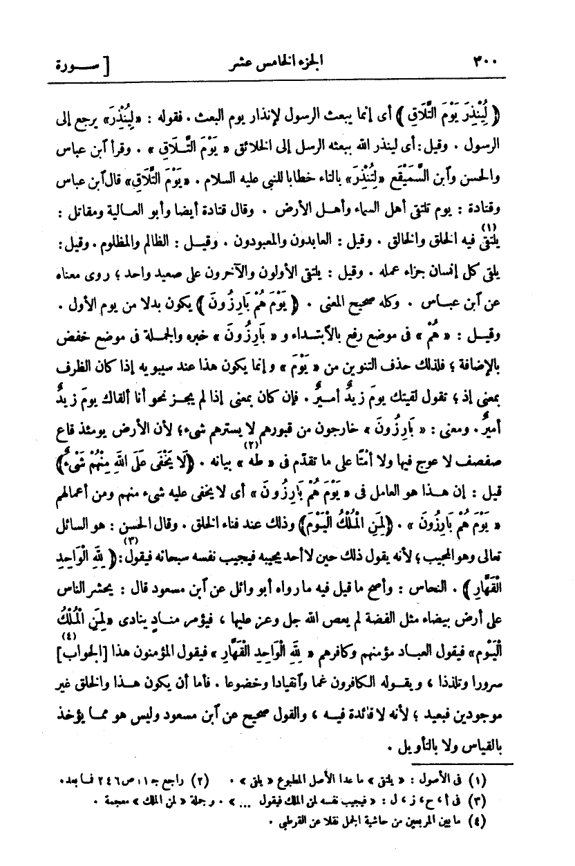 " لِيُنْذِرَ يَوْمَ التَّلاقِ" أَيْ إِنَّمَا يُبْعَثُ الرَّسُولُ لِإِنْذَارِ يَوْمِ الْبَعْثِ. فَقَوْلُهُ:" لِيُنْذِرَ" يَرْجِعُ إِلَى الرسول. وقيل: لِيُنْذِرَ اللَّهُ بِبَعْثِهِ الرُّسُلَ إِلَى الْخَلَائِقِ" يَوْمَ التَّلاقِ". وَقَرَأَ ابْنُ عَبَّاسٍ وَالْحَسَنُ وَابْنُ السَّمَيْقَعِ" لِتُنْذِرَ" بِالتَّاءِ خِطَابًا لِلنَّبِيِّ عَلَيْهِ السَّلَامُ." يَوْمَ التَّلاقِ" قَالَ ابْنُ عَبَّاسٍ وَقَتَادَةُ: يَوْمَ تَلْتَقِي أَهْلُ السَّمَاءِ وَأَهْلُ الْأَرْضِ. وَقَالَ قَتَادَةُ أَيْضًا وَأَبُو الْعَالِيَةِ وَمُقَاتِلٌ: يَلْتَقِي فِيهِ الْخَلْقُ وَالْخَالِقُ. وَقِيلَ: الْعَابِدُونَ وَالْمَعْبُودُونَ. وَقِيلَ: الظَّالِمُ وَالْمَظْلُومُ. وَقِيلَ: يَلْقَى كُلُّ إِنْسَانٍ جَزَاءَ عَمَلِهِ. وَقِيلَ: يَلْتَقِي الْأَوَّلُونَ وَالْآخِرُونَ عَلَى صَعِيدٍ وَاحِدٍ، رُوِيَ مَعْنَاهُ عَنِ ابْنِ عَبَّاسٍ. وَكُلُّهُ صَحِيحُ الْمَعْنَى." يَوْمَ هُمْ بارِزُونَ" يَكُونُ بَدَلًا مِنْ يَوْمَ الْأَوَّلِ. وَقِيلَ:" هُمْ" فِي مَوْضِعِ رَفْعٍ بِالِابْتِدَاءِ وَ" بارِزُونَ" خَبَرُهُ وَالْجُمْلَةُ فِي مَوْضِعِ خَفْضٍ بِالْإِضَافَةِ، فَلِذَلِكَ حُذِفَ التَّنْوِينُ مِنْ" يَوْمَ" وَإِنَّمَا يَكُونُ هَذَا عِنْدَ سِيبَوَيْهِ إِذَا كَانَ الظَّرْفُ بِمَعْنَى إِذْ، تَقُولُ لَقِيتُكَ يَوْمَ زَيْدٌ أَمِيرٌ. فَإِنْ كَانَ بِمَعْنَى إِذَا لَمْ يَجُزْ نَحْوَ أَنَا أَلْقَاكَ يَوْمَ زَيْدٌ أَمِيرٌ. وَمَعْنَى:" بارِزُونَ" خَارِجُونَ من قبورهم لا يسترهم شي، لِأَنَّ