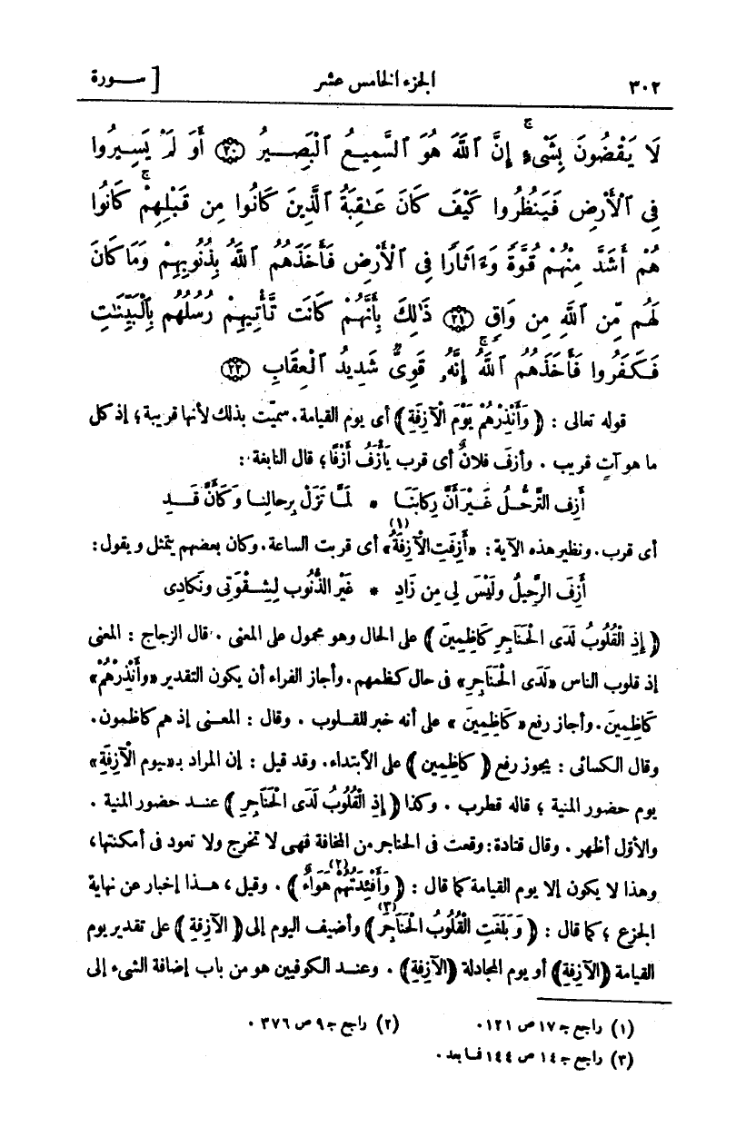 " إِذِ الْقُلُوبُ لَدَى الْحَناجِرِ كاظِمِينَ" عَلَى الْحَالِ وَهُوَ مَحْمُولٌ عَلَى الْمَعْنَى. قَالَ الزَّجَّاجُ: الْمَعْنَى إِذْ قُلُوبُ النَّاسِ" لَدَى الْحَناجِرِ" فِي حَالِ كَظْمِهِمْ. وَأَجَازَ الْفَرَّاءُ أَنْ يَكُونَ التَّقْدِيرُ" وَأَنْذِرْهُمْ" كَاظِمِينَ. وَأَجَازَ رَفْعَ" كَاظِمِينَ" عَلَى أَنَّهُ خَبَرٌ لِلْقُلُوبِ. وَقَالَ: الْمَعْنَى إِذْ هُمْ كَاظِمُونَ. وَقَالَ الْكِسَائِيُّ: يَجُوزُ رَفْعُ" كَاظِمِينَ" عَلَى الِابْتِدَاءِ. وَقَدْ قِيلَ: إِنَّ الْمُرَادَ بِ" يَوْمَ الْآزِفَةِ" يَوْمَ حُضُورِ الْمَنِيَّةِ، قَالَهُ قُطْرُبٌ. وَكَذَا" إِذِ الْقُلُوبُ لَدَى الْحَناجِرِ" عِنْدَ حُضُورِ الْمَنِيَّةِ. وَالْأَوَّلُ أَظْهَرُ. وَقَالَ قَتَادَةُ: وَقَعَتْ فِي الحناجر الْمَخَافَةِ فَهِيَ لَا تَخْرُجُ وَلَا تَعُودُ فِي أَمْكِنَتِهَا، وَهَذَا لَا يَكُونُ إِلَّا يَوْمَ الْقِيَامَةِ كَمَا قَالَ:" وَأَفْئِدَتُهُمْ هَواءٌ". وَقِيلَ: هَذَا إِخْبَارٌ عَنْ نِهَايَةِ الْجَزَعِ، كَمَا قَالَ:" وَبَلَغَتِ الْقُلُوبُ الْحَناجِرَ" وَأُضِيفَ الْيَوْمُ إِلَى" الْآزِفَةِ" عَلَى تَقْدِيرِ يَوْمُ الْقِيَامَةِ" الْآزِفَةِ" أَوْ يَوْمُ الْمُجَادَلَةِ" الْآزِفَةِ". وَعِنْدَ الْكُوفِيِّينَ هُوَ مِنْ بَابِ إِضَافَةِ الشَّيْءِ إلى