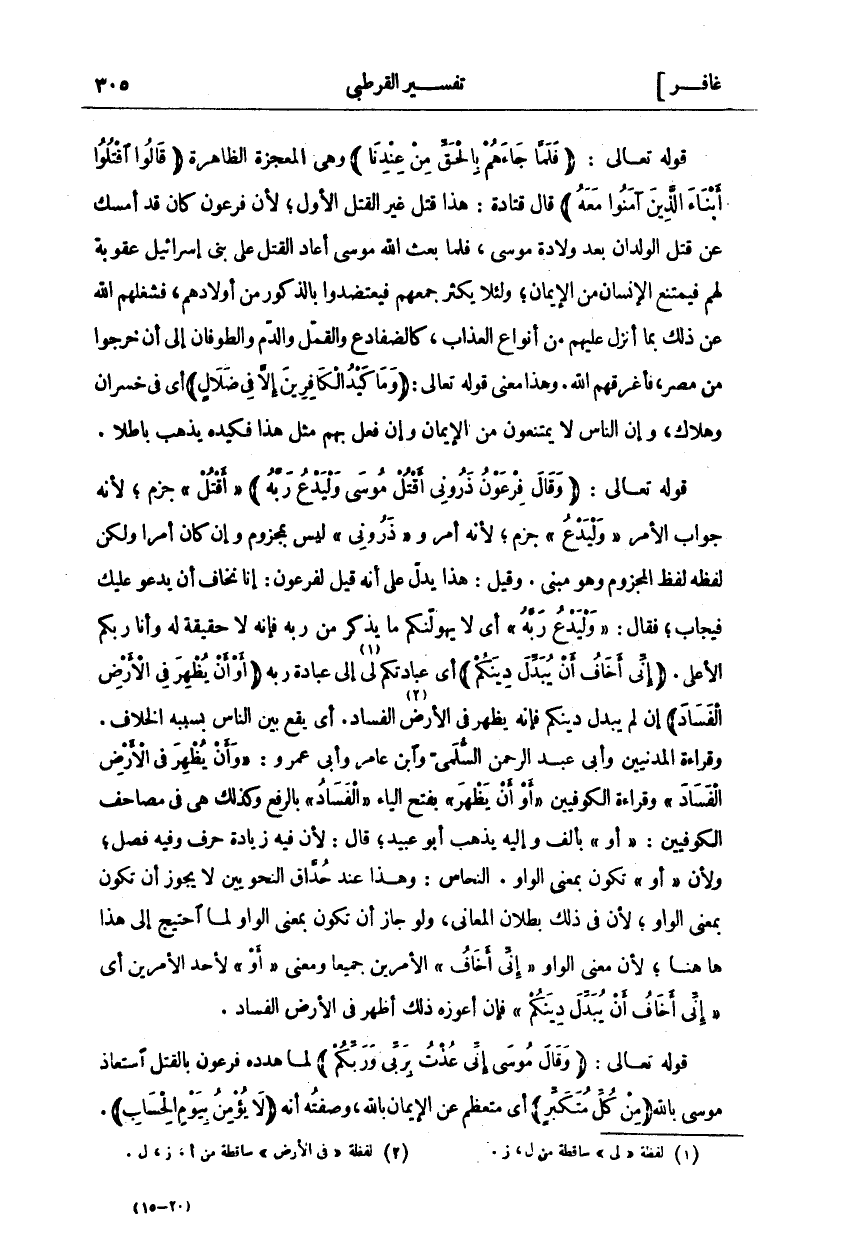 قَوْلُهُ تَعَالَى:" فَلَمَّا جاءَهُمْ بِالْحَقِّ مِنْ عِنْدِنا" وَهِيَ الْمُعْجِزَةُ الظَّاهِرَةُ" قالُوا اقْتُلُوا أَبْناءَ الَّذِينَ آمَنُوا مَعَهُ" قَالَ قَتَادَةُ: هَذَا قَتْلٌ غَيْرُ الْقَتْلِ الْأَوَّلِ، لِأَنَّ فِرْعَوْنَ كَانَ قَدْ أَمْسَكَ عَنْ قَتْلِ الْوِلْدَانِ بَعْدَ وِلَادَةِ مُوسَى، فَلَمَّا بَعَثَ اللَّهُ مُوسَى أَعَادَ الْقَتْلَ عَلَى بَنِي إِسْرَائِيلَ عُقُوبَةً لَهُمْ فَيَمْتَنِعُ الْإِنْسَانُ مِنَ الْإِيمَانِ، وَلِئَلَّا يَكْثُرَ جَمْعُهُمْ فَيَعْتَضِدُوا بِالذُّكُورِ مِنْ أَوْلَادِهِمْ. فَشَغَلَهُمُ اللَّهُ عَنْ ذَلِكَ بِمَا أَنْزَلَ عَلَيْهِمْ مِنْ أَنْوَاعِ الْعَذَابِ. كَالضَّفَادِعِ وَالْقُمَّلِ وَالدَّمِ وَالطُّوفَانِ إِلَى أَنْ خَرَجُوا مِنْ مِصْرَ، فَأَغْرَقَهُمُ اللَّهُ. وَهَذَا مَعْنَى قوله تعالى:" وَما كَيْدُ الْكافِرِينَ إِلَّا فِي ضَلالٍ" أَيْ فِي خُسْرَانٍ وَهَلَاكٍ، وَإِنَّ النَّاسَ لَا يَمْتَنِعُونَ مِنَ الْإِيمَانِ وَإِنْ فُعِلَ بِهِمْ مِثْلَ هَذَا فَكَيْدُهُ يَذْهَبُ بَاطِلًا. قَوْلُهُ تَعَالَى:" وَقالَ فِرْعَوْنُ ذَرُونِي أَقْتُلْ مُوسى وَلْيَدْعُ رَبَّهُ" أَقْتُلْ" جَزْمٌ، لِأَنَّهُ جَوَابُ الْأَمْرِ" وَلْيَدْعُ" جَزْمٌ، لِأَنَّهُ أَمْرٌ وَ" ذَرُونِي" لَيْسَ بِمَجْزُومٍ وَإِنْ كَانَ أَمْرًا وَلَكِنَّ لَفْظَهُ لَفْظُ الْمَجْزُومِ وَهُوَ مَبْنِيٌّ. وَقِيلَ: هَذَا يَدُلُّ عَلَى أَنَّهُ قِيلَ لِفِرْعَوْنَ: إِنَّا نَخَافُ أَنْ يَدْعُوَ عَلَيْكَ فَيُجَابَ، فَقَالَ:" وَلْيَدْعُ رَبَّهُ" أَيْ لَا يَهُولَنَّكُمْ مَا يَذْكُرُ مِنْ رَبِّهِ فَإِنَّهُ لَا حَقِيقَةَ لَهُ وَأَنَا رَبُّكُمُ الْأَعْلَى." إِنِّي أَخافُ أَنْ يُبَدِّلَ دِينَكُمْ" أَيْ عِبَادَتَكُمْ لِي إِلَى عِبَادَةِ رَبِّهِ" أَوْ أَنْ يُظْهِرَ فِي الْأَرْضِ الْفَسادَ" إِنْ لَمْ يُبَدِّلْ دِينَكُمْ فَإِنَّهُ يُظْهِرُ فِي الْأَرْضِ الْفَسَادَ. أَيْ يَقَعُ بَيْنَ النَّاسِ بِسَبَبِهِ الْخِلَافُ. وَقِرَاءَةُ الْمَدَنِيِّينَ وَأَبِي عَبْدِ الرَّحْمَنِ السُّلَمِيِّ وَابْنِ عَامِرٍ وَأَبِي عمرو:" أَوْ أَنْ يُظْهِرَ فِي الْأَرْضِ الْفَسادَ" وَقِرَاءَةُ الْكُوفِيِّينَ" أَوْ أَنْ يَظْهَرَ" بِفَتْحِ الْيَاءِ" الْفَسَادُ" بِالرَّفْعِ وَكَذَلِكَ هِيَ فِي مَصَاحِفِ الْكُوفِيِّينَ:" أَوْ" بِأَلِفٍ وَإِلَيْهِ يَذْهَبُ أَبُو عُبَيْدٍ، قَالَ: لِأَنَّ فِيهِ زِيَادَةَ حَرْفٍ وَفِيهِ فَصْلٌ، وَلِأَنَّ" أَوْ" تَكُونُ بِمَعْنَى الْوَاوِ. النَّحَّاسُ: وَهَذَا عِنْدَ حُذَّاقِ النَّحْوِيِّينَ لَا يَجُوزُ أَنْ تَكُونَ بِمَعْنَى الْوَاوِ، لِأَنَّ فِي ذَلِكَ بُطْلَانَ الْمَعَانِي، وَلَوْ جَازَ أَنْ تَكُونَ بمعنى الواو لما احتيج إلى هذا ها هنا، لِأَنَّ مَعْنَى الْوَاوِ" إِنِّي أَخافُ" الْأَمْرَيْنِ جَمِيعًا وَمَعْنَى" أَوْ" لِأَحَدِ الْأَمْرَيْنِ أَيْ" إِنِّي أَخَافُ أَنْ يُبَدِّلَ دِينكُمْ" فَإِنْ أَعْوَزَهُ ذَلِكَ أَظْهَرَ فِي الْأَرْضِ الْفَسَادَ. قَوْلُهُ تَعَالَى:" وَقالَ مُوسى إِنِّي عُذْتُ بِرَبِّي وَرَبِّكُمْ" لَمَّا هَدَّدَهُ فِرْعَوْنُ بِالْقَتْلِ اسْتَعَاذَ مُوسَى بِاللَّهِ" مِنْ كُلِّ مُتَكَبِّرٍ" أَيْ مُتَعَظِّمٍ عَنِ الْإِيمَانِ بِاللَّهِ، وَصِفَتُهُ أَنَّهُ" لا يُؤْمِنُ بِيَوْمِ الْحِسابِ".