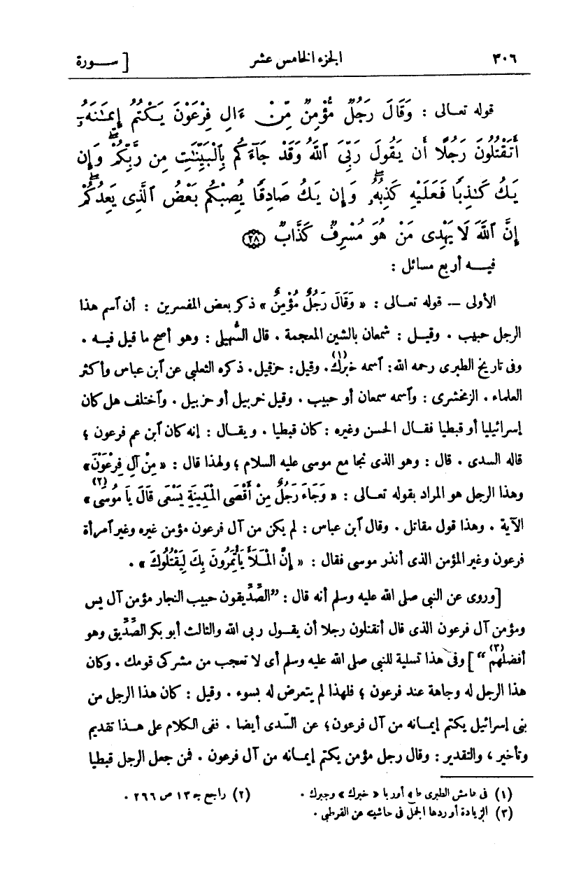 فِيهِ أَرْبَعُ مَسَائِلَ: الْأُولَى- قَوْلُهُ تَعَالَى" وَقالَ رَجُلٌ مُؤْمِنٌ" ذَكَرَ بَعْضُ الْمُفَسِّرِينَ: أَنَّ اسْمَ هَذَا الرَّجُلِ حَبِيبٌ. وَقِيلَ: شَمْعَانُ بِالشِّينِ الْمُعْجَمَةِ. قَالَ السُّهَيْلِيُّ: وَهُوَ أَصَحُّ مَا قِيلَ فِيهِ. وَفِي تَارِيخِ الطَّبَرِيِّ رَحِمَهُ اللَّهُ: اسْمُهُ خَبْرَكُ «١». وَقِيلَ: حِزْقِيلُ. ذَكَرَهُ الثَّعْلَبِيُّ عَنِ ابْنِ عَبَّاسٍ وَأَكْثَرِ الْعُلَمَاءِ. الزَّمَخْشَرِيُّ: وَاسْمُهُ سَمْعَانُ أَوْ حَبِيبٌ. وَقِيلَ: خَرْبِيلُ أَوْ حِزْبِيلُ. وَاخْتُلِفَ هَلْ كَانَ إِسْرَائِيلِيًّا أَوْ قِبْطِيًّا فَقَالَ الْحَسَنُ وَغَيْرُهُ: كَانَ قِبْطِيًّا. وَيُقَالُ: إِنَّهُ كَانَ ابْنُ عَمِّ فِرْعَوْنَ، قَالَهُ السُّدِّيُّ. قَالَ: وَهُوَ الَّذِي نَجَا مَعَ مُوسَى عَلَيْهِ السَّلَامُ، وَلِهَذَا قَالَ:" مِنْ آلِ فِرْعَوْنَ" وَهَذَا الرَّجُلُ هُوَ الْمُرَادُ بِقَوْلِهِ تَعَالَى:" وَجاءَ رَجُلٌ مِنْ أَقْصَى الْمَدِينَةِ يَسْعى قالَ يا مُوسى " [القصص: ٢٠] الْآيَةَ. وَهَذَا قَوْلُ مُقَاتِلٍ. وَقَالَ ابْنُ عَبَّاسٍ: لَمْ يَكُنْ مِنْ آلِ فِرْعَوْنَ مُؤْمِنٌ غَيْرَهُ وَغَيْرَ امْرَأَةِ فِرْعَوْنَ وَغَيْرَ الْمُؤْمِنِ الَّذِي أَنْذَرَ مُوسَى فَقَالَ:" إِنَّ الْمَلَأَ يَأْتَمِرُونَ بِكَ لِيَقْتُلُوكَ" [القصص: ٢٠]. وَرُوِيَ عَنِ النَّبِيِّ صَلَّى اللَّهُ عَلَيْهِ وَسَلَّمَ أَنَّهُ قَالَ:" الصِّدِّيقُونَ حَبِيبٌ النَّجَّارُ مُؤْمِنُ آلِ يَس وَمُؤْمِنُ آلِ فِرْعَوْنَ الَّذِي قَالَ أَتَقْتُلُونَ رَجُلًا أَنْ يَقُولَ رَبِّيَ اللَّهُ وَالثَّالِثُ أَبُو بَكْرٍ الصِّدِّيقُ وَهُوَ أَفْضَلُهُمْ" «٢» وَفِي هَذَا تَسْلِيَةٌ لِلنَّبِيِّ صَلَّى اللَّهُ عَلَيْهِ وَسَلَّمَ أَيْ لَا تَعْجَبْ مِنْ مُشْرِكِي قَوْمِكَ. وَكَانَ هَذَا الرَّجُلُ لَهُ وَجَاهَةٌ عِنْدَ فِرْعَوْنَ، فَلِهَذَا لَمْ يَتَعَرَّضْ لَهُ بِسُوءٍ. وَقِيلَ: كَانَ هَذَا الرَّجُلُ مِنْ بَنِي إِسْرَائِيلَ يَكْتُمُ إِيمَانَهُ مِنْ آلِ فِرْعَوْنَ، عَنِ السُّدِّيِّ أَيْضًا. فَفِي الْكَلَامِ عَلَى هَذَا تقديم