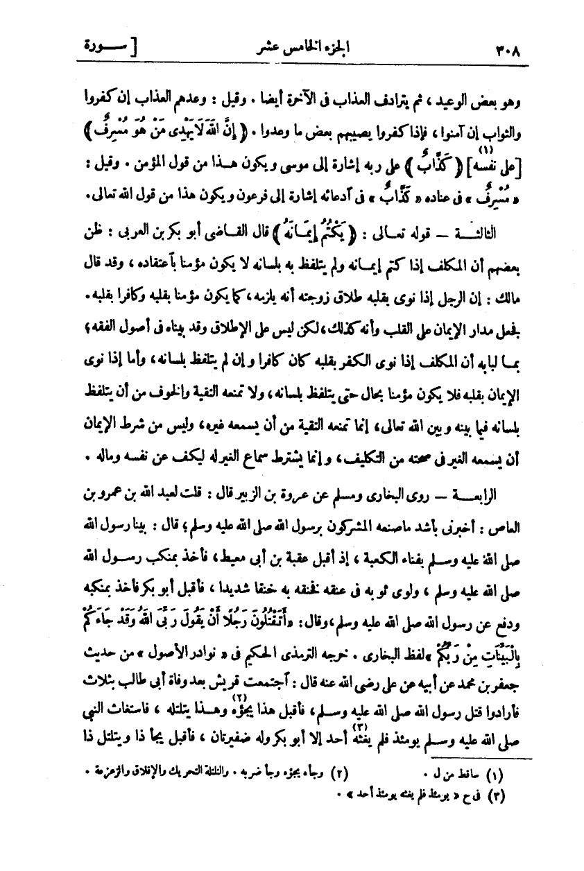 وَهُوَ بَعْضُ الْوَعِيدِ، ثُمَّ يَتَرَادَفُ الْعَذَابُ فِي الْآخِرَةِ أَيْضًا. وَقِيلَ: وَعَدَهُمُ الْعَذَابَ إِنْ كَفَرُوا وَالثَّوَابَ إِنْ آمَنُوا، فَإِذَا كَفَرُوا يُصِيبُهُمْ بَعْضُ مَا وُعِدُوا." إِنَّ اللَّهَ لَا يَهْدِي مَنْ هُوَ مُسْرِفٌ" عَلَى نَفْسِهِ" كَذَّابٌ" عَلَى رَبِّهِ إِشَارَةٌ إِلَى مُوسَى وَيَكُونُ هَذَا مِنْ قَوْلِ الْمُؤْمِنِ. وَقِيلَ:" مُسْرِفٌ" فِي عِنَادِهِ" كَذَّابٌ" فِي ادِّعَائِهِ إِشَارَةٌ إِلَى فِرْعَوْنَ وَيَكُونُ هَذَا مِنْ قَوْلِ اللَّهِ تَعَالَى. الثَّالِثَةُ- قَوْلُهُ تَعَالَى:" يَكْتُمُ إِيمانَهُ" قَالَ الْقَاضِي أَبُو بَكْرِ بْنُ الْعَرَبِيِّ: ظَنَّ بَعْضُهُمْ أَنَّ الْمُكَلَّفَ إِذَا كَتَمَ إِيمَانَهُ وَلَمْ يَتَلَفَّظْ بِهِ بِلِسَانِهِ لَا يَكُونُ مُؤْمِنًا بِاعْتِقَادِهِ، وَقَدْ قَالَ مَالِكٌ: إِنَّ الرَّجُلَ إِذَا نَوَى الْكُفْرَ بِقَلْبِهِ كَانَ كَافِرًا وَإِنْ لَمْ يَتَلَفَّظْ بِلِسَانِهِ، وَأَمَّا إِذَا نَوَى الْإِيمَانَ بِقَلْبِهِ فَلَا يَكُونُ مُؤْمِنًا بِحَالٍ حَتَّى يَتَلَفَّظَ بِلِسَانِهِ، وَلَا تَمْنَعَهُ التَّقِيَّةُ وَالْخَوْفُ مِنْ أَنْ يَتَلَفَّظَ بِلِسَانِهِ فِيمَا بَيْنَهُ وَبَيْنَ اللَّهِ تَعَالَى، إِنَّمَا تمنعه مِنْ أَنْ يَسْمَعَهُ غَيْرُهُ، وَلَيْسَ مِنْ شَرْطِ الْإِيمَانِ أَنْ يَسْمَعَهُ الْغَيْرُ فِي صِحَّتِهِ مِنَ التَّكْلِيفِ، وَإِنَّمَا يُشْتَرَطُ سَمَاعُ الْغَيْرِ لَهُ لِيَكُفَّ عن نفسه وماله. الر أبعه- رَوَى الْبُخَارِيُّ وَمُسْلِمٌ عَنْ عُرْوَةَ بْنِ الزُّبَيْرِ قَالَ قُلْتُ لِعَبْدِ اللَّهِ بْنِ عَمْرِو بْنِ الْعَاصِ: أَخْبِرْنِي بِأَشَدِّ مَا صَنَعَهُ الْمُشْرِكُونَ بِرَسُولِ اللَّهِ صَلَّى اللَّهُ عَلَيْهِ وَسَلَّمَ، قَالَ: بَيْنَا رَسُولُ اللَّهِ صَلَّى اللَّهُ عَلَيْهِ وَسَلَّمَ بِفِنَاءِ الكعبة، وإذ أَقْبَلَ عُقْبَةُ بْنُ أَبِي مُعَيْطٍ، فَأَخَذَ بِمَنْكِبِ رَسُولِ اللَّهِ صَلَّى اللَّهُ عَلَيْهِ وَسَلَّمَ، وَلَوَى ثَوْبَهُ فِي عُنُقِهِ فَخَنَقَهُ بِهِ خَنْقًا شَدِيدًا، فأقبل أبو بكر بِمَنْكِبِهِ وَدَفَعَ عَنْ رَسُولِ اللَّهِ صَلَّى اللَّهُ عَلَيْهِ وَسَلَّمَ، وَقَالَ:" أَتَقْتُلُونَ رَجُلًا أَنْ يَقُولَ رَبِّيَ اللَّهُ وَقَدْ جاءَكُمْ بِالْبَيِّناتِ مِنْ رَبِّكُمْ" لَفْظُ الْبُخَارِيِّ. خَرَّجَهُ التِّرْمِذِيُّ الْحَكِيمُ فِي نَوَادِرِ الْأُصُولِ مِنْ حَدِيثِ جَعْفَرِ بْنِ مُحَمَّدٍ عَنْ أَبِيهِ عَنْ عَلِيٍّ رَضِيَ اللَّهُ عَنْهُ قَالَ: اجْتَمَعَتْ قُرَيْشٌ بَعْدَ وَفَاةِ أَبِي طَالِبٍ بِثَلَاثٍ فَأَرَادُوا قَتْلَ رَسُولِ اللَّهِ صَلَّى اللَّهُ عَلَيْهِ وَسَلَّمَ، فأقبل هذا يجوؤه «١» وَهَذَا يُتَلْتِلُهُ، فَاسْتَغَاثَ النَّبِيُّ صَلَّى اللَّهُ عَلَيْهِ وَسَلَّمَ يَوْمَئِذٍ فَلَمْ يُغِثْهُ أَحَدٌ إِلَّا أَبُو بَكْرٍ وَلَهُ ضَفِيرَتَانِ، فَأَقْبَلَ يَجَأُ ذَا وَيُتَلْتِلُ ذا