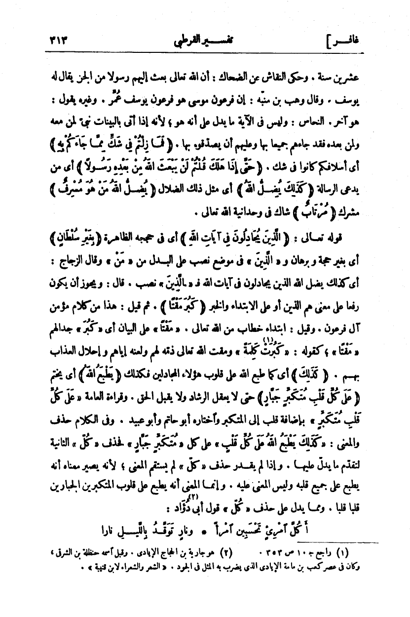عِشْرِينَ سَنَةً. وَحَكَى النَّقَّاشُ عَنِ الضَّحَّاكِ: أَنَّ اللَّهَ تَعَالَى بَعَثَ إِلَيْهِمْ رَسُولًا مِنَ الْجِنِّ يُقَالُ لَهُ يُوسُفُ. وَقَالَ وَهْبُ بْنُ مُنَبِّهٍ: إِنَّ فِرْعَوْنَ مُوسَى هُوَ فِرْعَوْنُ يُوسُفَ عُمِّرَ. وَغَيْرُهُ يَقُولُ: هُوَ آخَرُ. النَّحَّاسُ: وَلَيْسَ فِي الْآيَةِ مَا يَدُلُّ عَلَى أَنَّهُ هُوَ، لِأَنَّهُ إِذَا أَتَى بِالْبَيِّنَاتِ نَبِيٌّ لِمَنْ مَعَهُ وَلِمَنْ بَعْدَهُ فَقَدْ جَاءَهُمْ جَمِيعًا بِهَا وَعَلَيْهِمْ أَنْ يُصَدِّقُوهُ بِهَا." فَما زِلْتُمْ فِي شَكٍّ مِمَّا جاءَكُمْ بِهِ" أَيْ أَسْلَافُكُمْ كَانُوا فِي شَكٍّ." حَتَّى إِذا هَلَكَ قُلْتُمْ لَنْ يَبْعَثَ اللَّهُ مِنْ بَعْدِهِ رَسُولًا" أَيْ مَنْ يَدَّعِي الرِّسَالَةَ" كَذلِكَ يُضِلُّ اللَّهُ" أَيْ مِثْلَ ذَلِكَ الضَّلَالِ" يُضِلُّ اللَّهُ مَنْ هُوَ مُسْرِفٌ" مشرك" مُرْتابٌ" شَاكٌّ فِي وَحْدَانِيَّةِ اللَّهِ تَعَالَى. قَوْلُهُ تَعَالَى:" الَّذِينَ يُجادِلُونَ فِي آياتِ اللَّهِ" أَيْ في حججه الظاهرة" بِغَيْرِ سُلْطانٍ" أَيْ بِغَيْرِ حُجَّةٍ وَبُرْهَانٍ وَ" الَّذِينَ" فِي مَوْضِعِ نَصْبٍ عَلَى الْبَدَلِ مِنْ" مَنْ" وَقَالَ الزَّجَّاجُ: أَيْ كَذَلِكَ يُضِلُّ اللَّهُ الَّذِينَ يُجَادِلُونَ فِي آيَاتِ اللَّهِ فَ" الَّذِينَ" نَصْبٌ. قَالَ: وَيَجُوزُ أَنْ يَكُونَ رَفْعًا عَلَى مَعْنَى هُمُ الَّذِينَ أَوْ عَلَى الِابْتِدَاءِ وَالْخَبَرُ" كَبُرَ مَقْتاً". ثُمَّ قِيلَ: هَذَا مِنْ كَلَامِ مُؤْمِنِ آلِ فِرْعَوْنَ. وَقِيلَ: ابْتِدَاءُ خِطَابٍ مِنَ اللَّهِ تَعَالَى." مَقْتاً" عَلَى الْبَيَانِ أَيْ" كَبُرَ" جِدَالُهُمْ" مَقْتاً"، كقوله: كَبُرَتْ كَلِمَةً" [الكهف: ٥] وَمَقْتُ اللَّهِ تَعَالَى ذَمُّهُ لَهُمْ وَلَعْنُهُ إِيَّاهُمْ وَإِحْلَالُ الْعَذَابِ بِهِمْ." كَذلِكَ" أَيْ كَمَا طَبَعَ اللَّهُ عَلَى قُلُوبِ هَؤُلَاءِ الْمُجَادِلِينَ فَكَذَلِكَ" يَطْبَعُ اللَّهُ" أَيْ يَخْتِمُ" عَلى كُلِّ قَلْبِ مُتَكَبِّرٍ جَبَّارٍ" حَتَّى لَا يَعْقِلَ الرَّشَادَ وَلَا يَقْبَلَ الْحَقَّ. وَقِرَاءَةُ الْعَامَّةِ" عَلى كُلِّ قَلْبِ مُتَكَبِّرٍ" بِإِضَافَةِ قَلْبِ إِلَى الْمُتَكَبِّرِ وَاخْتَارَهُ أَبُو حَاتِمٍ وَأَبُو عُبَيْدٍ. وَفِي الْكَلَامِ حَذْفٌ وَالْمَعْنَى:" كَذلِكَ يَطْبَعُ اللَّهُ عَلى كُلِّ قَلْبِ" عَلَى كُلِّ" مُتَكَبِّرٍ جَبَّارٍ" فَحَذَفَ" كُلِّ" الثَّانِيَةِ لِتَقَدُّمِ مَا يَدُلُّ عَلَيْهَا. وَإِذَا لَمْ يُقَدَّرْ حَذْفُ" كُلِّ" لَمْ يَسْتَقِمِ الْمَعْنَى، لِأَنَّهُ يَصِيرُ مَعْنَاهُ أَنَّهُ يَطْبَعُ عَلَى جَمِيعِ قَلْبِهِ وَلَيْسَ الْمَعْنَى عَلَيْهِ. وَإِنَّمَا الْمَعْنَى أَنَّهُ يَطْبَعُ عَلَى قُلُوبِ الْمُتَكَبِّرِينَ الْجَبَّارِينَ قَلْبًا قَلْبًا. وَمِمَّا يَدُلُّ عَلَى حَذْفِ" كُلِّ" قَوْلُ أَبِي دُوَادَ «١»: