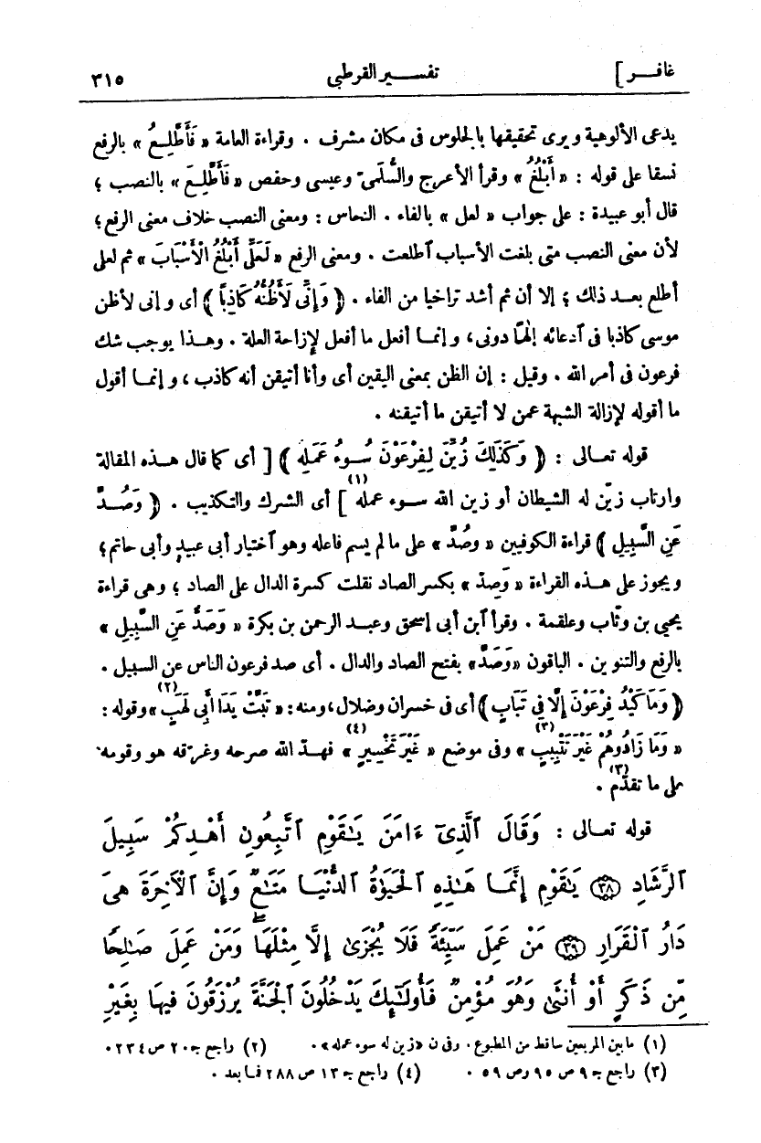 يَدَّعِي الْأُلُوهِيَّةَ وَيَرَى تَحْقِيقَهَا بِالْجُلُوسِ فِي مَكَانٍ مُشْرِفٍ. وَقِرَاءَةُ الْعَامَّةِ" فَأَطَّلِعَ" بِالرَّفْعِ نَسَقًا عَلَى قَوْلِهِ:" أَبْلُغُ" وَقَرَأَ الْأَعْرَجُ وَالسُّلَمِيُّ وَعِيسَى وَحَفْصٌ" فَأَطَّلِعَ" بِالنَّصْبِ، قَالَ أَبُو عُبَيْدَةَ: عَلَى جَوَابِ" لَعَلَّ" بِالْفَاءِ. النَّحَّاسُ: وَمَعْنَى النَّصْبِ خِلَافُ مَعْنَى الرَّفْعِ، لِأَنَّ مَعْنَى النَّصْبِ مَتَى بَلَغْتُ الْأَسْبَابَ اطَّلَعْتُ. وَمَعْنَى الرَّفْعِ" لَعَلِّي أَبْلُغُ الْأَسْبابَ" ثُمَّ لَعَلِّي أَطَّلِعُ بَعْدَ ذَلِكَ، إِلَّا أَنَّ ثُمَّ أَشَدُّ تَرَاخِيًا مِنَ الْفَاءِ." وَإِنِّي لَأَظُنُّهُ كاذِباً" أَيْ وَإِنِّي لَأَظُنُ مُوسَى كَاذِبًا فِي ادِّعَائِهِ إِلَهًا دُونِي، وَإِنَّمَا أَفْعَلُ مَا أَفْعَلُ لِإِزَاحَةِ الْعِلَّةِ. وَهَذَا يُوجِبُ شَكَّ فِرْعَوْنَ فِي أَمْرِ اللَّهِ. وَقِيلَ: إِنَّ الظَّنَّ بِمَعْنَى الْيَقِينِ أَيْ وَأَنَا أَتَيَقَّنُ أَنَّهُ كَاذِبٌ وَإِنَّمَا أَقُولُ مَا أقول لإزالة الشبهة عمن لا أتيقن مَا أَتَيَقَّنُهُ. قَوْلُهُ تَعَالَى:" وَكَذلِكَ زُيِّنَ لِفِرْعَوْنَ سُوءُ عَمَلِهِ" أَيِ الشِّرْكُ وَالتَّكْذِيبُ." وَصُدَّ عَنِ السَّبِيلِ" قِرَاءَةُ الْكُوفِيِّينَ" وَصُدَّ" عَلَى مَا لَمْ يُسَمَّ فَاعِلُهُ وَهُوَ اخْتِيَارُ أَبِي عُبَيْدٍ وَأَبِي حَاتِمٍ، وَيَجُوزُ عَلَى هَذِهِ الْقِرَاءَةِ" وَصِدَّ" بِكَسْرِ الصاد نقلت كسرة الدال عل الصَّادِ، وَهِيَ قِرَاءَةُ يَحْيَى بْنِ وَثَّابٍ وَعَلْقَمَةَ. وَقَرَأَ ابْنُ أَبِي إِسْحَاقَ وَعَبْدُ الرَّحْمَنِ بْنُ بَكْرَةَ" وَصَدٌّ عَنِ السَّبِيلِ" بِالرَّفْعِ وَالتَّنْوِينِ. الْبَاقُونَ" وَصَدَّ" بِفَتْحِ الصَّادِ وَالدَّالِ. أَيْ صَدَّ فِرْعَوْنُ النَّاسَ عَنِ السَّبِيلِ." وَما كَيْدُ فِرْعَوْنَ إِلَّا فِي تَبابٍ" أَيْ فِي خُسْرَانٍ وَضَلَالٍ، وَمِنْهُ:" تَبَّتْ يَدا أَبِي لَهَبٍ" [المسد: ١] وقوله:" وَما زادُوهُمْ غَيْرَ تَتْبِيبٍ" [هود: ١٠١] وفي موضع" غَيْرَ تَخْسِيرٍ" [هود: ٦٣] فَهَدَّ اللَّهُ صَرْحَهُ وَغَرَّقَهُ هُوَ وَقَوْمَهُ عَلَى ما تقدم «١».