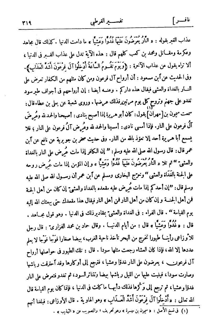 عَذَابِ الْقَبْرِ بِقَوْلِهِ:" النَّارُ يُعْرَضُونَ عَلَيْها غُدُوًّا وَعَشِيًّا" مَا دَامَتِ الدُّنْيَا. كَذَلِكَ قَالَ مُجَاهِدٌ وَعِكْرِمَةُ وَمُقَاتِلٌ وَمُحَمَّدُ بْنُ كَعْبٍ كُلُّهُمْ قَالَ: هَذِهِ الْآيَةُ تَدُلُّ عَلَى عَذَابِ الْقَبْرِ فِي الدُّنْيَا، أَلَا تَرَاهُ يَقُولُ عَنْ عَذَابِ الْآخِرَةِ:" وَيَوْمَ تَقُومُ السَّاعَةُ أَدْخِلُوا آلَ فِرْعَوْنَ أَشَدَّ الْعَذابِ". وَفِي الْحَدِيثِ عَنِ ابْنِ مَسْعُودٍ: أَنَّ أَرْوَاحَ آلِ فِرْعَوْنَ وَمَنْ كَانَ مِثْلَهُمْ مِنَ الْكُفَّارِ تُعْرَضُ عَلَى النَّارِ بِالْغَدَاةِ وَالْعَشِيِّ فَيُقَالُ هَذِهِ دَارُكُمْ. وَعَنْهُ أَيْضًا: إِنَّ أَرْوَاحَهُمْ فِي أَجْوَافِ طَيْرٍ سُودٍ تَغْدُو عَلَى جَهَنَّمَ وَتَرُوحُ كُلَّ يَوْمٍ مَرَّتَيْنِ فَذَلِكَ عَرْضُهَا. وَرَوَى شُعْبَةُ عَنْ يَعْلَى بْنِ عَطَاءٍ قَالَ: سَمِعْتُ مَيْمُونَ بْنَ مِهْرَانَ «١» يَقُولُ: كَانَ أَبُو هُرَيْرَةَ إِذَا أَصْبَحَ يُنَادِي: أَصْبَحْنَا وَالْحَمْدُ لِلَّهِ وَعُرِضَ آلُ فِرْعَوْنَ عَلَى النَّارِ. فَإِذَا أَمْسَى نَادَى: أَمْسَيْنَا وَالْحَمْدُ لِلَّهِ وَعُرِضَ آلُ فِرْعَوْنَ عَلَى النَّارِ، فَلَا يَسْمَعُ أَبَا هُرَيْرَةَ أَحَدٌ إِلَّا تَعَوَّذَ بِاللَّهِ مِنَ النَّارِ. وَفِي حَدِيثِ صَخْرِ بْنِ جُوَيْرِيَةَ عَنْ نَافِعٍ عَنِ ابْنِ عُمَرَ قَالَ: قَالَ رَسُولُ اللَّهِ صَلَّى اللَّهُ عَلَيْهِ وَسَلَّمَ:" إِنَّ الْكَافِرَ إِذَا مَاتَ عُرِضَ عَلَى النَّارِ بِالْغَدَاةِ وَالْعَشِيِّ ثُمَّ تَلَا:" النَّارُ يُعْرَضُونَ عَلَيْها غُدُوًّا وَعَشِيًّا" وَإِنَّ الْمُؤْمِنَ إِذَا مَاتَ عُرِضَ رُوحُهُ عَلَى الْجَنَّةِ بِالْغَدَاةِ وَالْعَشِيِّ" وَخَرَّجَ الْبُخَارِيُّ وَمُسْلِمٌ عَنِ ابْنِ عُمَرَ أَنَّ رَسُولَ اللَّهِ صَلَّى اللَّهُ عَلَيْهِ وَسَلَّمَ قَالَ:" إِنَّ أَحَدَكُمْ إِذَا مَاتَ عُرِضَ عَلَيْهِ مَقْعَدُهُ بِالْغَدَاةِ وَالْعَشِيِّ إِنْ كَانَ مِنْ أَهْلِ الْجَنَّةِ فَمِنْ أَهْلِ الْجَنَّةِ وَإِنْ كَانَ مِنْ أَهْلِ النَّارِ فَمِنْ أَهْلِ النَّارِ فَيُقَالُ هَذَا مَقْعَدُكَ حَتَّى يَبْعَثَكَ اللَّهُ إِلَيْهِ يَوْمَ الْقِيَامَةِ". قَالَ الْفَرَّاءُ: فِي الغداة والعشي بمقادير دلك فِي الدُّنْيَا. وَهُوَ قَوْلُ مُجَاهِدٍ. قَالَ:" غُدُوًّا وَعَشِيًّا" قَالَ: مِنْ أَيَّامِ الدُّنْيَا. وَقَالَ حَمَّادُ بْنُ مُحَمَّدٍ الْفَزَارِيُّ: قَالَ رَجُلٌ لِلْأَوْزَاعِيِّ رَأَيْنَا طُيُورًا تَخْرُجُ مِنَ الْبَحْرِ تَأْخُذُ نَاحِيَةَ الْغَرْبِ، بِيضًا صِغَارًا فَوْجًا فَوْجًا لَا يَعْلَمُ عَدَدَهَا إِلَّا اللَّهُ، فَإِذَا كَانَ الْعِشَاءَ رَجَعَتْ مِثْلَهَا سُودًا. قَالَ: تِلْكَ الطُّيُورُ فِي حَوَاصِلِهَا أَرْوَاحُ آلِ فِرْعَوْنَ، يُعْرَضُونَ عَلَى النَّارِ غُدُوًّا وَعَشِيًّا، فَتَرْجِعُ إِلَى أَوْكَارِهَا وَقَدِ احْتَرَقَتْ رِيَاشُهَا وَصَارَتْ سُودًا، فَيَنْبُتُ عَلَيْهَا مِنَ اللَّيْلِ رِيَاشُهَا بِيضًا وَتَتَنَاثَرُ السُّودُ، ثُمَّ تَغْدُو فَتُعْرَضُ عَلَى النَّارِ غُدُوًّا وَعَشِيًّا، ثُمَّ تَرْجِعُ إِلَى وَكْرِهَا فَذَلِكَ دَأْبُهَا مَا كَانَتْ فِي الدُّنْيَا، فَإِذَا كَانَ يَوْمَ الْقِيَامَةِ قَالَ اللَّهُ تَعَالَى:" أَدْخِلُوا آلَ فِرْعَوْنَ أَشَدَّ الْعَذابِ" وَهُوَ الْهَاوِيَةُ. قَالَ الْأَوْزَاعِيُّ: فبلغنا أنهم