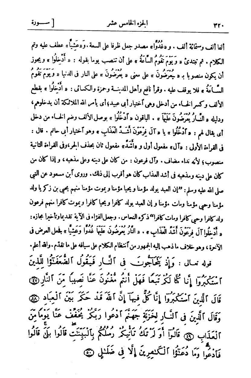وَإِذْ يَتَحاجُّونَ فِي النَّارِ فَيَقُولُ الضُّعَفاءُ لِلَّذِينَ اسْتَكْبَرُوا إِنَّا كُنَّا لَكُمْ تَبَعاً فَهَلْ أَنْتُمْ مُغْنُونَ عَنَّا نَصِيباً مِنَ النَّارِ (٤٧) قالَ الَّذِينَ اسْتَكْبَرُوا إِنَّا كُلٌّ فِيها إِنَّ اللَّهَ قَدْ حَكَمَ بَيْنَ الْعِبادِ (٤٨) وَقالَ الَّذِينَ فِي النَّارِ لِخَزَنَةِ جَهَنَّمَ ادْعُوا رَبَّكُمْ يُخَفِّفْ عَنَّا يَوْماً مِنَ الْعَذابِ (٤٩) قالُوا أَوَلَمْ تَكُ تَأْتِيكُمْ رُسُلُكُمْ بِالْبَيِّناتِ قالُوا بَلى قالُوا فَادْعُوا وَما دُعاءُ الْكافِرِينَ إِلاَّ فِي ضَلالٍ (٥٠)