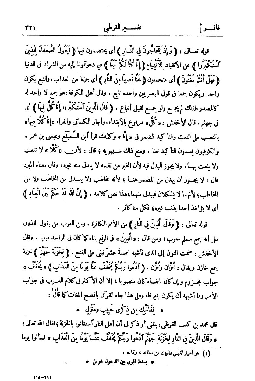 قَوْلُهُ تَعَالَى:" وَإِذْ يَتَحاجُّونَ فِي النَّارِ" أَيْ يَخْتَصِمُونَ فِيهَا" فَيَقُولُ الضُّعَفاءُ لِلَّذِينَ اسْتَكْبَرُوا" عَنِ الِانْقِيَادِ لِلْأَنْبِيَاءِ" إِنَّا كُنَّا لَكُمْ تَبَعاً" فِيمَا دَعَوْتُمُونَا إِلَيْهِ مِنَ الشِّرْكِ فِي الدُّنْيَا" فَهَلْ أَنْتُمْ مُغْنُونَ" أَيْ مُتَحَمِّلُونَ" عَنَّا نَصِيباً مِنَ النَّارِ" أي جزاء مِنَ الْعَذَابِ. وَالتَّبَعُ يَكُونُ وَاحِدًا وَيَكُونُ جَمْعًا فِي قَوْلِ الْبَصْرِيِّينَ وَاحِدُهُ تَابِعٌ. وَقَالَ أَهْلُ الْكُوفَةِ: هُوَ جَمْعٌ لَا وَاحِدَ لَهُ كَالْمَصْدَرِ فَلِذَلِكَ لَمْ يُجْمَعْ وَلَوْ جُمِعَ لَقِيلَ أَتْبَاعٌ." قالَ الَّذِينَ اسْتَكْبَرُوا إِنَّا كُلٌّ فِيها" أَيْ فِي جَهَنَّمَ. قَالَ الْأَخْفَشُ:" كُلٌّ" مَرْفُوعٌ بِالِابْتِدَاءِ. الْكِسَائِيُّ وَالْفَرَّاءُ" إِنَّا كُلًّا فِيهَا" بِالنَّصْبِ عَلَى النَّعْتِ وَالتَّأْكِيدِ لِلْمُضْمَرِ فِي" إِنَّا" وَكَذَلِكَ قَرَأَ ابْنُ السَّمَيْقَعِ وَعِيسَى بْنُ عُمَرَ وَالْكُوفِيُّونَ يُسَمُّونَ التَّأْكِيدَ نَعْتًا. وَمَنَعَ ذَلِكَ سِيبَوَيْهِ، قَالَ: لِأَنَّ" كُلًّا" لَا تُنْعَتُ وَلَا يُنْعَتُ بِهَا. وَلَا يَجُوزُ الْبَدَلُ فِيهِ لِأَنَّ الْمُخْبِرَ عَنْ نَفْسِهِ لَا يُبْدَلُ مِنْهُ غَيْرُهُ، وَقَالَ مَعْنَاهُ الْمُبَرِّدُ قَالَ: لَا يَجُوزُ أَنْ يُبْدَلَ مِنَ الْمُضْمَرِ هُنَا، لِأَنَّهُ مُخَاطَبٌ وَلَا يُبْدَلُ مِنَ الْمُخَاطَبِ وَلَا مِنَ الْمُخَاطِبِ، لِأَنَّهُمَا لَا يُشْكِلَانِ فَيُبْدَلُ مِنْهُمَا، هَذَا نَصُّ كَلَامِهِ." إِنَّ اللَّهَ قَدْ حَكَمَ بَيْنَ الْعِبادِ" أَيْ لَا يُؤَاخِذُ أَحَدًا بِذَنْبِ غَيْرِهِ، فَكُلٌّ مِنَّا كَافِرٌ. قَوْلُهُ تَعَالَى:" وَقالَ الَّذِينَ فِي النَّارِ" مِنَ الْأُمَمِ الْكَافِرَةِ. وَمِنَ الْعَرَبِ مَنْ يَقُولُ اللَّذُونَ عَلَى أَنَّهُ جَمْعٌ مُسَلَّمٌ مُعْرَبٌ، وَمَنْ قَالَ:" الَّذِينَ" فِي الرَّفْعِ بَنَاهُ كَمَا كَانَ فِي الْوَاحِدِ مَبْنِيًّا. وَقَالَ الْأَخْفَشُ: ضُمَّتِ النُّونُ إِلَى الَّذِي فَأَشْبَهَ خَمْسَةَ عَشَرَ فَبُنِيَ عَلَى الْفَتْحِ." لِخَزَنَةِ جَهَنَّمَ" خَزَنَةُ جَمْعُ خَازِنٍ وَيُقَالُ: خُزَّانٌ وَخُزَّنٌ." ادْعُوا رَبَّكُمْ يُخَفِّفْ عَنَّا يَوْماً مِنَ الْعَذابِ"" يُخَفِّفْ" جَوَابٌ مَجْزُومٌ وَإِنْ كَانَ بِالْفَاءِ كَانَ مَنْصُوبًا، إِلَّا أَنَّ الْأَكْثَرَ فِي كَلَامِ الْعَرَبِ فِي جَوَابِ الْأَمْرِ وَمَا أَشْبَهَهُ أَنْ يَكُونَ بِغَيْرِ فَاءٍ وَعَلَى هَذَا جَاءَ الْقُرْآنُ بِأَفْصَحِ اللُّغَاتِ كما قال «١»: