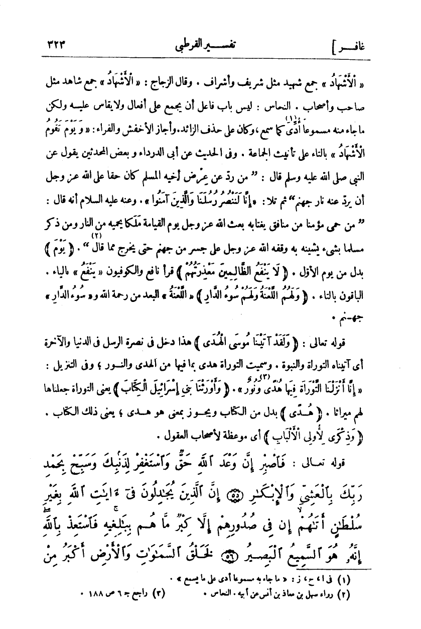 " الْأَشْهادُ" جَمْعُ شَهِيدٍ مِثْلَ شَرِيفٍ وَأَشْرَافٍ. وَقَالَ الزَّجَّاجُ:" الْأَشْهادُ" جَمْعُ شَاهِدٍ مِثْلُ صَاحِبٍ وَأَصْحَابٍ. النَّحَّاسُ: لَيْسَ بَابُ فَاعِلٍ أَنْ يُجْمَعَ عَلَى أَفْعَالٍ وَلَا يُقَاسُ عَلَيْهِ وَلَكِنْ مَا جَاءَ مِنْهُ مَسْمُوعًا أُدِّيَ كَمَا سُمِعَ، وَكَانَ عَلَى حَذْفِ الزَّائِدِ. وَأَجَازَ الْأَخْفَشُ وَالْفَرَّاءُ:" وَيَوْمَ تَقُومُ الْأَشْهَادُ" بِالتَّاءِ عَلَى تَأْنِيثِ الْجَمَاعَةِ. وَفِي الْحَدِيثِ عَنْ أَبِي الدَّرْدَاءِ وَبَعْضُ الْمُحَدِّثِينَ يَقُولُ عَنِ النَّبِيِّ صَلَّى اللَّهُ عَلَيْهِ وَسَلَّمَ قَالَ:" من رَدَّ عَنْ عِرْضِ أَخِيهِ الْمُسْلِمِ كَانَ حَقًّا عَلَى اللَّهِ عَزَّ وَجَلَّ أَنْ يَرُدَّ عَنْهُ نَارَ جَهَنَّمَ" ثُمَّ تَلَا:" إِنَّا لَنَنْصُرُ رُسُلَنا وَالَّذِينَ آمَنُوا". وَعَنْهُ عَلَيْهِ السَّلَامُ أَنَّهُ قَالَ:" مَنْ حَمَى مُؤْمِنًا مِنْ مُنَافِقٍ يَغْتَابُهُ بَعَثَ اللَّهُ عَزَّ وَجَلَّ يَوْمَ الْقِيَامَةِ مَلَكًا يَحْمِيهِ مِنَ النَّارِ وَمَنْ ذَكَرَ مُسْلِمًا بِشَيْءٍ يَشِينُهُ بِهِ وَقَفَهُ اللَّهُ عَزَّ وَجَلَّ عَلَى جِسْرٍ مِنْ جَهَنَّمَ حَتَّى يَخْرُجَ مِمَّا قَالَ" «١»." يَوْمَ" بَدَلٌ مِنْ يَوْمَ الْأَوَّلِ." لَا يَنْفَعُ الظَّالِمِينَ مَعْذِرَتُهُمْ" قَرَأَ نَافِعٌ وَالْكُوفِيُّونَ" يَنْفَعُ" بِالْيَاءِ. الْبَاقُونَ بِالتَّاءِ." وَلَهُمُ اللَّعْنَةُ وَلَهُمْ سُوءُ الدَّارِ" اللَّعْنَةُ" الْبُعْدُ مِنْ رَحْمَةِ اللَّهِ وَ" سُوءُ الدَّارِ" جَهَنَّمُ. قَوْلُهُ تَعَالَى:" وَلَقَدْ آتَيْنا مُوسَى الْهُدى " هَذَا دَخَلَ فِي نُصْرَةِ الرُّسُلِ فِي الدُّنْيَا وَالْآخِرَةِ أَيْ آتَيْنَاهُ التَّوْرَاةَ وَالنُّبُوَّةَ. وَسُمِّيَتِ التَّوْرَاةُ هُدًى بِمَا فِيهَا مِنَ الْهُدَى وَالنُّورِ، وَفِي التَّنْزِيلِ:" إِنَّا أَنْزَلْنَا التَّوْراةَ فِيها هُدىً وَنُورٌ" [المائدة: ٤٤]." وَأَوْرَثْنا بَنِي إِسْرائِيلَ الْكِتابَ" يَعْنِي التَّوْرَاةَ جَعَلْنَاهَا لَهُمْ مِيرَاثًا." هُدىً" بَدَلٌ مِنَ الْكِتَابِ وَيَجُوزُ بِمَعْنَى هُوَ هُدًى، يَعْنِي ذَلِكَ الْكِتَابَ." وَذِكْرى لِأُولِي الْأَلْبابِ" أي موعظة لأصحاب العقول.