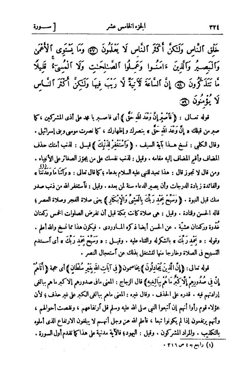 قَوْلُهُ تَعَالَى:" فَاصْبِرْ إِنَّ وَعْدَ اللَّهِ حَقٌّ" أَيْ فَاصْبِرْ يَا مُحَمَّدُ عَلَى أَذَى الْمُشْرِكِينَ، كَمَا صَبَرَ مَنْ قَبْلَكَ" إِنَّ وَعْدَ اللَّهِ حَقٌّ" بِنَصْرِكَ وَإِظْهَارِكَ، كَمَا نَصَرْتُ مُوسَى وَبَنِي إِسْرَائِيلَ. وَقَالَ الْكَلْبِيُّ: نُسِخَ هَذَا بِآيَةِ السَّيْفِ." وَاسْتَغْفِرْ لِذَنْبِكَ" قِيلَ: لِذَنْبِ أُمَّتِكَ حُذِفَ الْمُضَافُ وَأُقِيمَ الْمُضَافُ إِلَيْهِ مَقَامَهُ. وَقِيلَ: لِذَنْبِ نَفْسِكَ عَلَى مَنْ يُجَوِّزُ الصَّغَائِرَ عَلَى الْأَنْبِيَاءِ. وَمَنْ قَالَ لَا تَجُوزُ قَالَ: هَذَا تَعَبُّدٌ لِلنَّبِيِّ عَلَيْهِ السَّلَامُ بِدُعَاءٍ، كَمَا قَالَ تَعَالَى:" وَآتِنا ما وَعَدْتَنا" [آل عمران: ١٩٤] وَالْفَائِدَةُ زِيَادَةُ الدَّرَجَاتِ وَأَنْ يَصِيرَ الدُّعَاءُ سُنَّةً لِمَنْ بَعْدَهُ. وَقِيلَ: فَاسْتَغْفِرِ اللَّهَ مِنْ ذَنْبٍ صَدَرَ مِنْكَ قَبْلَ النُّبُوَّةِ." وَسَبِّحْ بِحَمْدِ رَبِّكَ بِالْعَشِيِّ وَالْإِبْكَارِ" يَعْنِي صَلَاةَ الْفَجْرِ وَصَلَاةَ الْعَصْرِ، قال الْحَسَنُ وَقَتَادَةُ. وَقِيلَ: هِيَ صَلَاةٌ كَانَتْ بِمَكَّةَ قَبْلَ أَنْ تُفْرَضَ الصَّلَوَاتُ الْخَمْسُ رَكْعَتَانِ غُدْوَةً وركعتا عَشِيَّةً. عَنِ الْحَسَنِ أَيْضًا ذَكَرَهُ الْمَاوَرْدِيُّ. فَيَكُونُ هَذَا مِمَّا نُسِخَ وَاللَّهُ أَعْلَمُ. وَقَوْلُهُ:" بِحَمْدِ رَبِّكَ" بِالشُّكْرِ لَهُ وَالثَّنَاءِ عَلَيْهِ. وَقِيلَ:" وَسَبِّحْ بِحَمْدِ رَبِّكَ" أَيِ اسْتَدِمِ التَّسْبِيحَ فِي الصَّلَاةِ وَخَارِجًا مِنْهَا لِتَشْتَغِلَ بِذَلِكَ عَنِ اسْتِعْجَالِ النَّصْرِ. قَوْلُهُ تَعَالَى:" إِنَّ الَّذِينَ يُجادِلُونَ" يُخَاصِمُونَ" فِي آياتِ اللَّهِ بِغَيْرِ سُلْطانٍ" أَيْ حُجَّةٍ" أَتاهُمْ إِنْ فِي صُدُورِهِمْ إِلَّا كِبْرٌ مَا هُمْ بِبالِغِيهِ" قَالَ الزَّجَّاجُ: الْمَعْنَى مَا فِي صُدُورِهِمْ إِلَّا كِبْرٌ مَا هُمْ بِبَالِغِي إِرَادَتِهِمْ فِيهِ. قَدَّرَهُ عَلَى الْحَذْفِ. وَقَالَ غَيْرُهُ: الْمَعْنَى مَا هُمْ بِبَالِغِي الْكِبْرِ عَلَى غَيْرِ حَذْفٍ، لِأَنَّ هؤلاء قرأوا أَنَّهُمْ إِنِ اتَّبَعُوا النَّبِيَّ صَلَّى اللَّهُ عَلَيْهِ وَسَلَّمَ قَلَّ ارْتِفَاعُهُمْ، وَنَقَصَتْ أَحْوَالُهُمْ، وَأَنَّهُمْ يَرْتَفِعُونَ إِذَا لَمْ يَكُونُوا تَبَعًا، فَأَعْلَمَ اللَّهُ عَزَّ وَجَلَّ أَنَّهُمْ لَا يَبْلُغُونَ الِارْتِفَاعَ الَّذِي أَمَّلُوهُ بِالتَّكْذِيبِ. وَالْمُرَادُ الْمُشْرِكُونَ. وَقِيلَ: الْيَهُودُ، فَالْآيَةُ مَدَنِيَّةٌ على هذا كما تقدم أول السور.