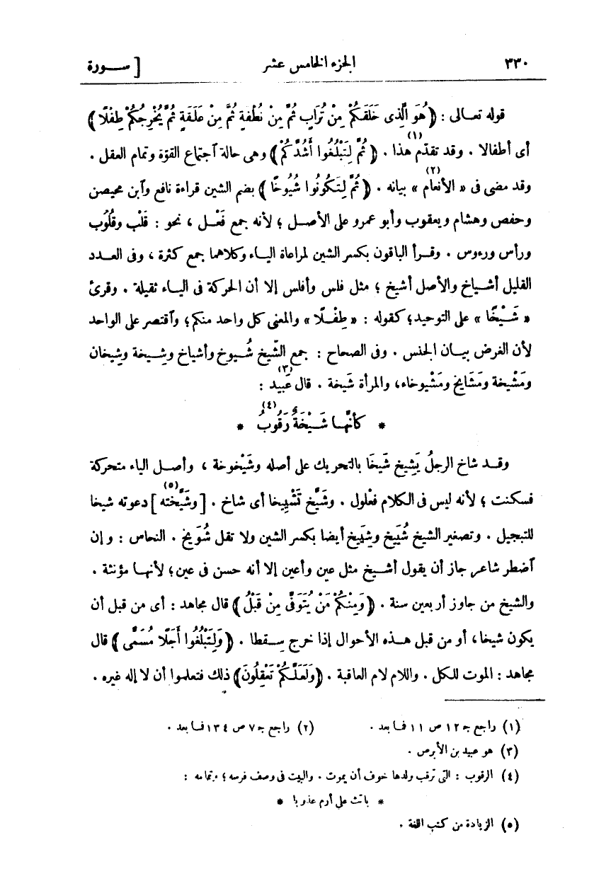 وَقَدْ شَاخَ الرَّجُلُ يَشِيخُ شَيَخًا بِالتَّحْرِيكِ عَلَى أَصْلِهِ وَشَيْخُوخَةً، وَأَصْلُ الْيَاءِ مُتَحَرِّكَةٌ فَسُكِّنَتْ، لِأَنَّهُ لَيْسَ فِي الْكَلَامِ فَعَلُولٌ. وَشَيَّخَ تَشْيِيخًا أَيْ شَاخَ. وَشَيَّخْتُهُ «٥» دَعَوْتُهُ شَيْخًا لِلتَّبْجِيلِ. وَتَصْغِيرُ الشَّيْخِ شُيَيْخٌ وَشِيَيْخٌ أَيْضًا بِكَسْرِ الشِّينِ وَلَا تَقُلْ شُوَيْخٌ النَّحَّاسُ: وَإِنِ اضْطُرَّ شَاعِرٌ جَازَ أَنْ يَقُولَ أَشْيُخٌ مِثْلَ عَيْنٍ وَأَعْيُنٌ إِلَّا أَنَّهُ حَسَنٌ فِي عَيْنٍ، لِأَنَّهَا مُؤَنَّثَةٌ. وَالشَّيْخُ مَنْ جَاوَزَ أَرْبَعِينَ سَنَةً." وَمِنْكُمْ مَنْ يُتَوَفَّى مِنْ قَبْلُ" قَالَ مُجَاهِدٌ: أَيْ مِنْ قَبْلِ أَنْ يَكُونَ شَيْخًا، أَوْ مِنْ قَبْلِ هَذِهِ الْأَحْوَالِ إِذَا خَرَجَ سِقْطًا." وَلِتَبْلُغُوا أَجَلًا مُسَمًّى" قَالَ مُجَاهِدٌ: الْمَوْتُ لِلْكُلِّ. وَاللَّامُ لَامُ الْعَاقِبَةِ." وَلَعَلَّكُمْ تَعْقِلُونَ" ذَلِكَ فَتَعْلَمُوا أَنْ لا إله غيره.