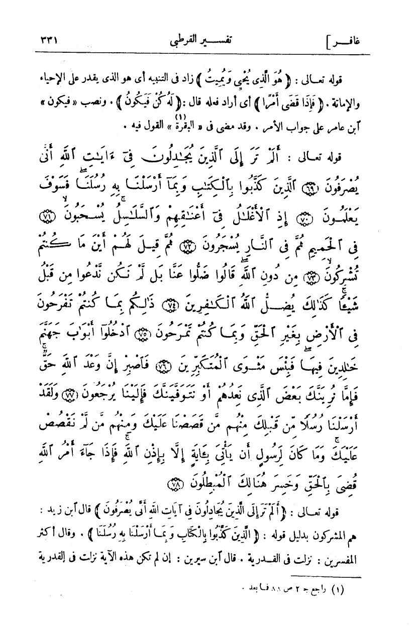 أَلَمْ تَرَ إِلَى الَّذِينَ يُجادِلُونَ فِي آياتِ اللَّهِ أَنَّى يُصْرَفُونَ (٦٩) الَّذِينَ كَذَّبُوا بِالْكِتابِ وَبِما أَرْسَلْنا بِهِ رُسُلَنا فَسَوْفَ يَعْلَمُونَ (٧٠) إِذِ الْأَغْلالُ فِي أَعْناقِهِمْ وَالسَّلاسِلُ يُسْحَبُونَ (٧١) فِي الْحَمِيمِ ثُمَّ فِي النَّارِ يُسْجَرُونَ (٧٢) ثُمَّ قِيلَ لَهُمْ أَيْنَ مَا كُنْتُمْ تُشْرِكُونَ (٧٣)