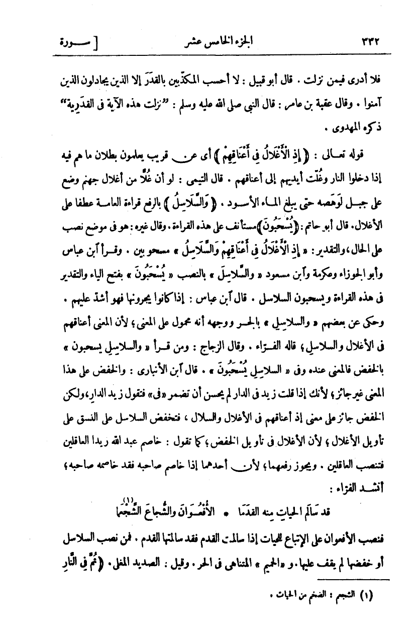 فَلَا أَدْرِي فِيمَنْ نَزَلَتْ. قَالَ أَبُو قَبِيلٍ: لَا أَحْسِبُ الْمُكَذِّبِينَ بِالْقَدَرِ إِلَّا الَّذِينَ يُجَادِلُونَ الَّذِينَ آمَنُوا. وَقَالَ عُقْبَةُ بْنُ عَامِرٍ: قَالَ النَّبِيُّ صَلَّى اللَّهُ عَلَيْهِ وَسَلَّمَ:" نَزَلَتْ هَذِهِ الْآيَةُ فِي الْقَدَرِيَّةِ" ذَكَرَهُ الْمَهْدَوِيُّ. قَوْلُهُ تَعَالَى:" إِذِ الْأَغْلالُ فِي أَعْناقِهِمْ" أَيْ عَنْ قَرِيبٍ يَعْلَمُونَ بُطْلَانَ مَا هُمْ فِيهِ إِذَا دَخَلُوا النَّارَ وَغُلَّتْ أَيْدِيهِمْ إِلَى أَعْنَاقِهِمْ. قَالَ التَّيْمِيُّ: لَوْ أَنَّ غُلًّا مِنْ أَغْلَالِ جَهَنَّمَ وُضِعَ عَلَى جَبَلٍ لَوَهَصَهُ حَتَّى يَبْلُغَ الْمَاءَ الْأَسْوَدَ." وَالسَّلَاسِلُ" بِالرَّفْعِ قِرَاءَةُ الْعَامَّةِ عَطْفًا عَلَى الْأَغْلَالِ. قَالَ أَبُو حَاتِمٍ:" يُسْحَبُونَ" مُسْتَأْنَفٌ عَلَى هَذِهِ الْقِرَاءَةِ. وَقَالَ غَيْرُهُ: هُوَ فِي مَوْضِعِ نَصْبٍ عَلَى الْحَالِ، وَالتَّقْدِيرُ:" إِذِ الْأَغْلالُ فِي أَعْناقِهِمْ وَالسَّلاسِلُ" مَسْحُوبِينَ. وَقَرَأَ ابْنُ عَبَّاسٍ وَأَبُو الْجَوْزَاءِ وَعِكْرِمَةُ وَابْنُ مَسْعُودٍ" وَالسَّلاسِلُ" بِالنَّصْبِ" يُسْحَبُونَ" بِفَتْحِ الْيَاءِ وَالتَّقْدِيرُ فِي هَذِهِ الْقِرَاءَةِ وَيَسْحَبُونَ السَّلَاسِلَ. قَالَ ابْنُ عَبَّاسٍ: إِذَا كَانُوا يَجُرُّونَهَا فَهُوَ أَشَدُّ عَلَيْهِمْ. وَحُكِيَ عَنْ بَعْضِهِمْ" وَالسَّلَاسِلِ" بِالْجَرِّ وَوَجْهُهُ أَنَّهُ مَحْمُولٌ عَلَى الْمَعْنَى، لِأَنَّ الْمَعْنَى أعناقهم في الأغلال والسلاسل، قال الْفَرَّاءُ. وَقَالَ الزَّجَّاجُ: وَمَنْ قَرَأَ" وَالسَّلَاسِلِ يُسْحَبُونَ" بِالْخَفْضِ فَالْمَعْنَى عِنْدَهُ وَفِي" السَّلَاسِلِ يُسْحَبُونَ". قَالَ ابْنُ الْأَنْبَارِيِّ: وَالْخَفْضُ عَلَى هَذَا الْمَعْنَى غَيْرُ جَائِزٍ، لِأَنَّكَ إِذَا قُلْتَ زَيْدٌ فِي الدَّارِ لَمْ يَحْسُنْ أَنْ تُضْمِرَ" فِي" فَتَقُولَ زَيْدٌ الدَّارِ، وَلَكِنَّ الْخَفْضَ جَائِزٌ. عَلَى مَعْنَى إِذْ أَعْنَاقُهُمْ فِي الْأَغْلَالِ وَالسَّلَاسِلِ، فَتَخْفِضُ السَّلَاسِلَ عَلَى النَّسَقِ عَلَى تَأْوِيلِ الْأَغْلَالِ، لِأَنَّ الْأَغْلَالَ فِي تَأْوِيلِ الْخَفْضِ، كَمَا تَقُولُ: خَاصَمَ عَبْدُ اللَّهِ زَيْدًا الْعَاقِلَيْنِ فَتَنْصِبُ الْعَاقِلَيْنِ. وَيَجُوزُ رَفْعُهُمَا، لِأَنَّ أَحَدَهُمَا إِذَا خَاصَمَ صَاحِبَهُ فَقَدْ خَاصَمَهُ صَاحِبُهُ، أنشد الفراء: