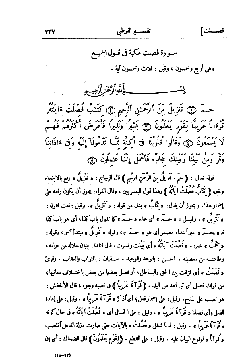 حم (١) تَنْزِيلٌ مِنَ الرَّحْمنِ الرَّحِيمِ (٢) كِتابٌ فُصِّلَتْ آياتُهُ قُرْآناً عَرَبِيًّا لِقَوْمٍ يَعْلَمُونَ (٣) بَشِيراً وَنَذِيراً فَأَعْرَضَ أَكْثَرُهُمْ فَهُمْ لَا يَسْمَعُونَ (٤)