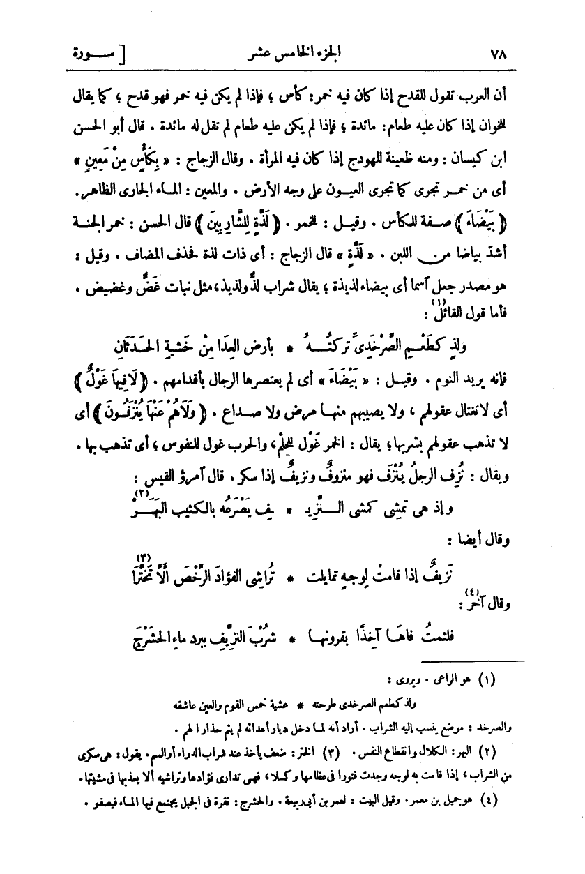 أَنَّ الْعَرَبَ تَقُولُ لِلْقَدَحِ إِذَا كَانَ فِيهِ خَمْرٌ: كَأْسٌ، فَإِذَا لَمْ يَكُنْ فِيهِ خَمْرٌ فَهُوَ قَدَحٌ، كَمَا يُقَالُ لِلْخِوَانِ إِذَا كَانَ عَلَيْهِ طَعَامٌ: مَائِدَةٌ، فَإِذَا لَمْ يَكُنْ عَلَيْهِ طَعَامٌ لَمْ تَقُلْ لَهُ مَائِدَةٌ. قَالَ أَبُو الحسن ابن كَيْسَانَ: وَمِنْهُ ظَعِينَةٌ لِلْهَوْدَجِ إِذَا كَانَ فِيهِ الْمَرْأَةُ. وَقَالَ الزَّجَّاجُ:" بِكَأْسٍ مِنْ مَعِينٍ" أَيْ مِنْ خَمْرٍ تَجْرِي كَمَا تَجْرِي الْعُيُونُ عَلَى وَجْهِ الْأَرْضِ. وَالْمَعِينُ: الْمَاءُ الْجَارِي الظَّاهِرُ." بَيْضاءَ" صِفَةٌ لِلْكَأْسِ. وَقِيلَ: لِلْخَمْرِ." لَذَّةٍ لِلشَّارِبِينَ" قَالَ الْحَسَنُ: خَمْرُ الْجَنَّةِ أَشَدُّ بَيَاضًا مِنَ اللَّبَنِ." لَذَّةٍ" قَالَ الزَّجَّاجُ: أَيْ ذَاتِ لَذَّةٍ فَحُذِفَ الْمُضَافُ. وَقِيلَ: هُوَ مَصْدَرٌ جُعِلَ اسْمًا أَيْ بيضا لَذِيذَةٌ، يُقَالُ شَرَابٌ لَذٌّ وَلَذِيذٌ، مِثْلَ نَبَاتٍ غض وغضيض. فأما قول القائل «١»: