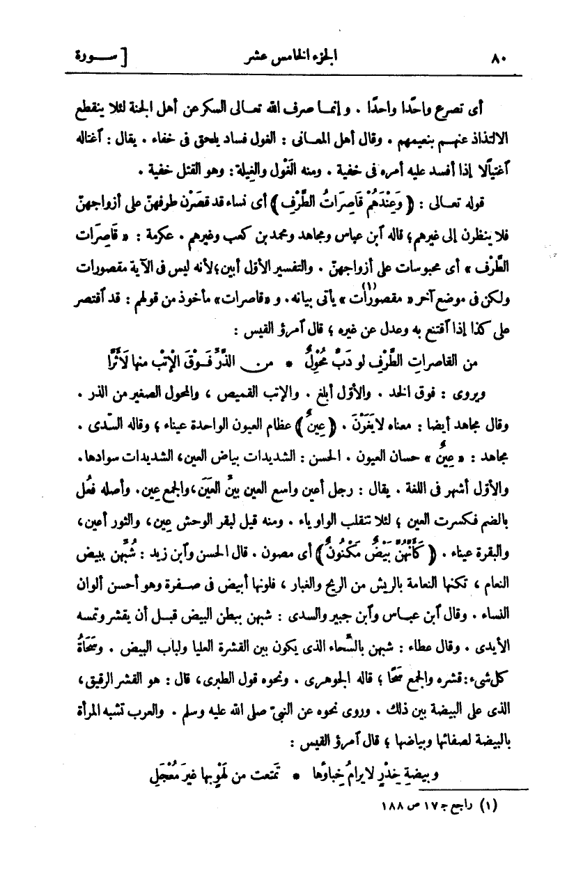 وَيُرْوَى: فَوْقَ الْخَدِّ. وَالْأَوَّلُ أَبْلَغُ. وَالْإِتْبُ الْقَمِيصُ، وَالْمُحْوِلُ الصَّغِيرُ مِنَ الذَّرِّ. وَقَالَ مُجَاهِدٌ أَيْضًا: مَعْنَاهُ لَا يغرن." عِينٌ" عظام العيون الواحدة عيناء،، وقال السُّدِّيُّ. مُجَاهِدٌ:" عِينٌ" حِسَانُ الْعُيُونِ. الْحَسَنُ: الشَّدِيدَاتُ بياض العين، الشديد أت سَوَادِهَا. وَالْأَوَّلُ أَشْهَرُ فِي اللُّغَةِ. يُقَالُ: رَجُلٌ أَعْيَنُ وَاسِعُ الْعَيْنِ بَيِّنُ الْعَيْنِ، وَالْجَمْعُ عِينٌ. وَأَصْلُهُ فُعْلٌ بِالضَّمِّ فَكُسِرَتِ الْعَيْنُ، لِئَلَّا تَنْقَلِبَ الْوَاوُ يَاءً. وَمِنْهُ قِيلَ لِبَقَرِ الْوَحْشِ عِينٌ، وَالثَّوْرُ أَعْيَنُ، وَالْبَقَرَةُ عَيْنَاءُ." كَأَنَّهُنَّ بَيْضٌ مَكْنُونٌ" أَيْ مَصُونٌ. قَالَ الْحَسَنُ وَابْنُ زَيْدٍ: شُبِّهْنَ بِبَيْضِ النَّعَامِ، تُكِنُّهَا النَّعَامَةُ بِالرِّيشِ مِنَ الرِّيحِ والغبار، فلونها أبيض في صفرة وهو حسن أَلْوَانِ النِّسَاءِ. وَقَالَ ابْنُ عَبَّاسٍ وَابْنُ جُبَيْرٍ وَالسُّدِّيِّ: شُبِّهْنَ بِبَطْنِ الْبَيْضِ قَبْلَ أَنْ يُقَشَّرَ وَتَمَسَّهُ الْأَيْدِي. وَقَالَ عَطَاءٌ: شُبِّهْنَ بِالسِّحَاءِ الَّذِي يكون بين القشر ة العليا ولباب البيض. وسحاة كل شي: قِشْرُهُ وَالْجَمْعُ سَحًا، قَالَهُ الْجَوْهَرِيُّ. وَنَحْوَهُ قَوْلُ الطَّبَرِيِّ، قَالَ: هُوَ الْقِشْرُ الرَّقِيقُ، الَّذِي عَلَى الْبَيْضَةِ بَيْنَ ذَلِكَ. وَرُوِيَ نَحْوَهُ عَنِ النَّبِيِّ صَلَّى اللَّهُ عَلَيْهِ وَسَلَّمَ. وَالْعَرَبُ تُشَبِّهُ الْمَرْأَةَ بِالْبَيْضَةِ لِصَفَائِهَا وَبَيَاضِهَا، قَالَ امْرُؤُ الْقَيْسِ: