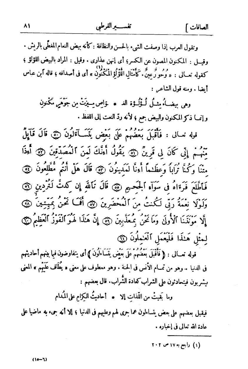 فَأَقْبَلَ بَعْضُهُمْ عَلى بَعْضٍ يَتَساءَلُونَ (٥٠) قالَ قائِلٌ مِنْهُمْ إِنِّي كانَ لِي قَرِينٌ (٥١) يَقُولُ أَإِنَّكَ لَمِنَ الْمُصَدِّقِينَ (٥٢) أَإِذا مِتْنا وَكُنَّا تُراباً وَعِظاماً أَإِنَّا لَمَدِينُونَ (٥٣) قالَ هَلْ أَنْتُمْ مُطَّلِعُونَ (٥٤)