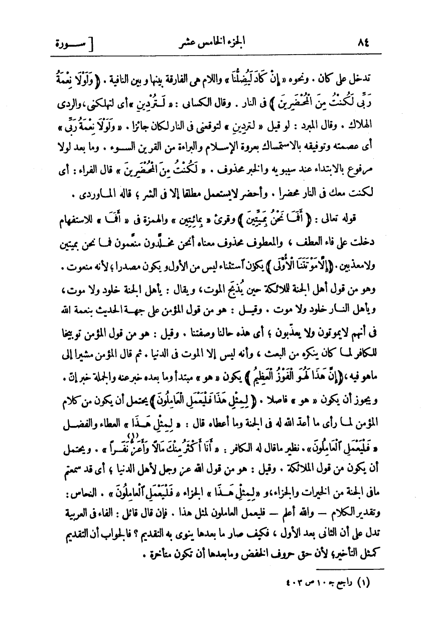 تَدْخُلُ عَلَى كَانَ. وَنَحْوَهُ" إِنْ كادَ لَيُضِلُّنا" [الفرقان: ٢٤] واللام هي الفارقة بينها وبين النافية." وَلَوْلا نِعْمَةُ رَبِّي لَكُنْتُ مِنَ الْمُحْضَرِينَ" في النار وَقَالَ الْكِسَائِيُّ:" لَتُرْدِينِ" أَيْ لَتُهْلِكُنِي، وَالرَّدَى الْهَلَاكُ. وَقَالَ الْمُبَرِّدُ: لَوْ قِيلَ:" لَتُرْدِينِ" لَتُوقِعُنِي فِي النار لكان جائزا" وَلَوْلا نِعْمَةُ رَبِّي" أَيْ عِصْمَتُهُ وَتَوْفِيقُهُ بِالِاسْتِمْسَاكِ بِعُرْوَةِ الْإِسْلَامِ وَالْبَرَاءَةِ مِنَ الْقَرِينِ السُّوءِ. وَمَا بَعْدَ لَوْلَا مَرْفُوعٌ بِالِابْتِدَاءِ عِنْدَ سِيبَوَيْهِ وَالْخَبَرُ مَحْذُوفٌ." لَكُنْتُ مِنَ الْمُحْضَرِينَ" قَالَ الْفَرَّاءُ: أَيْ لَكُنْتُ مَعَكَ فِي النَّارِ مُحْضَرًا. وَأَحْضَرَ لَا يُسْتَعْمَلُ مُطْلَقًا إِلَّا فِي الشَّرِّ، قَالَهُ الْمَاوَرْدِيُّ. قَوْلُهُ تعالى:" أَفَما نَحْنُ بِمَيِّتِينَ" وقرى" بِمَائِتِينَ" وَالْهَمْزَةُ فِي" أَفَما" لِلِاسْتِفْهَامِ دَخَلَتْ عَلَى فَاءِ الْعَطْفِ، وَالْمَعْطُوفُ مَحْذُوفٌ مَعْنَاهُ أَنَحْنُ مُخَلَّدُونَ مُنَعَّمُونَ فَمَا نَحْنُ بِمَيِّتِينَ وَلَا مُعَذَّبِينَ." إِلَّا مَوْتَتَنَا الْأُولى " يَكُونُ اسْتِثْنَاءً لَيْسَ مِنَ الْأَوَّلِ وَيَكُونُ مَصْدَرًا، لِأَنَّهُ مَنْعُوتٌ. وَهُوَ مِنْ قَوْلِ أَهْلِ الْجَنَّةِ لِلْمَلَائِكَةِ حِينَ يُذْبَحُ الْمَوْتُ، وَيُقَالُ: يَا أَهْلَ الْجَنَّةِ خُلُودٌ وَلَا مَوْتَ، وَيَا أَهْلَ النَّارِ خُلُودٌ وَلَا مَوْتَ. وَقِيلَ: هُوَ مِنْ قَوْلِ الْمُؤْمِنِ عَلَى جِهَةِ الْحَدِيثِ بِنِعْمَةِ اللَّهِ فِي أَنَّهُمْ لَا يَمُوتُونَ وَلَا يُعَذَّبُونَ، أَيْ هَذِهِ حَالُنَا وَصِفَتُنَا. وَقِيلَ: هُوَ مِنْ قَوْلِ الْمُؤْمِنِ تَوْبِيخًا لِلْكَافِرِ لِمَا كَانَ يُنْكِرُهُ مِنَ الْبَعْثِ، وَأَنَّهُ لَيْسَ إِلَّا الْمَوْتُ فِي الدُّنْيَا. ثُمَّ قَالَ الْمُؤْمِنُ مُشِيرًا إِلَى مَا هُوَ فِيهِ،" إِنَّ هَذَا لَهُوَ الْفَوْزُ الْعَظِيمُ" يَكُونُ" هُوَ" مُبْتَدَأٌ وَمَا بَعْدَهُ خَبَرٌ عَنْهُ وَالْجُمْلَةُ خَبَرُ إِنَّ. وَيَجُوزُ أَنْ يَكُونَ" هُوَ" فَاصِلًا." لِمِثْلِ هَذَا فَلْيَعْمَلِ الْعامِلُونَ" يَحْتَمِلُ أَنْ يَكُونَ مِنْ كَلَامِ الْمُؤْمِنِ لَمَّا رَأَى مَا أَعَدَّ اللَّهُ لَهُ فِي الْجَنَّةِ وَمَا أَعْطَاهُ قَالَ:" لِمِثْلِ هَذَا" الْعَطَاءِ وَالْفَضْلِ" فَلْيَعْمَلِ الْعامِلُونَ" نَظِيرَ مَا قَالَ لَهُ الْكَافِرُ" أَنَا أَكْثَرُ مِنْكَ مَالًا وَأَعَزُّ نَفَراً" [الكهف: ٣٤]. وَيَحْتَمِلُ أَنْ يَكُونَ مِنْ قَوْلِ الْمَلَائِكَةِ. وَقِيلَ: هُوَ مِنْ قَوْلِ اللَّهِ عَزَّ وَجَلَّ لِأَهْلِ الدُّنْيَا، أَيْ قَدْ سَمِعْتُمْ مَا فِي الْجَنَّةِ مِنَ الْخَيْرَاتِ وَالْجَزَاءِ، وَ" لِمِثْلِ هَذَا" الْجَزَاءِ" فَلْيَعْمَلِ الْعامِلُونَ". النَّحَّاسُ: وَتَقْدِيرُ الْكَلَامِ- وَاللَّهُ أَعْلَمُ- فَلْيَعْمَلِ الْعَامِلُونَ لِمِثْلِ هَذَا. فَإِنْ قَالَ قَائِلٌ: الْفَاءُ فِي الْعَرَبِيَّةِ تَدُلُّ عَلَى أَنَّ الثَّانِي بعد الأول، فكيف صار ما بعدها ينو ى بِهِ التَّقْدِيمُ؟ فَالْجَوَابُ أَنَّ التَّقْدِيمَ كَمِثْلِ التَّأْخِيرِ، لِأَنَّ حَقَّ حُرُوفِ الْخَفْضِ وَمَا بَعْدَهَا أَنْ تكون متأخرة.