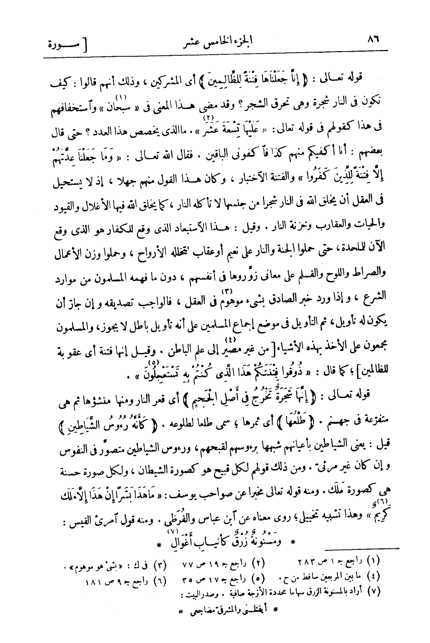 قَوْلُهُ تَعَالَى:" إِنَّا جَعَلْناها فِتْنَةً لِلظَّالِمِينَ" أَيِ الْمُشْرِكِينَ، وَذَلِكَ أَنَّهُمْ قَالُوا: كَيْفَ تَكُونُ فِي النَّارِ شَجَرَةٌ وَهِيَ تُحْرِقُ الشَّجَرَ؟ وَقَدْ مَضَى هَذَا الْمَعْنَى فِي" سُبْحَانَ" «١» وَاسْتِخْفَافُهُمْ فِي هَذَا كَقَوْلِهِمْ فِي قَوْلِهِ تَعَالَى:" عَلَيْها تِسْعَةَ عَشَرَ" [المدثر: ٣٠]. مَا الَّذِي يُخَصِّصُ هَذَا الْعَدَد؟ حَتَّى قَالَ بَعْضُهُمْ: أَنَا أَكْفِيكُمْ مِنْهُمْ كَذَا فَاكْفُونِي الْبَاقِينَ. فَقَالَ اللَّهُ تَعَالَى:" وَما جَعَلْنا عِدَّتَهُمْ إِلَّا فِتْنَةً لِلَّذِينَ كَفَرُوا" [المدثر: ٣١] وَالْفِتْنَةُ الِاخْتِبَارُ، وَكَانَ هَذَا الْقَوْلُ مِنْهُمْ جَهْلًا، إِذْ لَا يَسْتَحِيلُ فِي الْعَقْلِ أَنْ يَخْلُقَ اللَّهُ فِي النَّارِ شَجَرًا مِنْ جِنْسِهَا لَا تَأْكُلُهُ النَّارُ، كَمَا يَخْلُقُ اللَّهُ فِيهَا الْأَغْلَالَ وَالْقُيُودَ وَالْحَيَّاتِ وَالْعَقَارِبَ وَخَزَنَةَ النَّارِ. وَقِيلَ: هَذَا الِاسْتِبْعَادُ الَّذِي وَقَعَ لِلْكُفَّارِ هُوَ الَّذِي وَقَعَ الْآنَ لِلْمُلْحِدَةِ، حَتَّى حَمَلُوا الْجَنَّةَ وَالنَّارَ عَلَى نَعِيمٍ أَوْ عِقَابٍ تَتَخَلَّلُهُ الْأَرْوَاحُ، وَحَمَلُوا وَزْنَ الأعمال والصراط واللوح والقلم على معاني زَوَّرُوهَا فِي أَنْفُسِهِمْ، دُونَ مَا فَهِمَهُ الْمُسْلِمُونَ مِنْ مَوَارِدِ الشَّرْعِ، وَإِذَا وَرَدَ خَبَرُ الصَّادِقِ بِشَيْءٍ مَوْهُومٍ فِي الْعَقْلِ، فَالْوَاجِبُ تَصْدِيقُهُ وَإِنْ جَازَ أَنْ يَكُونَ لَهُ تَأْوِيلٌ، ثُمَّ التَّأْوِيلُ فِي مَوْضِعِ إِجْمَاعِ الْمُسْلِمِينَ عَلَى أَنَّهُ تَأْوِيلٌ بَاطِلٌ لَا يَجُوزُ، وَالْمُسْلِمُونَ مُجْمِعُونَ عَلَى الْأَخْذِ بِهَذِهِ الْأَشْيَاءِ مِنْ غَيْرِ مَصِيرٍ إِلَى عِلْمِ الْبَاطِنِ. وَقِيلَ إِنَّهَا فِتْنَةٌ أَيْ عُقُوبَةٌ لِلظَّالِمِينَ، كَمَا قَالَ:" ذُوقُوا فِتْنَتَكُمْ هذَا الَّذِي كُنْتُمْ بِهِ تَسْتَعْجِلُونَ" [الذاريات: ١٤]. قَوْلُهُ تَعَالَى:" إِنَّها شَجَرَةٌ تَخْرُجُ فِي أَصْلِ الْجَحِيمِ" أَيْ قَعْرُ النَّارِ وَمِنْهَا مَنْشَؤُهَا ثُمَّ هِيَ مُتَفَرِّعَةٌ فِي جَهَنَّمَ." طَلْعُها" أَيْ ثَمَرُهَا، سمي طلعا لطلوعه." كَأَنَّهُ رُؤُسُ الشَّياطِينِ" قِيلَ: يَعْنِي الشَّيَاطِينَ بِأَعْيَانِهِمْ شَبَّهَهَا بِرُءُوسِهِمْ لِقُبْحِهِمْ، وَرُءُوسُ الشَّيَاطِينِ مُتَصَوَّرٌ فِي النُّفُوسِ وَإِنْ كَانَ غَيْرَ مَرْئِيٍّ. وَمِنْ ذَلِكَ قَوْلُهُمْ لِكُلِّ قَبِيحٍ هُوَ كَصُورَةِ الشَّيْطَانِ، وَلِكُلِّ صُورَةٍ حَسَنَةٍ هِيَ كَصُورَةِ مَلَكٍ. وَمِنْهُ قَوْلُهُ تَعَالَى مُخْبِرًا عَنْ صَوَاحِبِ يُوسُفَ:" مَا هَذَا بَشَراً إِنْ هَذَا إِلَّا مَلَكٌ كَرِيمٌ" [يوسف: ٣١] وَهَذَا تَشْبِيهٌ تَخْيِيلِيٌّ، رُوِيَ مَعْنَاهُ عَنِ ابْنِ عباس والقرظي. ومنه قول امرئ القيس: