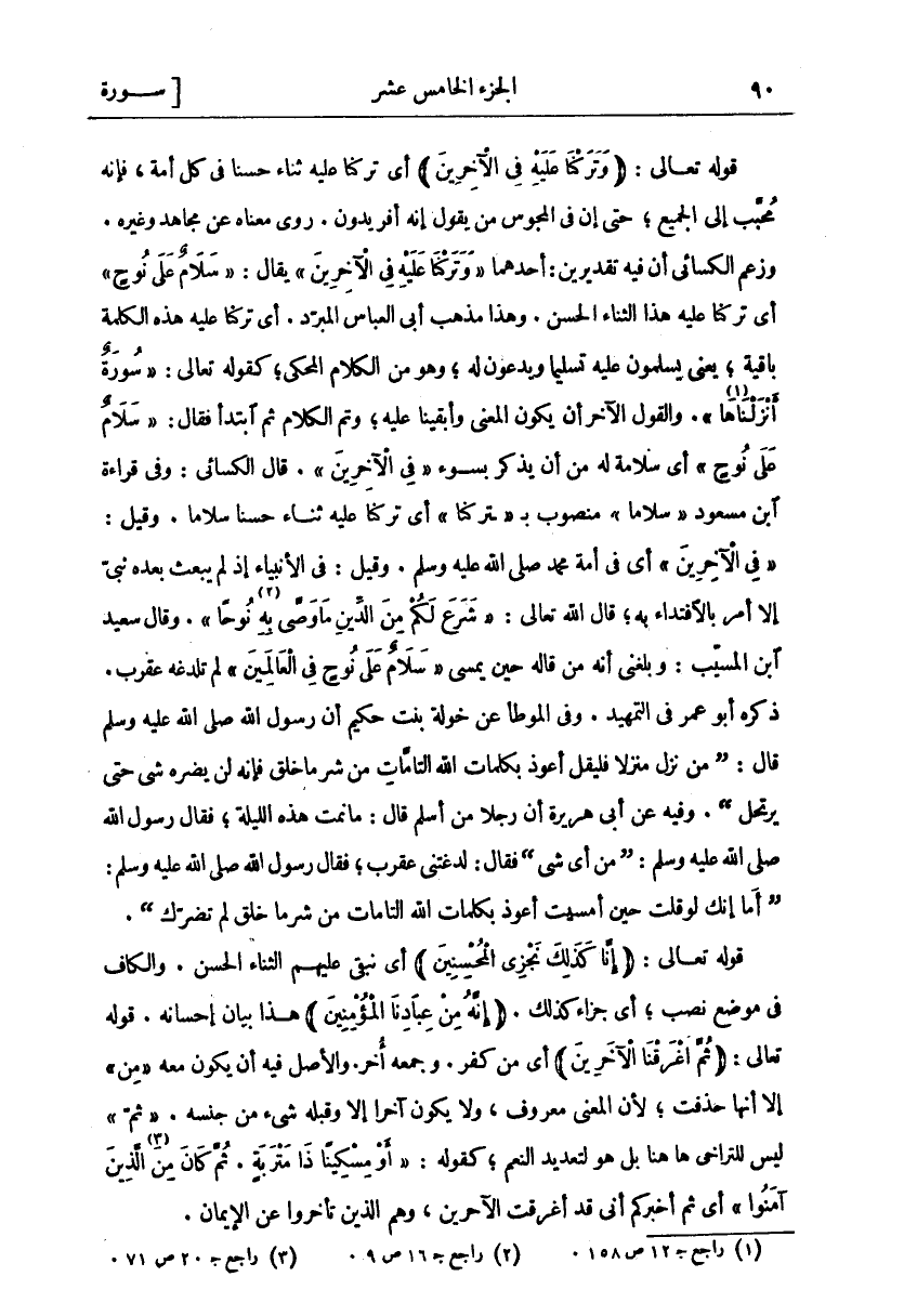 قَوْلُهُ تَعَالَى:" وَتَرَكْنا عَلَيْهِ فِي الْآخِرِينَ" أَيْ تَرَكْنَا عَلَيْهِ ثَنَاءً حَسَنًا فِي كُلِّ أُمَّةٍ، فَإِنَّهُ مُحَبَّبٌ إِلَى الْجَمِيعِ، حَتَّى إِنَّ فِي الْمَجُوسِ مَنْ يَقُولُ إِنَّهُ أَفْرِيدُونَ. رُوِيَ مَعْنَاهُ عَنْ مُجَاهِدٍ وَغَيْرِهِ. وَزَعَمَ الْكِسَائِيُّ أَنَّ فِيهِ تَقْدِيرَيْنِ: أَحَدُهُمَا" وَتَرَكْنَا عَلَيْهِ فِي الْآخِرِينَ" يُقَالُ:" سَلامٌ عَلى نُوحٍ" أَيْ تَرَكْنَا عَلَيْهِ هَذَا الثَّنَاءَ الْحَسَنَ. وَهَذَا مَذْهَبُ أَبِي الْعَبَّاسِ الْمُبَرِّدُ. أَيْ تَرَكْنَا عَلَيْهِ هَذِهِ الْكَلِمَةَ بَاقِيَةً، يَعْنِي يسلمون له تَسْلِيمًا وَيَدْعُونَ لَهُ، وَهُوَ مِنَ الْكَلَامِ الْمَحْكِيِّ، كقوله تعالى:" سُورَةٌ أَنْزَلْناها". [النور: ١]. وَالْقَوْلُ الْآخَرُ أَنْ يَكُونَ الْمَعْنَى وَأَبْقَيْنَا عَلَيْهِ، وَتَمَّ الْكَلَامُ ثُمَّ ابْتَدَأَ فَقَالَ:" سَلامٌ عَلى نُوحٍ" أَيْ سَلَامَةٌ لَهُ مِنْ أَنْ يُذْكَرَ بِسُوءٍ" فِي الْآخِرِينَ". قَالَ الْكِسَائِيُّ: وَفِي قِرَاءَةِ ابْنِ مَسْعُودٍ" سَلَامًا" مَنْصُوبٌ بِ" تَرَكْنا" أَيْ تَرَكْنَا عَلَيْهِ ثَنَاءً حَسَنًا سَلَامًا. وَقِيلَ:" فِي آخرين" أَيْ فِي أُمَّةِ مُحَمَّدٍ صَلَّى اللَّهُ عَلَيْهِ وَسَلَّمَ. وَقِيلَ: فِي الْأَنْبِيَاءِ إِذْ لَمْ يُبْعَثْ بَعْدَهُ نَبِيٌّ إِلَّا أُمِرَ بِالِاقْتِدَاءِ بِهِ، قَالَ اللَّهُ تَعَالَى:" شَرَعَ لَكُمْ مِنَ الدِّينِ مَا وَصَّى بِهِ نُوحاً" [الشورى: ١٣]. وَقَالَ سَعِيدُ بْنُ الْمُسَيَّبِ: وَبَلَغَنِي أَنَّهُ مَنْ قال حين يسمي" سَلامٌ عَلى نُوحٍ فِي الْعالَمِينَ" لَمْ تَلْدَغْهُ عَقْرَبٌ. ذَكَرَهُ أَبُو عُمَرَ فِي التَّمْهِيدِ. وَفِي الْمُوَطَّأِ عَنْ خَوْلَةَ بِنْتِ حَكِيمٍ أَنَّ رَسُولَ الله صَلَّى اللَّهُ عَلَيْهِ وَسَلَّمَ قال:" من نَزَلَ مَنْزِلًا فَلْيَقُلْ أَعُوَذٌ بِكَلِمَاتِ اللَّهِ التَّامَّاتِ مِنْ شَرٍّ مَا خَلَقَ فَإِنَّهُ لَنْ يَضُرَّهُ شي حَتَّى يَرْتَحِلَ" وَفِيهِ عَنْ أَبِي هُرَيْرَةَ أَنَّ رَجُلًا مِنْ أَسْلَمَ قَالَ: مَا نِمْتُ هَذِهِ الليلة، فقال وسول اللَّهِ صَلَّى اللَّهُ عَلَيْهِ وَسَلَّمَ:" مِنْ أَيِّ شي" فَقَالَ: لَدَغَتْنِي عَقْرَبٌ، فَقَالَ رَسُولُ اللَّهِ صَلَّى اللَّهُ عَلَيْهِ وَسَلَّمَ:" أَمَا إِنَّكَ لَوْ قُلْتَ حِينَ أَمْسَيْتَ أَعُوذُ بِكَلِمَاتِ اللَّهِ التَّامَّاتِ مِنْ شَرِّ مَا خَلَقَ لَمْ تَضُرَّكَ". قَوْلُهُ تَعَالَى:" إِنَّا كَذلِكَ نَجْزِي الْمُحْسِنِينَ" أَيْ نُبْقِي عَلَيْهِمُ الثَّنَاءَ الْحَسَنَ. وَالْكَافُ فِي مَوْضِعِ نَصْبٍ، أَيْ جَزَاءً كَذَلِكَ." إِنَّهُ مِنْ عِبادِنَا الْمُؤْمِنِينَ" هَذَا بَيَانُ إِحْسَانِهِ. قَوْلُهُ تَعَالَى:" ثُمَّ أَغْرَقْنَا الْآخَرِينَ" أَيْ مَنْ كَفَرَ. وَجَمْعُهُ أُخَرُ. وَالْأَصْلُ فِيهِ أَنْ يَكُونَ مَعَهُ" مِنْ" إِلَّا أَنَّهَا حُذِفَتْ، لِأَنَّ الْمَعْنَى مَعْرُوفٌ، وَلَا يَكُونُ آخِرًا إِلَّا وقبله شي من جنسه." ثم" ليس للتراخي ها هنا بل هو لتعديد النعم، كقول:" أَوْ مِسْكِيناً ذَا مَتْرَبَةٍ. ثُمَّ كانَ مِنَ الَّذِينَ آمَنُوا" [البلد: ١٧ - ١٦] أَيْ ثُمَّ أُخْبِرُكُمْ أَنِّي قَدْ أَغْرَقْتُ الْآخَرِينَ، وهم الذين تأخروا عن الإيمان.