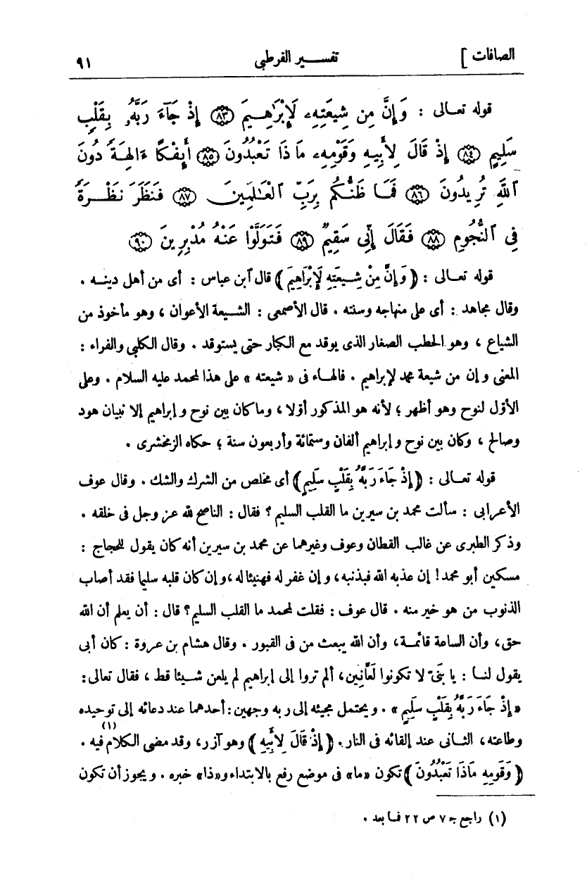 قَوْلُهُ تَعَالَى:" وَإِنَّ مِنْ شِيعَتِهِ لَإِبْراهِيمَ" قَالَ ابْنُ عَبَّاسٍ: أَيْ مِنْ أَهْلِ دِينِهِ. وَقَالَ مُجَاهِدٌ: أَيْ عَلَى مِنْهَاجِهِ وَسُنَّتِهِ. قَالَ الْأَصْمَعِيُّ: الشِّيعَةُ الْأَعْوَانُ، وَهُوَ مَأْخُوذٌ مِنَ الشِّيَاعِ، وَهُوَ الْحَطَبُ الصِّغَارُ الَّذِي يوقد مع الكبا ر حَتَّى يُسْتَوْقَدَ. وَقَالَ الْكَلْبِيُّ وَالْفَرَّاءُ: الْمَعْنَى وَإِنَّ مِنْ شِيعَةِ مُحَمَّدٍ لَإِبْرَاهِيمَ. فَالْهَاءُ فِي" شِيعَتِهِ" عَلَى هَذَا لِمُحَمَّدٍ عَلَيْهِ السَّلَامُ. وَعَلَى الْأَوَّلِ لِنُوحٍ وَهُوَ أَظْهَرُ، لِأَنَّهُ هُوَ الْمَذْكُورُ أَوَّلًا، وَمَا كَانَ بَيْنَ نُوحٍ وَإِبْرَاهِيمَ إِلَّا نَبِيَّانِ هُودٌ وَصَالِحٌ، وَكَانَ بَيْنَ نُوحٍ وَإِبْرَاهِيمَ أَلْفَانِ وَسِتُّمِائَةٍ وَأَرْبَعُونَ سَنَةً، حَكَاهُ الزَّمَخْشَرِيُّ. قَوْلُهُ تَعَالَى:" إِذْ جاءَ رَبَّهُ بِقَلْبٍ سَلِيمٍ" أَيْ مُخْلِصٍ مِنَ الشِّرْكِ وَالشَّكِّ. وَقَالَ عَوْفٌ الْأَعْرَابِيُّ: سَأَلْتُ مُحَمَّدَ بْنَ سِيرِينَ مَا الْقَلْبُ السَّلِيمُ؟ فَقَالَ: النَّاصِحُ لِلَّهِ عَزَّ وَجَلَّ فِي خَلْقِهِ. وَذَكَرَ الطَّبَرِيُّ عَنْ غَالِبٍ الْقَطَّانِ وَعَوْفٍ وَغَيْرِهِمَا عَنْ مُحَمَّدِ بْنِ سِيرِينَ أَنَّهُ كَانَ يَقُولُ لِلْحَجَّاجِ: مِسْكِينٌ أَبُو مُحَمَّدٍ! إِنْ عَذَّبَهُ اللَّهُ فَبِذَنْبِهِ، وَإِنْ غَفَرَ لَهُ فَهَنِيئًا لَهُ، وَإِنْ كَانَ قَلْبُهُ سَلِيمًا فَقَدْ أَصَابَ الذُّنُوبَ مَنْ هُوَ خَيْرٌ مِنْهُ. قَالَ عَوْفٌ: فَقُلْتُ لِمُحَمَّدٍ مَا الْقَلْبُ السَّلِيمُ؟ قَالَ: أَنْ يَعْلَمَ أَنَّ اللَّهَ حَقٌّ، وَأَنَّ السَّاعَةَ قَائِمَةٌ، وَأَنَّ اللَّهَ يَبْعَثُ مَنْ فِي الْقُبُورِ. وَقَالَ هِشَامُ بْنُ عُرْوَةَ: كَانَ أَبِي يَقُولُ لَنَا: يَا بَنِيَّ لَا تَكُونُوا لَعَّانِينَ، أَلَمْ تَرَوْا إِلَى إِبْرَاهِيمَ لَمْ يَلْعَنْ شَيْئًا قَطُّ، فَقَالَ تَعَالَى:" إِذْ جاءَ رَبَّهُ بِقَلْبٍ سَلِيمٍ". وَيَحْتَمِلُ مَجِيئُهُ إِلَى رَبِّهِ وَجْهَيْنِ: أَحَدُهُمَا عِنْدَ دُعَائِهِ إِلَى تَوْحِيدِهِ وَطَاعَتِهِ، الثَّانِي عِنْدَ إِلْقَائِهِ فِي النَّارِ." إِذْ قالَ لِأَبِيهِ" وَهُوَ آزَرُ، وَقَدْ مَضَى الْكَلَامُ «١» فِيهِ." وَقَوْمِهِ مَاذَا تَعْبُدُونَ" تَكُونُ" مَا" فِي مَوْضِعِ رَفْعٍ بِالِابْتِدَاءِ وَ" ذَا" خَبَرَهُ وَيَجُوزُ أَنْ تكون