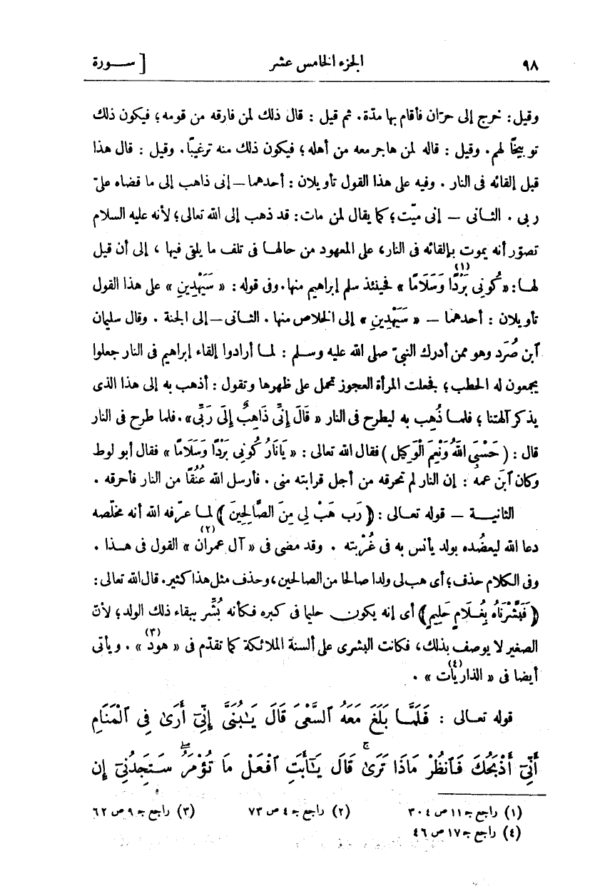 وَقِيلَ: خَرَجَ إِلَى حَرَّانَ فَأَقَامَ بِهَا مُدَّةً. ثُمَّ قِيلَ: قَالَ ذَلِكَ لِمَنْ فَارَقَهُ مِنْ قَوْمِهِ، فَيَكُونُ ذَلِكَ تَوْبِيخًا لَهُمْ. وَقِيلَ: قَالَهُ لِمَنْ هَاجَرَ مَعَهُ مِنْ أَهْلِهِ، فَيَكُونُ ذَلِكَ مِنْهُ تَرْغِيبًا. وَقِيلَ: قَالَ هَذَا قَبْلَ إِلْقَائِهِ فِي النَّارِ. وَفِيهِ عَلَى هَذَا الْقَوْلِ تَأْوِيلَانِ: أَحَدُهُمَا: إِنِّي ذَاهِبٌ إِلَى مَا قَضَاهُ عَلَيَّ رَبِّي. الثَّانِي: إِنِّي مَيِّتٌ، كَمَا يُقَالُ لِمَنْ مَاتَ: قَدْ ذَهَبَ إِلَى اللَّهِ تَعَالَى، لِأَنَّهُ عَلَيْهِ السَّلَامُ تَصَوَّرَ أَنَّهُ يَمُوتُ بِإِلْقَائِهِ فِي النَّارِ، عَلَى الْمَعْهُودِ مِنْ حَالِهَا فِي تَلَفِ مَا يُلْقَى فِيهَا، إِلَى أَنْ قِيلَ لَهَا:" كُونِي بَرْداً وَسَلاماً" فَحِينَئِذٍ سَلِمَ إِبْرَاهِيمُ مِنْهَا. وَفِي قَوْلِهِ:" سَيَهْدِينِ" عَلَى هَذَا الْقَوْلِ تَأْوِيلَانِ: أَحَدُهُمَا" سَيَهْدِينِ" إِلَى الْخَلَاصِ مِنْهَا. الثَّانِي- إِلَى الجنة. وقال سليمان ابن صُرَدَ وَهُوَ مِمَّنْ أَدْرَكَ النَّبِيَّ صَلَّى اللَّهُ عَلَيْهِ وَسَلَّمَ: لَمَّا أَرَادُوا إِلْقَاءَ إِبْرَاهِيمَ فِي النَّارِ جَعَلُوا يَجْمَعُونَ لَهُ الْحَطَبَ، فَجَعَلَتِ الْمَرْأَةُ الْعَجُوزُ تَحْمِلُ عَلَى ظَهْرِهَا وَتَقُولُ: أَذْهَبُ بِهِ إِلَى هَذَا الَّذِي يَذْكُرُ آلِهَتَنَا، فَلَمَّا ذُهِبَ بِهِ لِيُطْرَحَ فِي النَّارِ" قالَ إِنِّي ذاهِبٌ إِلى رَبِّي". فَلَمَّا طُرِحَ فِي النَّارِ قَالَ: (حَسْبِيَ اللَّهُ وَنِعْمَ الْوَكِيلُ) فَقَالَ اللَّهُ تَعَالَى:" يا نارُ كُونِي بَرْداً وَسَلاماً" [الأنبياء: ٩ ٦] فَقَالَ أَبُو لُوطٍ وَكَانَ ابْنَ عَمِّهِ: إِنَّ النَّارَ لَمْ تُحْرِقْهُ مِنْ أَجْلِ قَرَابَتِهِ مِنِّي. فَأَرْسَلَ اللَّهُ عُنُقًا مِنَ النَّارِ فَأَحْرَقَهُ. الثَّانِيَةُ- قَوْلُهُ تَعَالَى:" رَبِّ هَبْ لِي مِنَ الصَّالِحِينَ" لَمَّا عَرَّفَهُ اللَّهُ أَنَّهُ مُخَلِّصُهُ دَعَا اللَّهَ لِيُعَضِّدَهُ بِوَلَدٍ يَأْنَسُ بِهِ فِي غُرْبَتِهِ. وَقَدْ مَضَى فِي [آلِ عِمْرَانَ «١»] الْقَوْلُ فِي هَذَا. وَفِي الْكَلَامِ حَذْفٌ، أَيْ هَبْ لِي وَلَدًا صَالِحًا مِنَ الصَّالِحِينَ، وَحَذْفُ مِثْلِ هَذَا كَثِيرٌ. قال الله تعالى:" فَبَشَّرْناهُ بِغُلامٍ حَلِيمٍ" أَيْ إِنَّهُ يَكُونُ حَلِيمًا فِي كِبَرِهِ فَكَأَنَّهُ بُشِّرَ بِبَقَاءِ ذَلِكَ الْوَلَدِ، لِأَنَّ الصَّغِيرَ لَا يُوصَفُ بِذَلِكَ، فَكَانَتِ الْبُشْرَى عَلَى أَلْسِنَةِ الْمَلَائِكَةِ كَمَا تَقَدَّمَ فِي [هُودٍ «٢»]. ويأتي أيضا في [الذاريات «٣»].