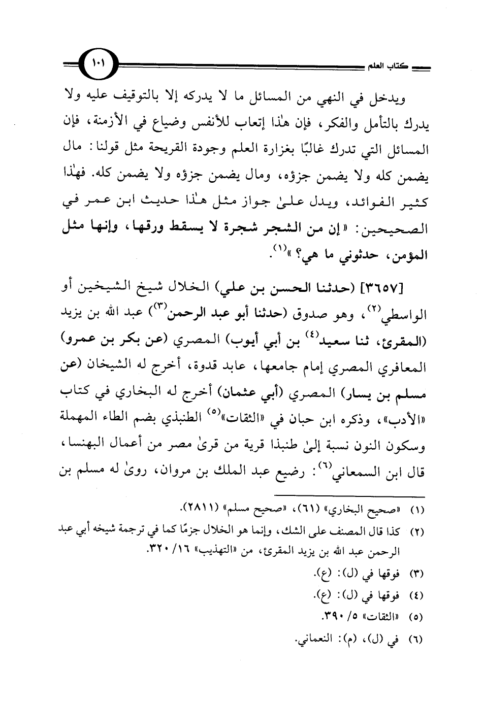 [3657] (حَدَّثَنَا الحسن بن علي) الخلال شيخ الشيخين أو الواسطي (¬2)، وهو صدوق (حَدَّثَنَا أبو عبد الرحمن) (¬3) عبد الله بن يزيد (المقرئ، ثنا سعيد (¬4) بن أبي أيوب) المصري (عن بكر بن عمرو) المعافري المصري إمام جامعها، عابد قدوة، أخرج له الشيخان (عن مسلم بن يسار) المصري (أبي عثمان) أخرج له البخاري في كتاب "الأدب"، وذكره ابن حبان في "الثقات" (¬5) الطنبذي بضم الطاء المهملة وسكون النون نسبة إلى طنبذا قرية من قرى مصر من أعمال البهنسا، قال ابن السمعاني (¬6): رضيع عبد الملك بن مروان، روى له مسلم بن