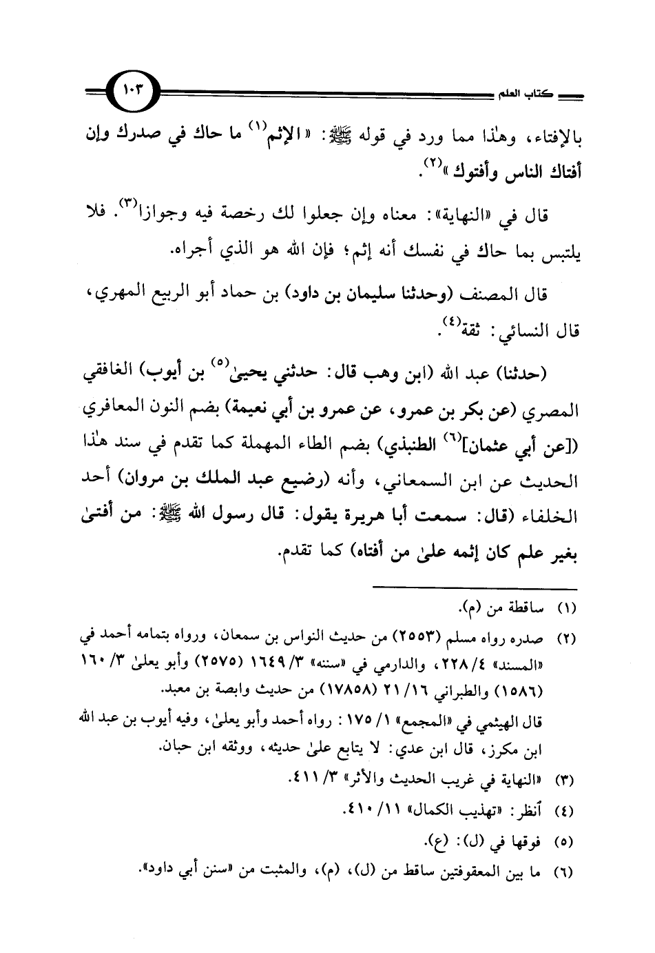 (حَدَّثَنَا) عبد الله (ابن وهب قال: حدثني يحيى (¬5) بن أيوب) الغافقي المصري (عن بكر بن عمرو، عن عمرو بن أبي نعيمة) بضم النون المعافري ([عن أبي عثمان] (¬6) الطنبذي) بضم الطاء المهملة كما تقدم في سند هذا الحديث عن ابن السمعاني، وأنه (رضيع عبد الملك بن مروان) أحد الخلفاء (قال: سمعت أبا هريرة يقول: قال رسول الله - صلى الله عليه وسلم -: من أفتى بغير علم كان إثمه على من أفتاه) كما تقدم.