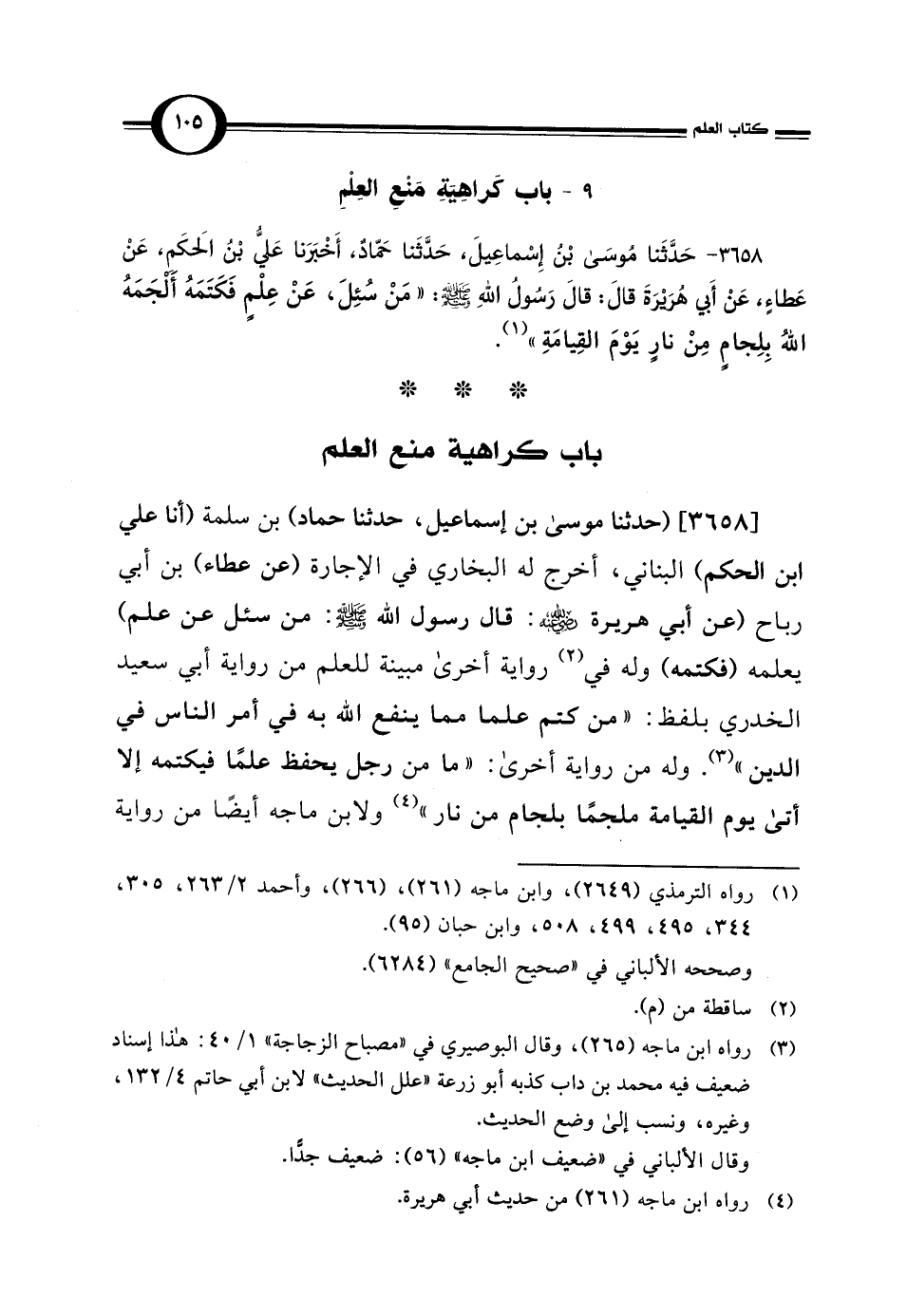 3658 - حَدَّثَنَا مُوسَى بْن إِسْماعِيلَ، حَدَّثَنَا حَمَّادُ، أَخْبَرَنَا عَليُّ بْن الحَكَم، عَنْ عَطَاءٌ، عَنْ أَبي هُرَيْرَةَ قالَ: قالَ رَسُول اللهِ - صلى الله عليه وسلم -: "مَنْ سُئِلَ، عَنْ عِلْمٍ فَكَتَمَهُ أَلْجَمَهُ اللهُ بِلِجامٍ مِنْ نارٍ يَوْمَ القِيامَةِ" (¬1).