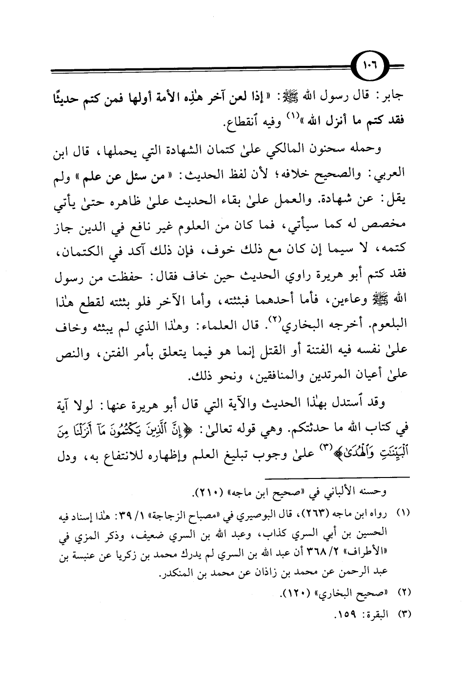 وقد استدل بهذا الحديث والآية التي قال أبو هريرة عنها: لولا آية في كتاب الله ما حدثتكم. وهي قوله تعالى: {إِنَّ الَّذِينَ يَكْتُمُونَ مَا أَنْزَلْنَا مِنَ الْبَيِّنَاتِ وَالْهُدَى} (¬3) على وجوب تبليغ العلم وإظهاره للانتفاع به، ودل