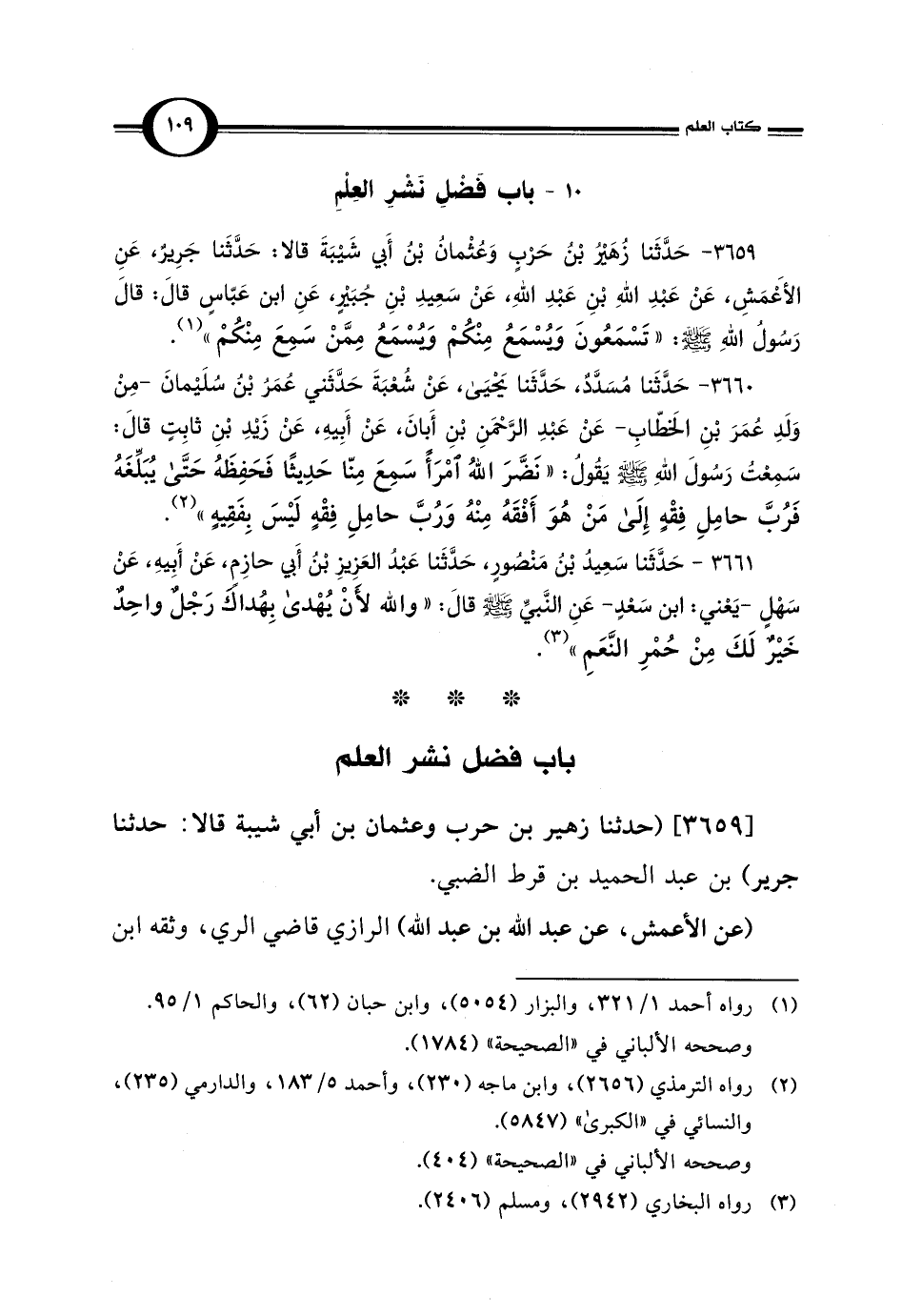 [3659] (حَدَّثَنَا زهير بن حرب وعثمان بن أبي شيبة قالا: حَدَّثَنَا جرير) بن عبد الحميد بن قرط الضبي.