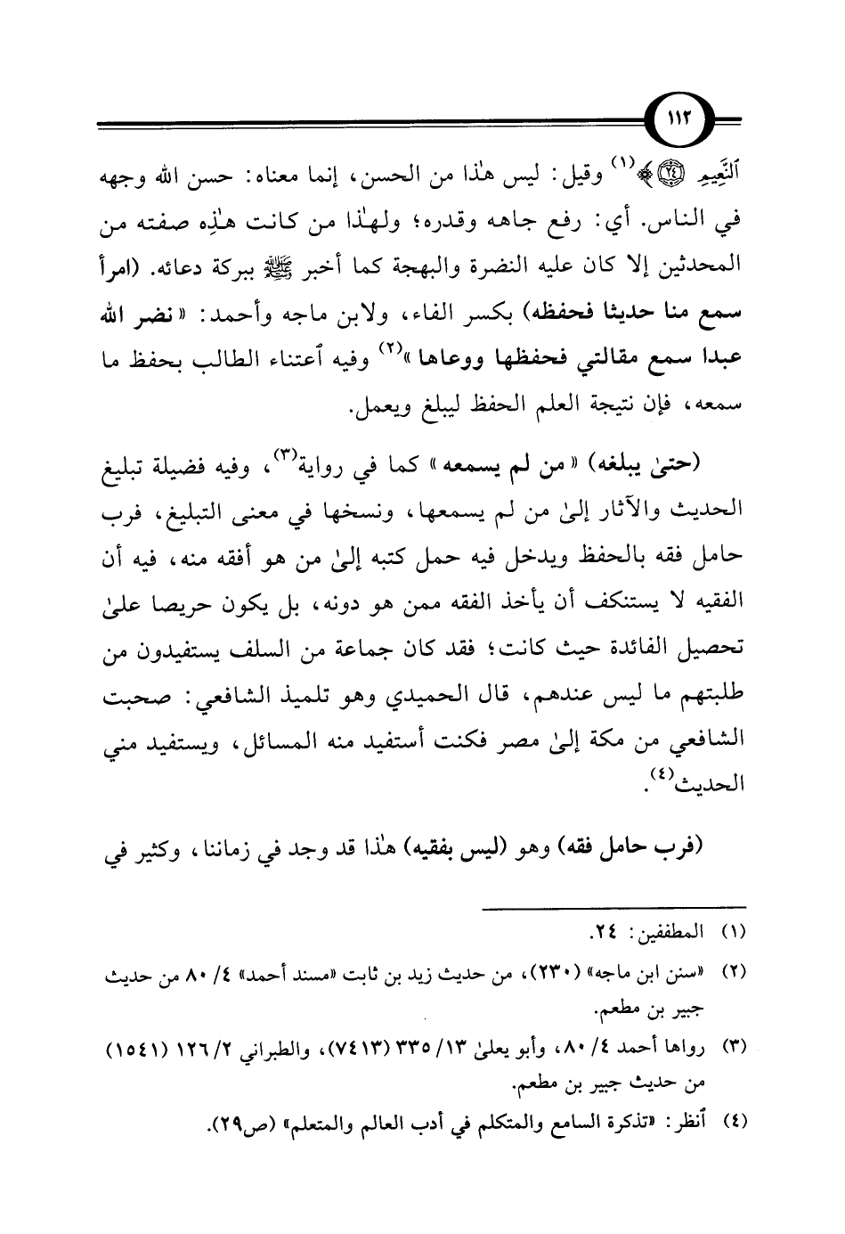 النَّعِيمِ} (¬1) وقيل: ليس هذا من الحسن، إنما معناه: حسن الله وجهه في الناس. أي: رفع جاهه وقدره؛ ولهذا من كانت هذِه صفته من المحدثين إلا كان عليه النضرة والبهجة كما أخبر - صلى الله عليه وسلم - ببركة دعائه. (امرأ سمع منا حديثا فحفظه) بكسر الفاء، ولابن ماجة وأحمد: "نضر الله عبدا سمع مقالتي فحفظها ووعاها" (¬2) وفيه اعتناء الطالب بحفظ ما سمعه، فإن نتيجة العلم الحفظ ليبلغ ويعمل.