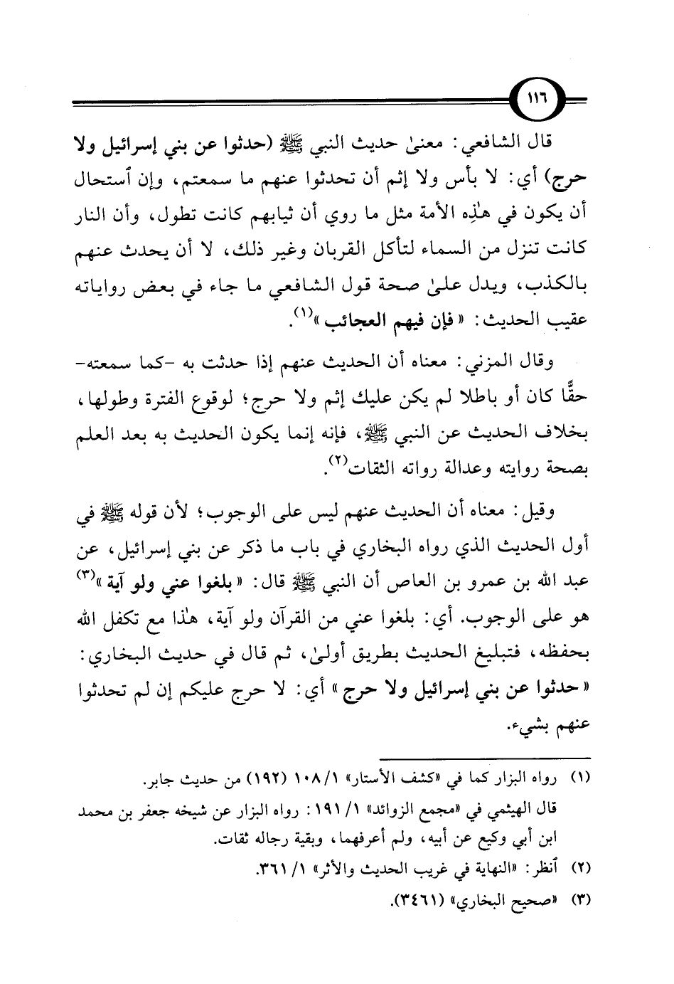قال الشافعي: معنى حديث النبي - صلى الله عليه وسلم - (حدثوا عن بني إسرائيل ولا حرج) أي: لا بأس ولا إثم أن تحدثوا عنهم ما سمعتم، وإن استحال أن يكون في هذِه الأمة مثل ما روي أن ثيابهم كانت تطول، وأن النار كانت تنزل من السماء لتأكل القربان وغير ذلك، لا أن يحدث عنهم بالكذب، ويدل على صحة قول الشافعي ما جاء في بعض رواياته عقيب الحديث: "فإن فيهم العجائب" (¬1).