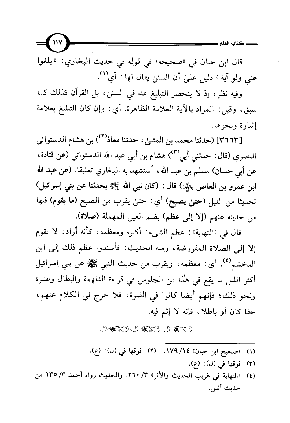 [3663] (حدثنا محمَّد بن المثنى، حدثنا معاذ) (¬2) بن هشام الدستوائي البصري (قال: حدثني أبي) (¬3) هشام بن أبي عبد الله الدستوائي (عن قتادة، عن أبي حسان) مسلم بن عبد الله، استشهد به البخاري تعليقا. (عن عبد الله ابن عمرو بن العاص -رضي الله عنهما-) قال: (كان نبي الله - صلى الله عليه وسلم - يحدثنا عن بني إسرائيل) تحديثا من الليل (حتى يصبح) أي: حتى يقرب من الصبح (ما يقوم) فيها من حديثه عنهم (إلا إلى عظم) بضم العين المهملة (صلاة).