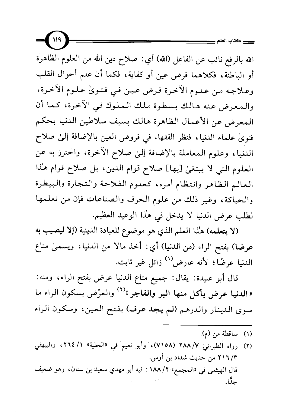 الله بالرفع نائب عن الفاعل (الله) أي: صلاح دين الله من العلوم الظاهرة أو الباطنة، فكلاهما فرض عين أو كفاية، فكما أن علم أحوال القلب وعلاجه من علوم الآخرة فرض عين في فتوى علوم الآخرة، والمعرض عنه هالك بسطوة ملك الملوك في الآخرة، كما أن المعرض عن الأعمال الظاهرة هالك بسيف سلاطين الدنيا بحكم فتوى علماء الدنيا، فنظر الفقهاء في فروض العين بالإضافة إلى صلاح الدنيا، وعلوم المعاملة بالإضافة إلى صلاح الآخرة، واحترز به عن العلوم التي لا يبتغى [بها] صلاح قوام الدين، بل صلاح قوام هذا العالم الظاهر وانتظام أمره، كعلوم الفلاحة والتجارة والبيطرة والحياكة، وغير ذلك من علوم الحرف والصناعات فإن من تعلمها لطلب عرض الدنيا لا يدخل في هذا الوعيد العظيم.