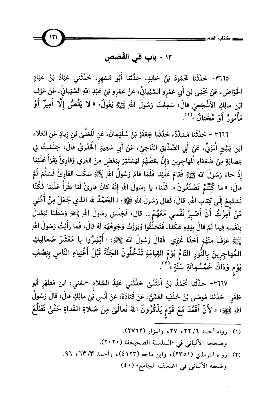 3666 - حَدَّثَنا مُسَدَّدٌ، حَدَّثَنا جَعْفَرُ بْنُ سُلَيْمانَ، عَنِ المُعَلَّى بْنِ زِيادٍ عَنِ العَلاءِ ابْنِ بَشِيرٍ المُزَنيِّ، عَنْ أَبي الصِّدِّيقِ النّاجيِّ، عَنْ أَبي سَعِيدٍ الخُدْريِّ قَالَ: جَلَسْتُ في عِصابَةِ مِنْ ضُعَفاءِ المُهاجِرِينَ وَإِنَّ بَعْضَهُمْ لَيَسْتَتِرُ بِبَعْضٍ مِنَ العُري وَقارِئٌ يَقْرَأُ عَلَيْنا إِذْ جاءَ رَسُولُ اللهِ - صلى الله عليه وسلم - فَقامَ عَلَيْنا فَلَمّا قامَ رَسُولُ اللهِ - صلى الله عليه وسلم - سَكَتَ القارِئُ فَسَلَّمَ ثُمَّ قَالَ: "ما كُنْتُمْ تَصْنَعُونَ". قُلْنا: يا رَسُولَ اللهِ إِنَّهُ كانَ قارِئٌ لَنا يَقْرَأُ عَلَيْنا فَكُنّا نَسْتَمِعُ إِلَى كِتابِ اللهِ. قَالَ: فَقالَ رَسُولُ اللهِ - صلى الله عليه وسلم -: "الحَمْدُ لله الذي جَعَلَ مِنْ أُمَّتي مَنْ أُمِرْتُ أَنْ أَصْبِرَ نَفْسي مَعَهُمْ". قَالَ: فَجَلَسَ رَسُولُ اللهِ - صلى الله عليه وسلم - وَسَطَنا لِيَعْدِلَ بِنَفْسِهِ فِينا ثُمَّ قَالَ بِيَدِهِ هَكَذا، فَتَحَلَّقُوا وَبَرَزَتْ وُجُوهُهُمْ لَهُ قَالَ: فَما رَأَيْتُ رَسُولَ اللهِ - صلى الله عليه وسلم - عَرَفَ مِنْهُمْ أَحَدًا غَيْرِي. فَقالَ رَسُولُ اللهِ - صلى الله عليه وسلم -: "أَبْشِرُوا يا مَعْشَرَ صَعالِيكِ المُهاجِرِينَ بِالنُّورِ التّامِّ يَوْمَ القِيامَةِ تَدْخُلُونَ الجَنَّةَ قَبْلَ أَغْنِياءِ النّاسِ بِنِصْفِ يَوْمٍ وَذاكَ خَمْسُمِائَةِ سَنَةٍ" (¬2).