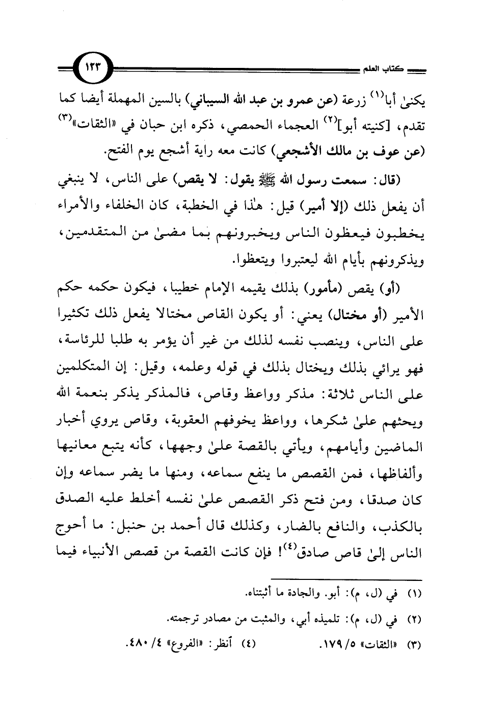 (أو) يقص (مأمور) بذلك يقيمه الإمام خطيبا، فيكون حكمه حكم الأمير (أو مختال) يعني: أو يكون القاص مختالا يفعل ذلك تكثيرا على الناس، وينصب نفسه لذلك من غير أن يؤمر به طلبا للرئاسة، فهو يرائي بذلك ويختال بذلك في قوله وعلمه، وقيل: إن المتكلمين على الناس ثلاثة: مذكر وواعظ وقاص، فالمذكر يذكر بنعمة الله ويحثهم على شكرها، وواعظ يخوفهم العقوبة، وقاص يروي أخبار الماضين وأيامهم، ويأتي بالقصة على وجهها، كأنه يتبع معانيها وألفاظها، فمن القصص ما ينفع سماعه، ومنها ما يضر سماعه وإن كان صدقا، ومن فتح ذكر القصص على نفسه أخلط عليه الصدق بالكذب، والنافع بالضار، وكذلك قال أحمد بن حنبل: ما أحوج الناس إلى قاص صادق (¬4)! فإن كانت القصة من قصص الأنبياء فيما