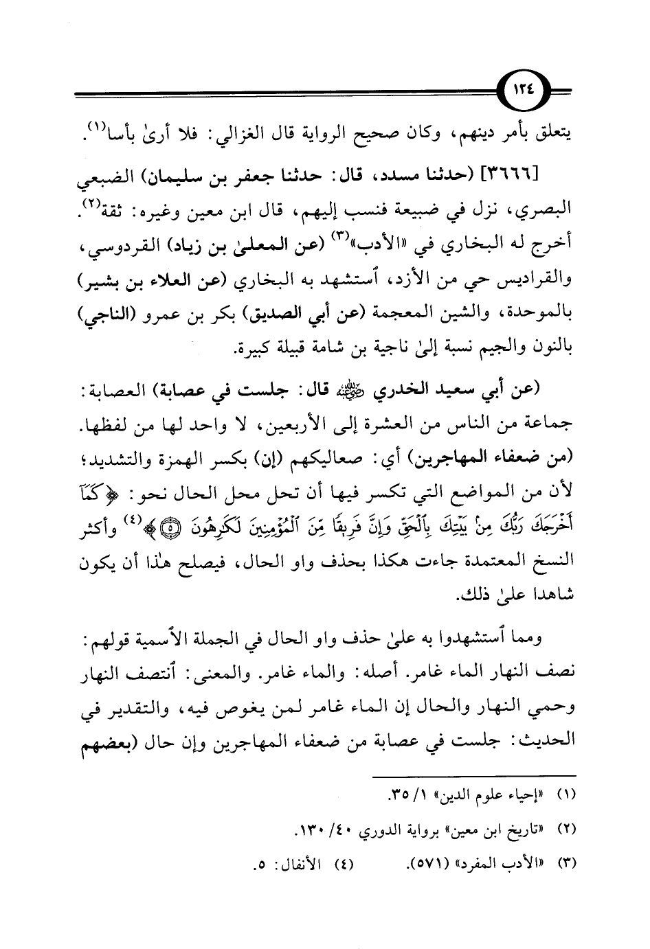 [3666] (حدثنا مسدد، قال: حدثنا جعفر بن سليمان) الضبعي البصري، نزل في ضبيعة فنسب إليهم، قال ابن معين وغيره: ثقة (¬2). أخرج له البخاري في "الأدب" (¬3) (عن المعلي بن زياد) القردوسي، والقراديس حي من الأزد، استشهد به البخاري (عن العلاء بن بشير) بالموحدة، والشين المعجمة (عن أبي الصديق) بكر بن عمرو (الناجي) بالنون والجيم نسبة إلى ناجية بن شامة قبيلة كبيرة.