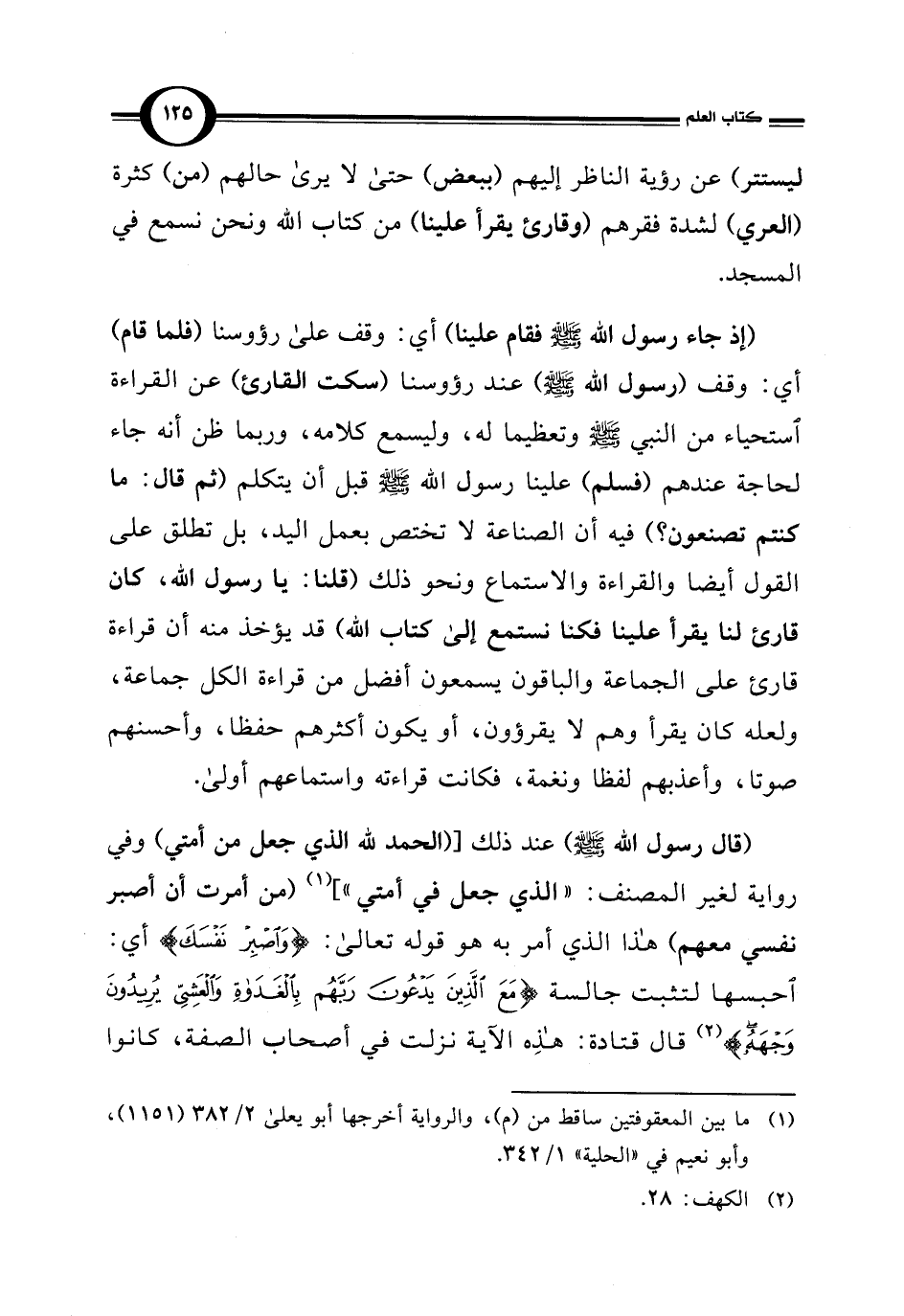 (قال رسول الله - صلى الله عليه وسلم -) عند ذلك [(الحمد لله الذي جعل من أمتي) وفي رواية لغير المصنف: "الذي جعل في أمتي"] (¬1) (من أمرت أن أصبر نفسي معهم) هذا الذي أمر به هو قوله تعالى: {وَاصْبِرْ نَفْسَكَ} أي: احبسها لتثبت جالسة {مَعَ الَّذِينَ يَدْعُونَ رَبَّهُمْ بِالْغَدَاةِ وَالْعَشِيِّ يُرِيدُونَ وَجْهَهُ} (¬2) قال قتادة: هذِه الآية نزلت في أصحاب الصفة، كانوا